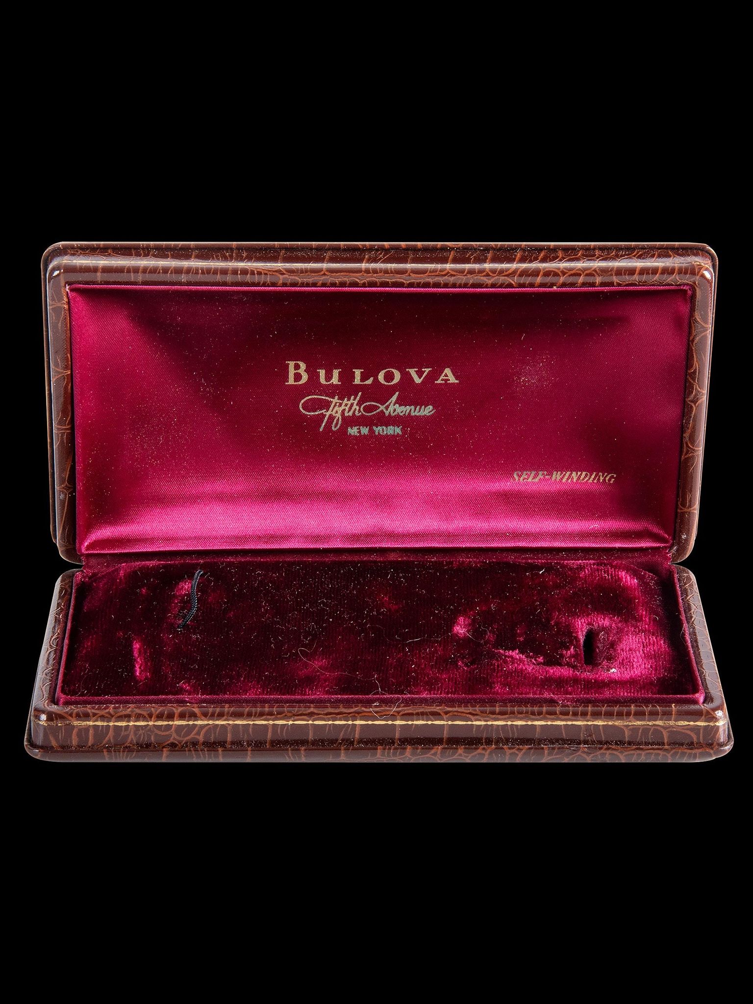 The watch comes with its orignial Bulova coffin-style box. The watch is keeping time, but the service history is unknown. A movement service can be purchased upon request.