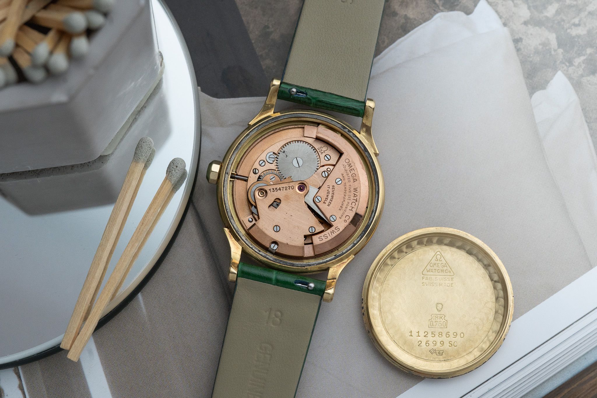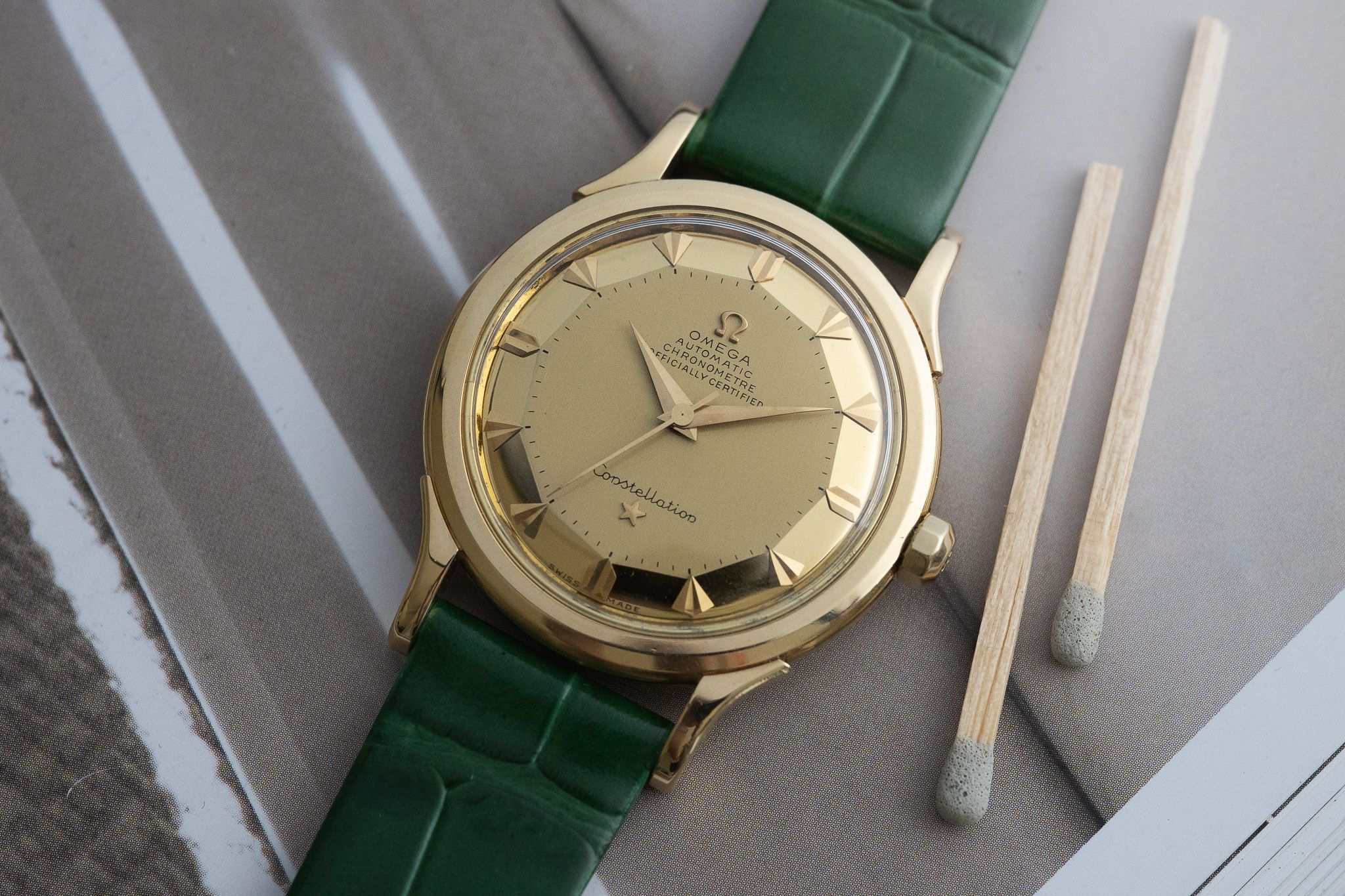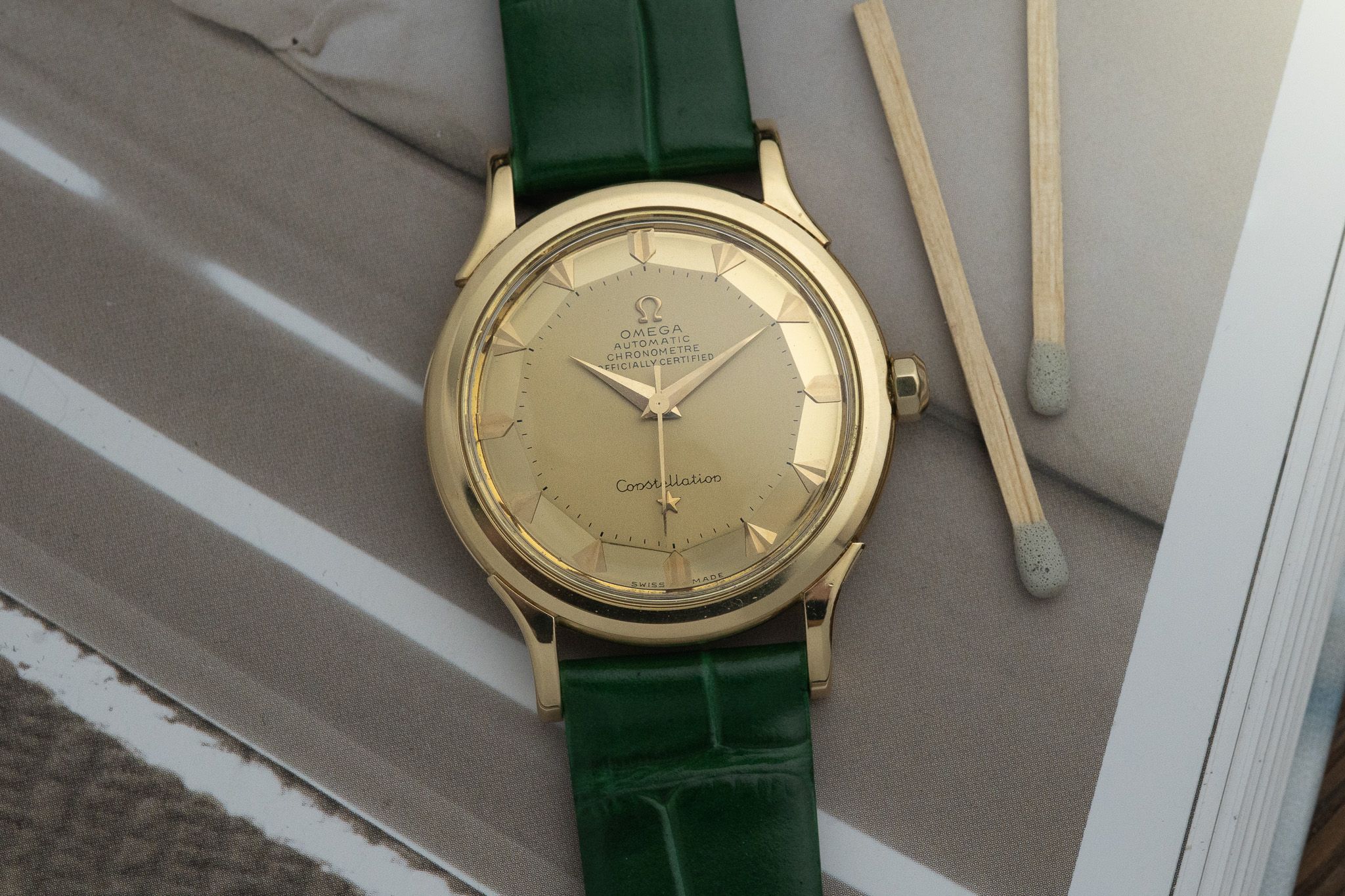 Freshly serviced by our watchmaker, the calibre 354 bumper movement runs reliably and provides a unique tactile experience, with a gentle "bump" felt on the wrist that is full of vintage charm. Paired with a new bespoke green leather band and vintage Omega buckle, the look is both classic and distinctive.