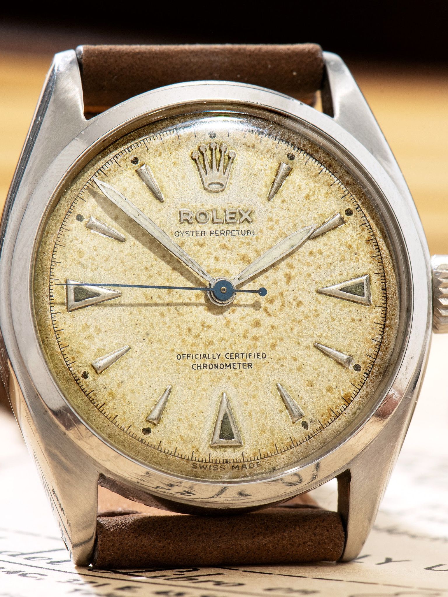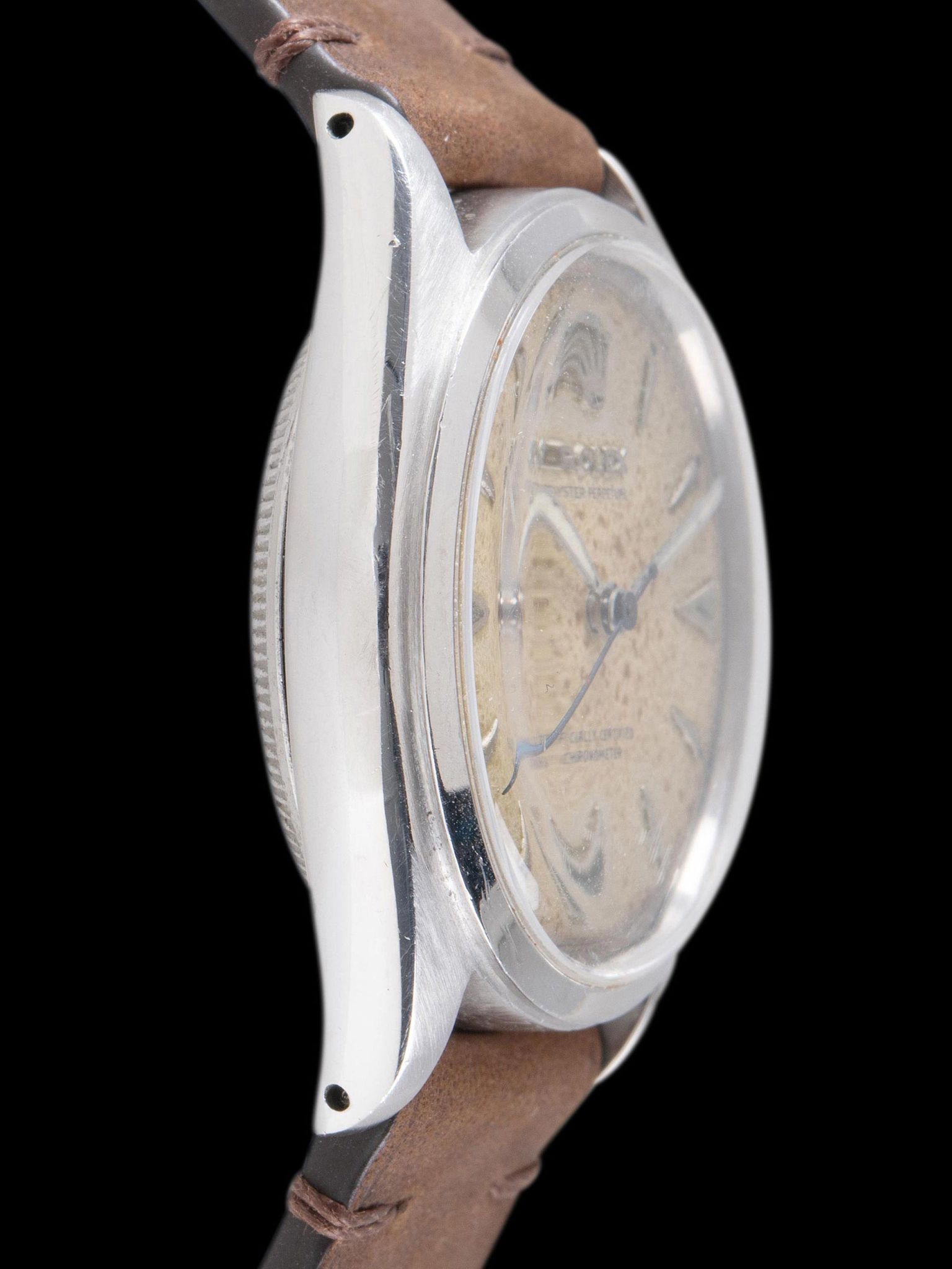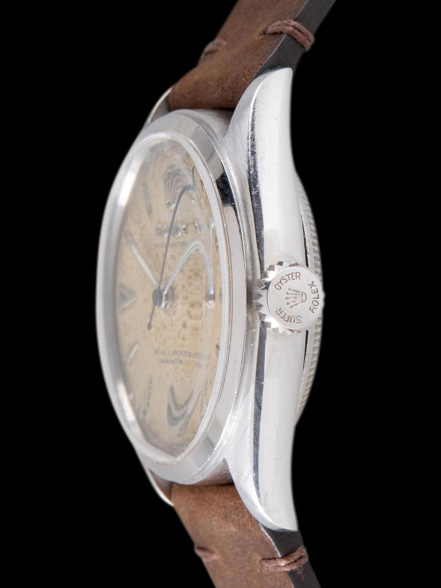 The case features full and symmetrical lugs that show minimal evidence of previous polishing and light wear from use, interestingly the case features lug holes only on the left side of the case, giving the watch a charming vintage appeal. The thin, smooth stainless steel bezel has a handsome aesthetic and shows light signs of use. The case retains its original "Rolex Super Oyster" crown. The bubble case back is in good condition with light signs of use, common for the age of the watch. The watch will come supplied on a 2pc handmade leather strap.