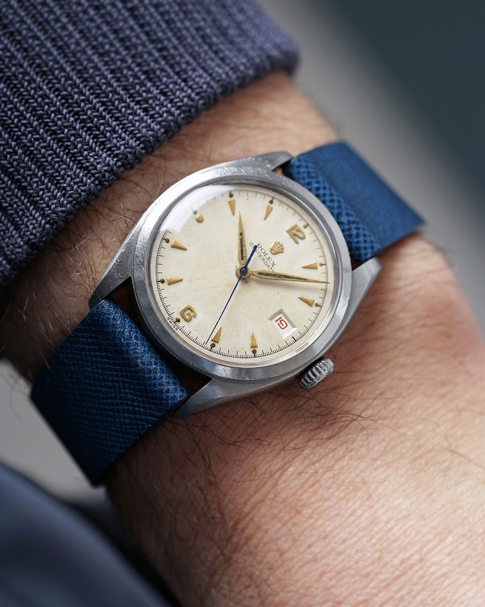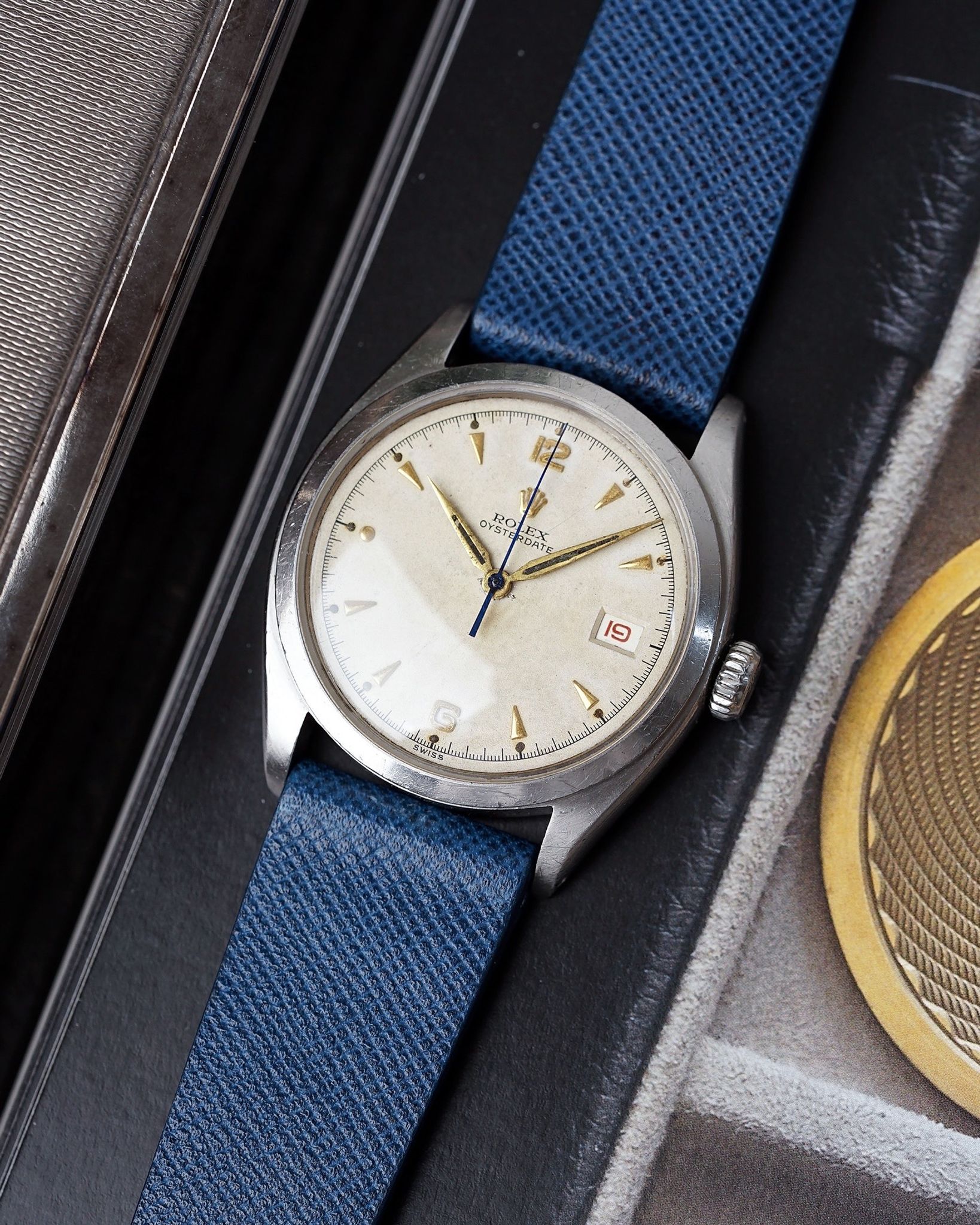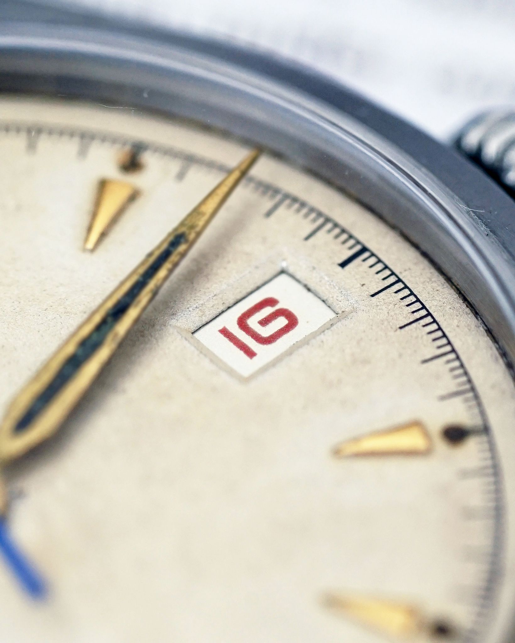 This piece remains in an honest condition, preserving all its lines and contours. The dial has acquired a soft, warm patina that is exceptionally pleasing. Two striking colors stand out: the vibrant blue of the seconds hand and the bold red of the date wheel.