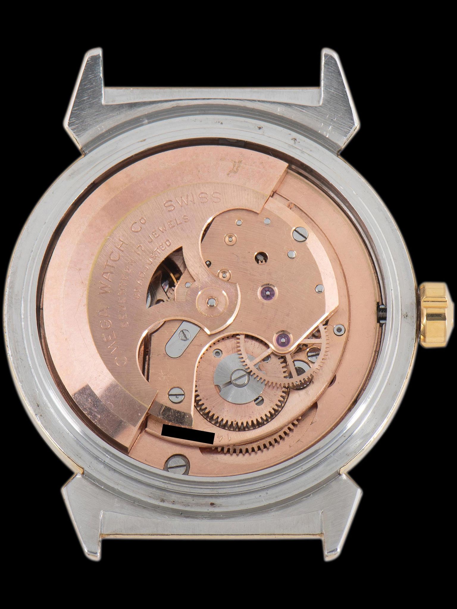 The excellent yellow gold-capped case features fantastic "bullhorn" lugs and shows minor evidence of previous polishing and gentle signs of use. It retains its original yellow gold Omega-signed crown. The caseback shows light signs of wear commensurate with its age, and the Seamaster engraving has lightened over time. The watch will be supplied on a handmade two-piece leather strap.