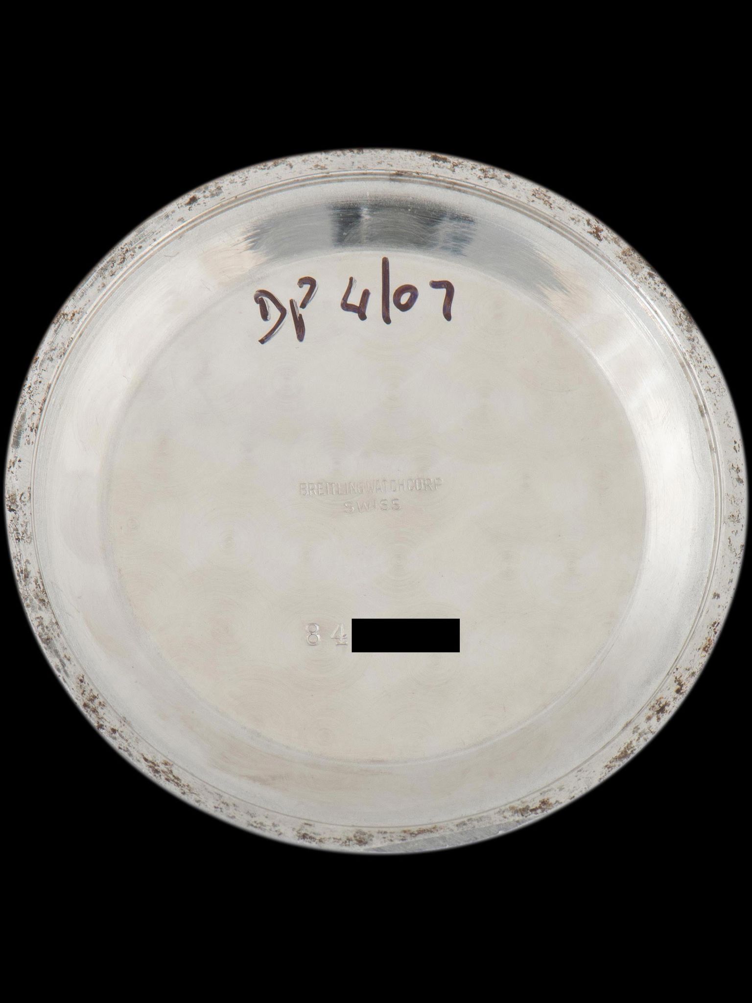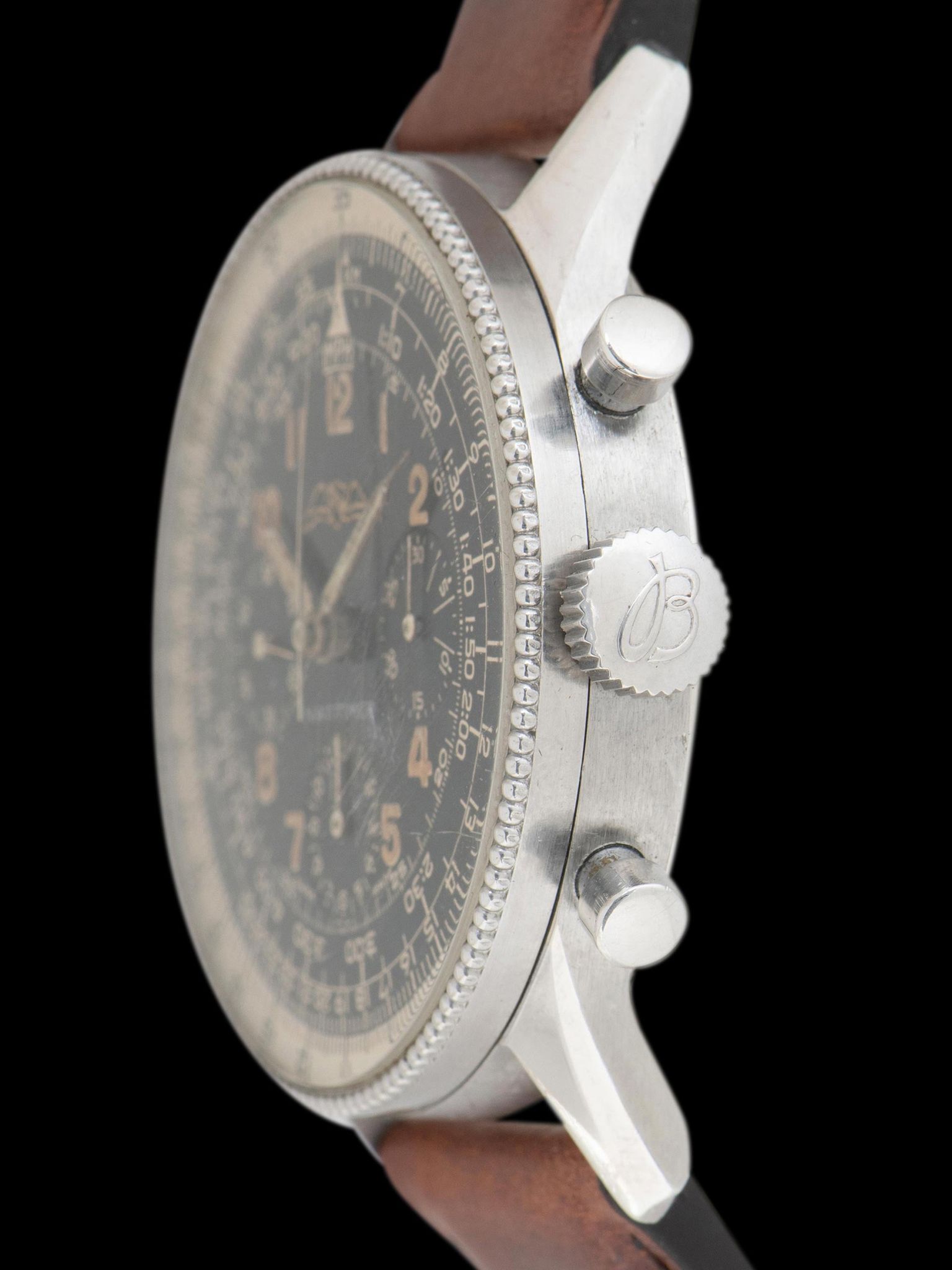 The 41mm case appears to have been lightly polished in the past but still shows sharp case geometry, factory finishing, and very little wear from use. The original beaded bezel is in excellent condition. The "Large B" logo crown and pushers remain original to the watch. The original crystal shows some natural crazing throughout. The case back remains clean showing little signs of wear with reference and logo clearly visible. The watch will come supplied on a two-piece leather strap.