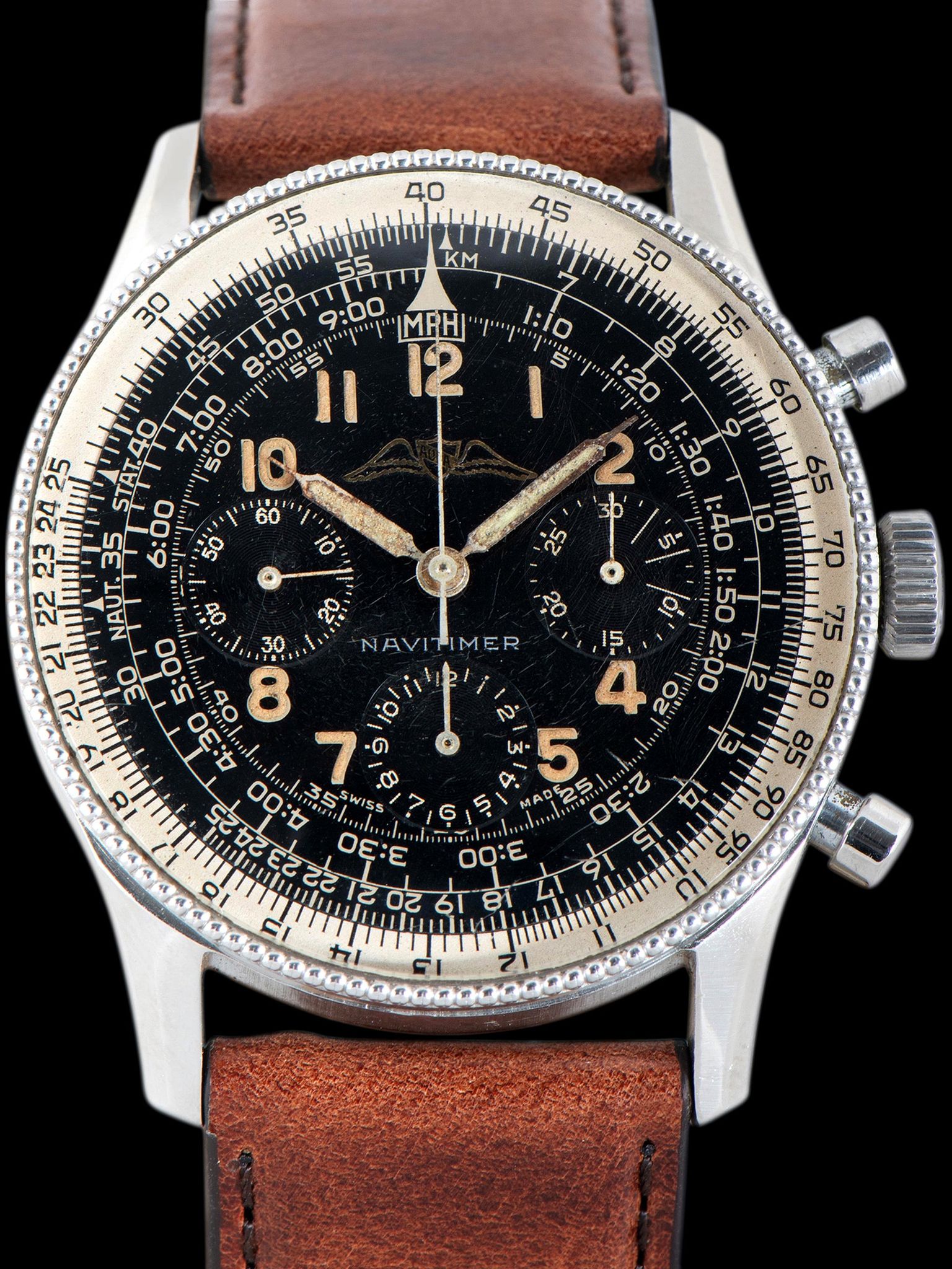 The first Navitimers—like this early model—housed a Valjoux 72 movement and were only available through the AOPA (Aircraft Owner and Pilot Association), meaning super low production numbers and a very rare combination.