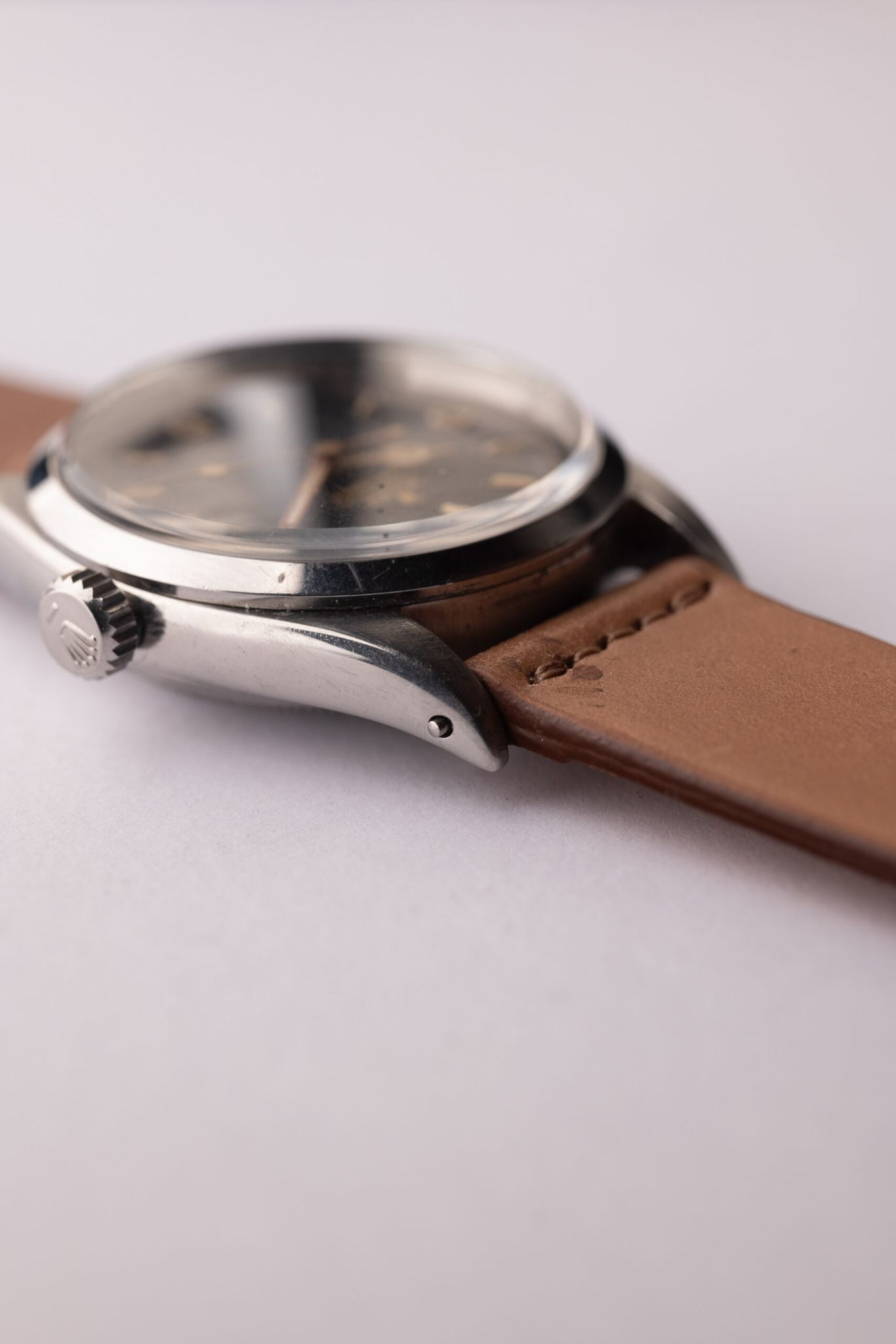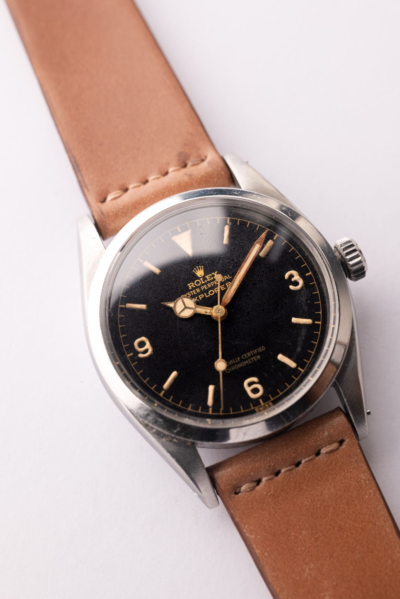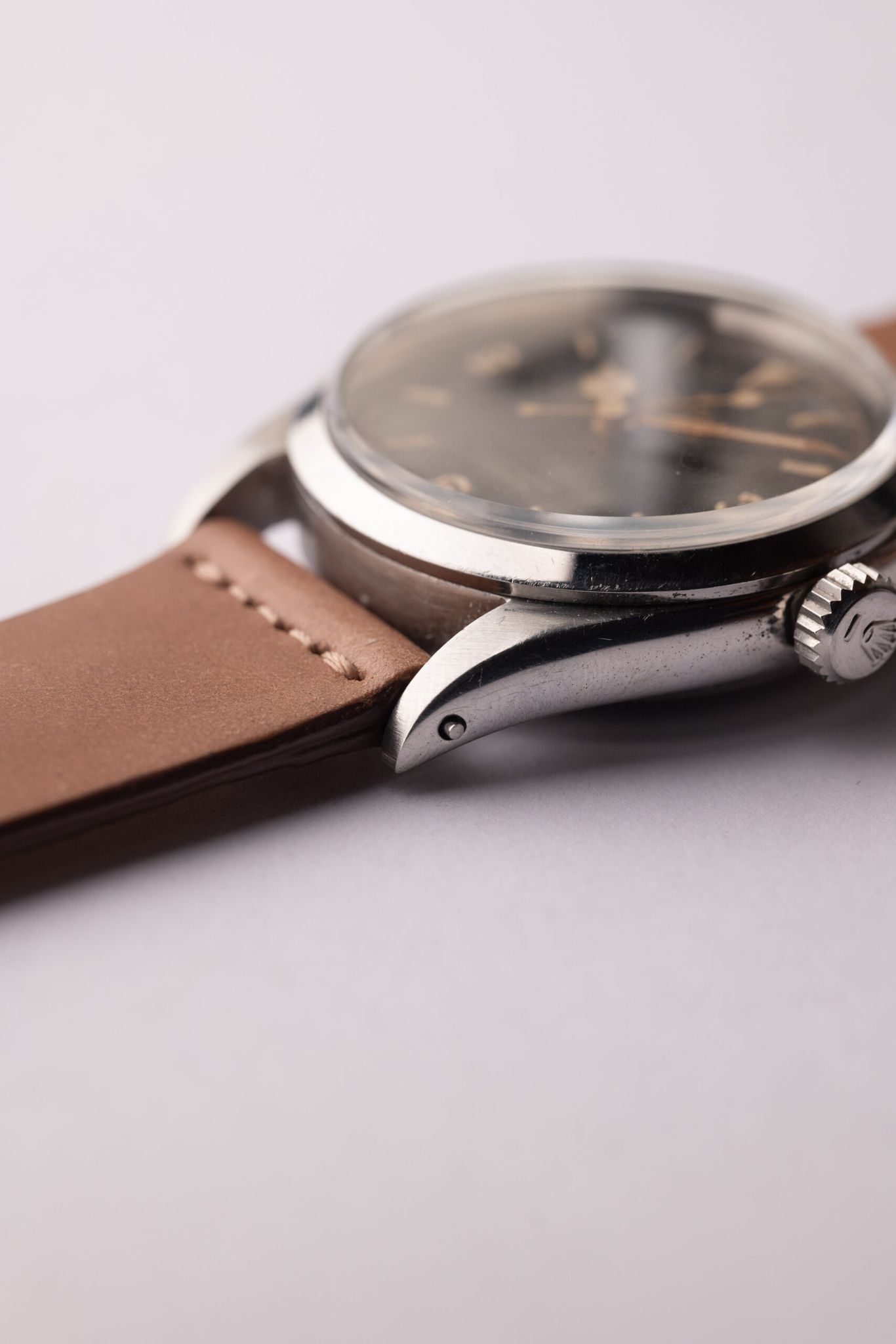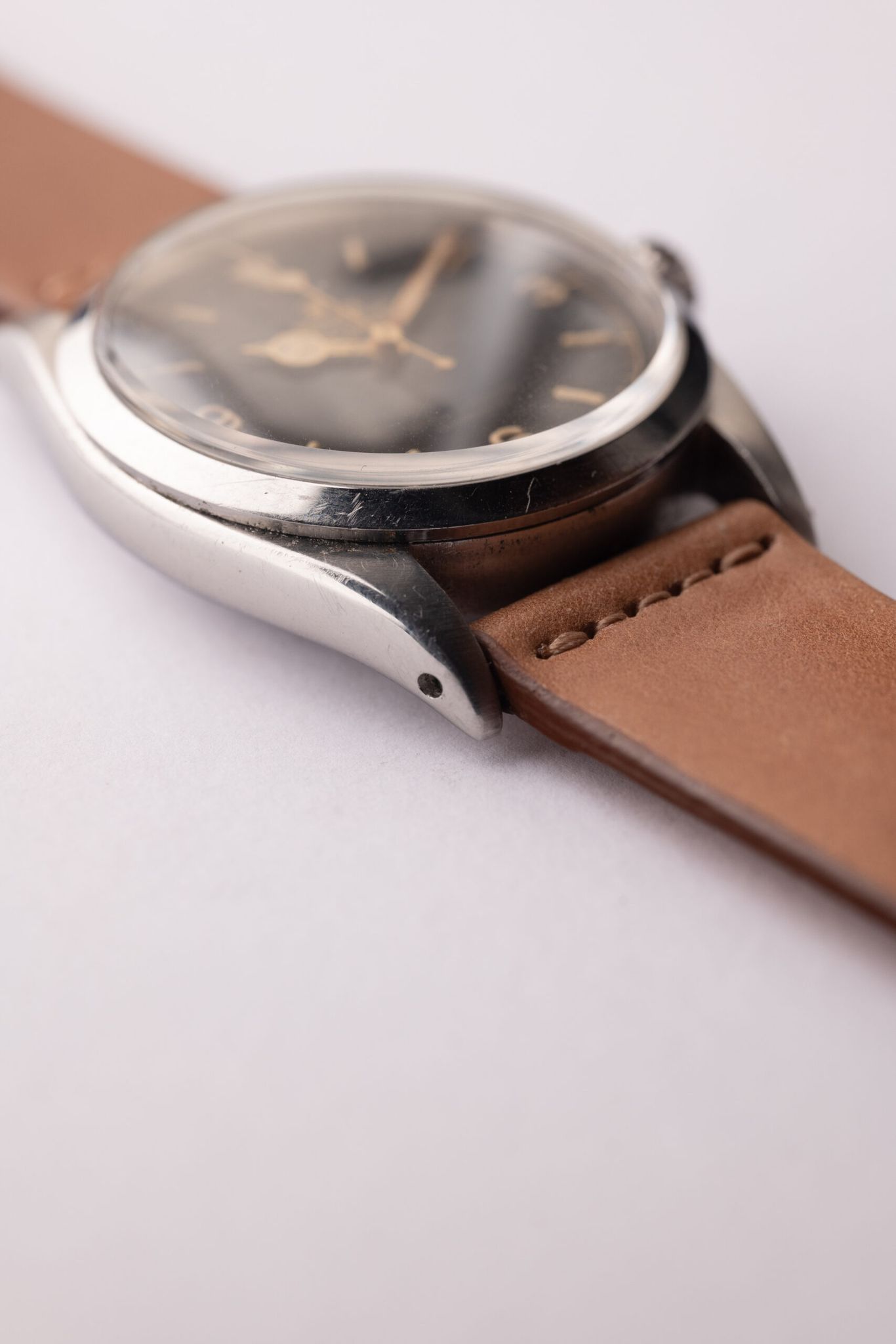 This 1955 6610 is a wonderfully worn example, whose chapter ring matte black gilt dial lettering remains perfectly intact. The face has been textured by radium, commonplace with such radioactive luminescence, and its presence has burgeoned – fully engendered with the soft cream hue of time. Previously polishing of the steel oyster case remains even throughout, preserving the Explorer’s do-everything, all-purpose allure.