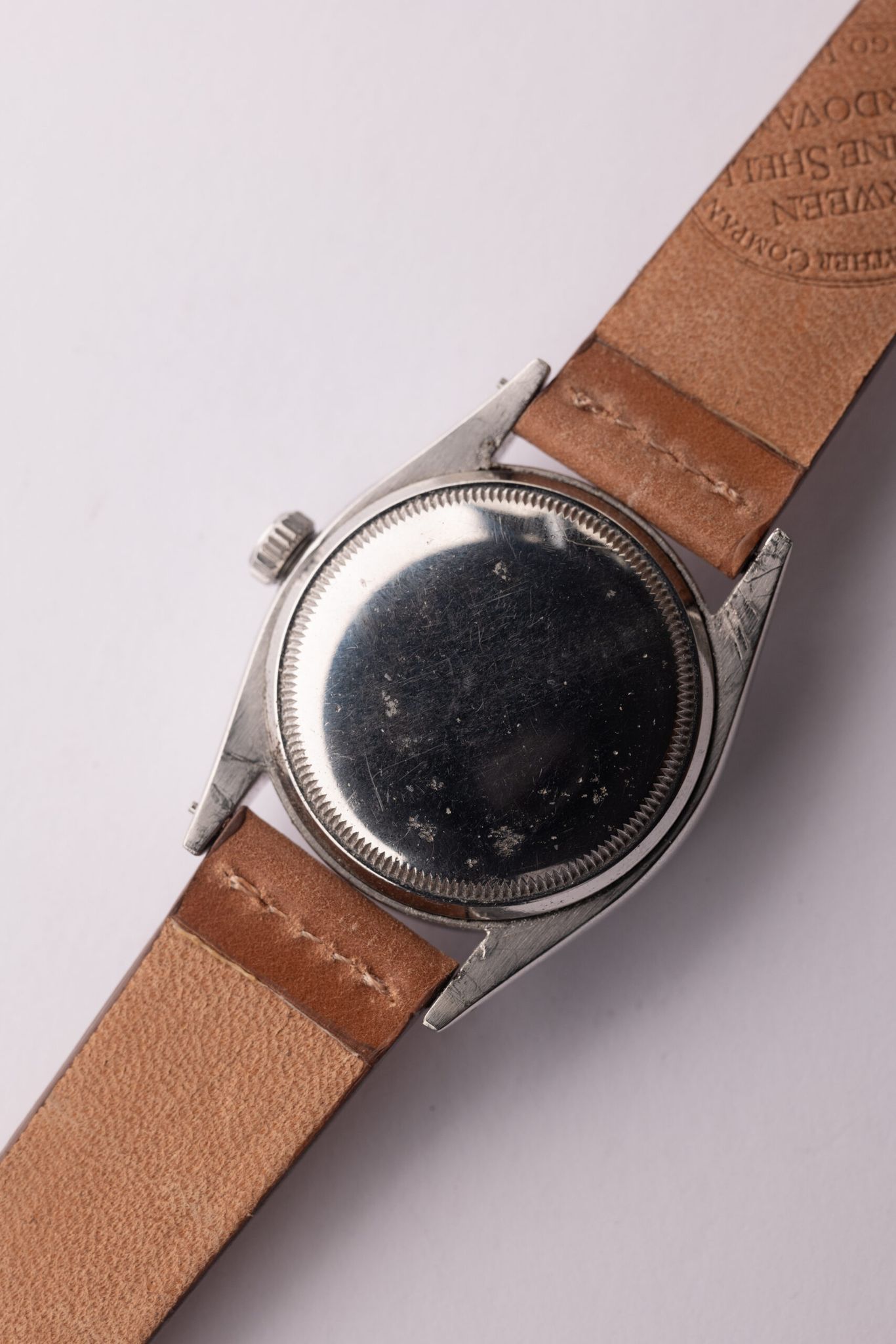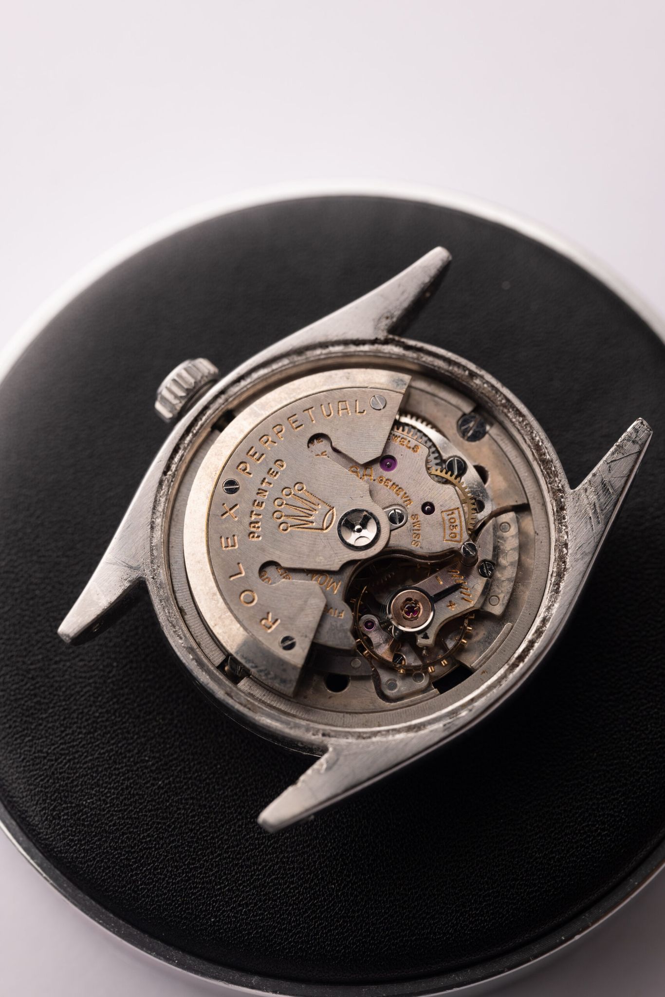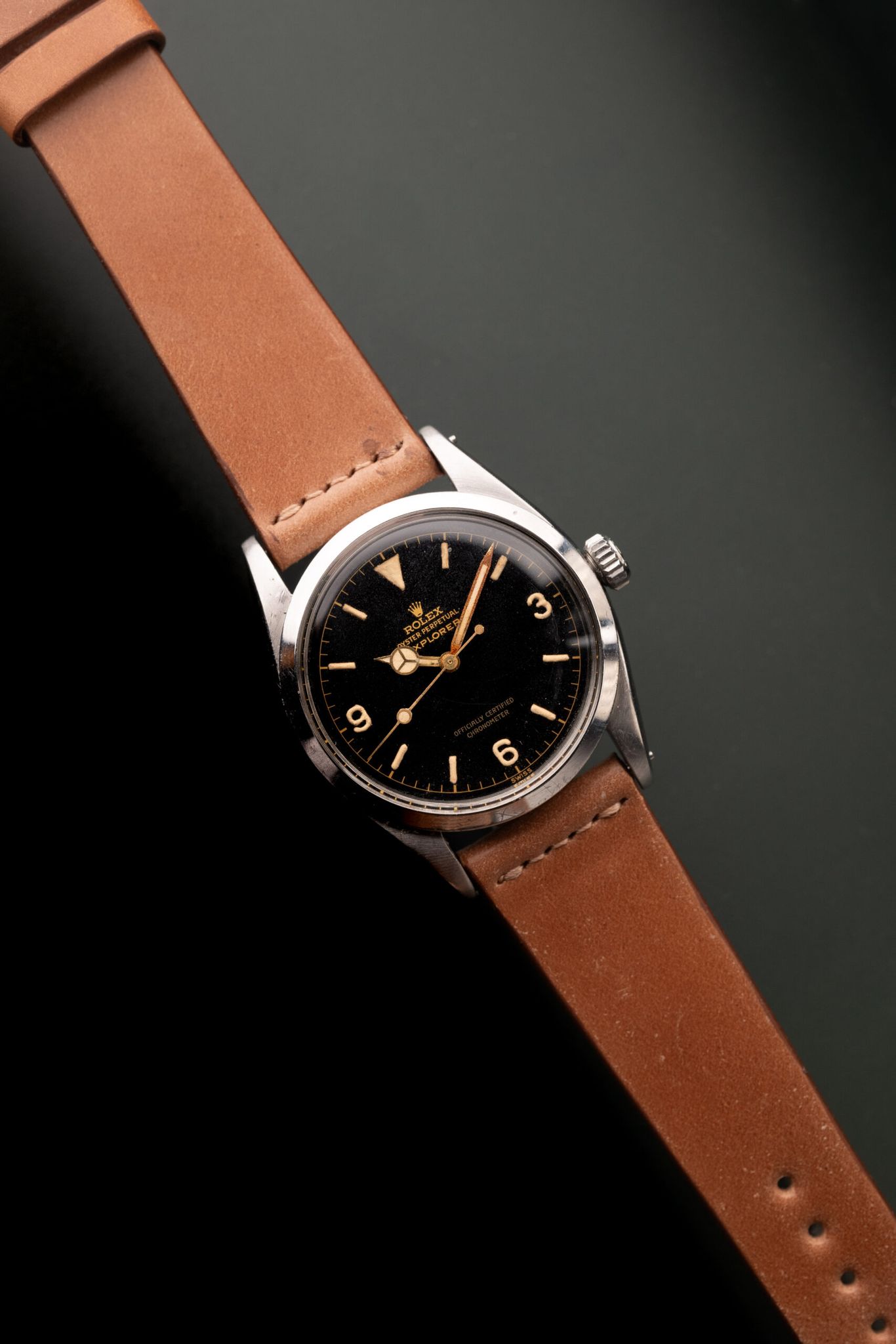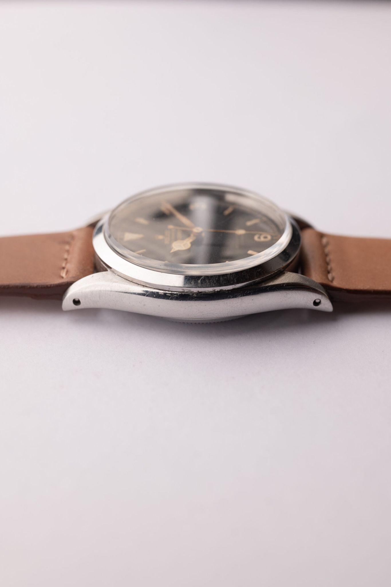 This 1955 6610 is a wonderfully worn example, whose chapter ring matte black gilt dial lettering remains perfectly intact. The face has been textured by radium, commonplace with such radioactive luminescence, and its presence has burgeoned – fully engendered with the soft cream hue of time. Previously polishing of the steel oyster case remains even throughout, preserving the Explorer’s do-everything, all-purpose allure.