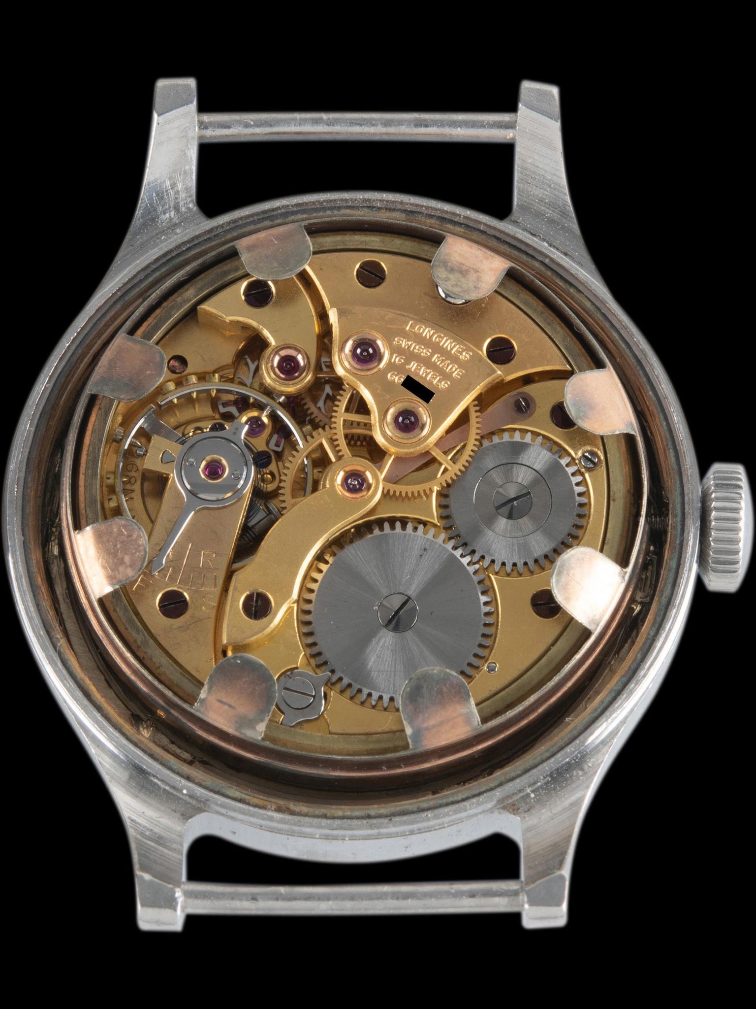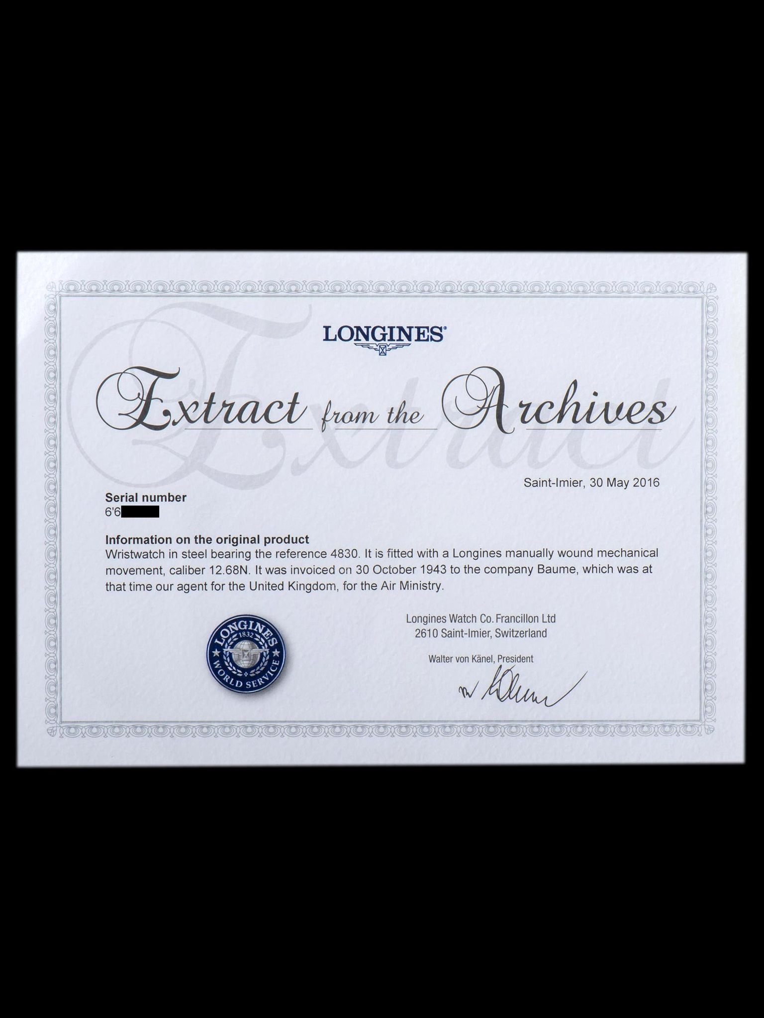 So, why the black dial here? Well, following the war, surplus 6B/159s were modified and reissued to the RAF by the Ministry of Defense after replacing the original alloy casing with a larger, stainless steel, screwback, waterproof case and refinishing the dial's black. These are rare, highly sought-after pieces with an iconic aesthetic and tons of WWII-era military panache. The Extract From The Archives reveals this watch was originally manufactured in 1943 and delivered to Baume, which was Longines' agent to the Air Ministry for the United Kingdom, however, the serial reveals the watch wasn't actually issued and put into use until 1956, further verifying the origins of this unique timepiece.