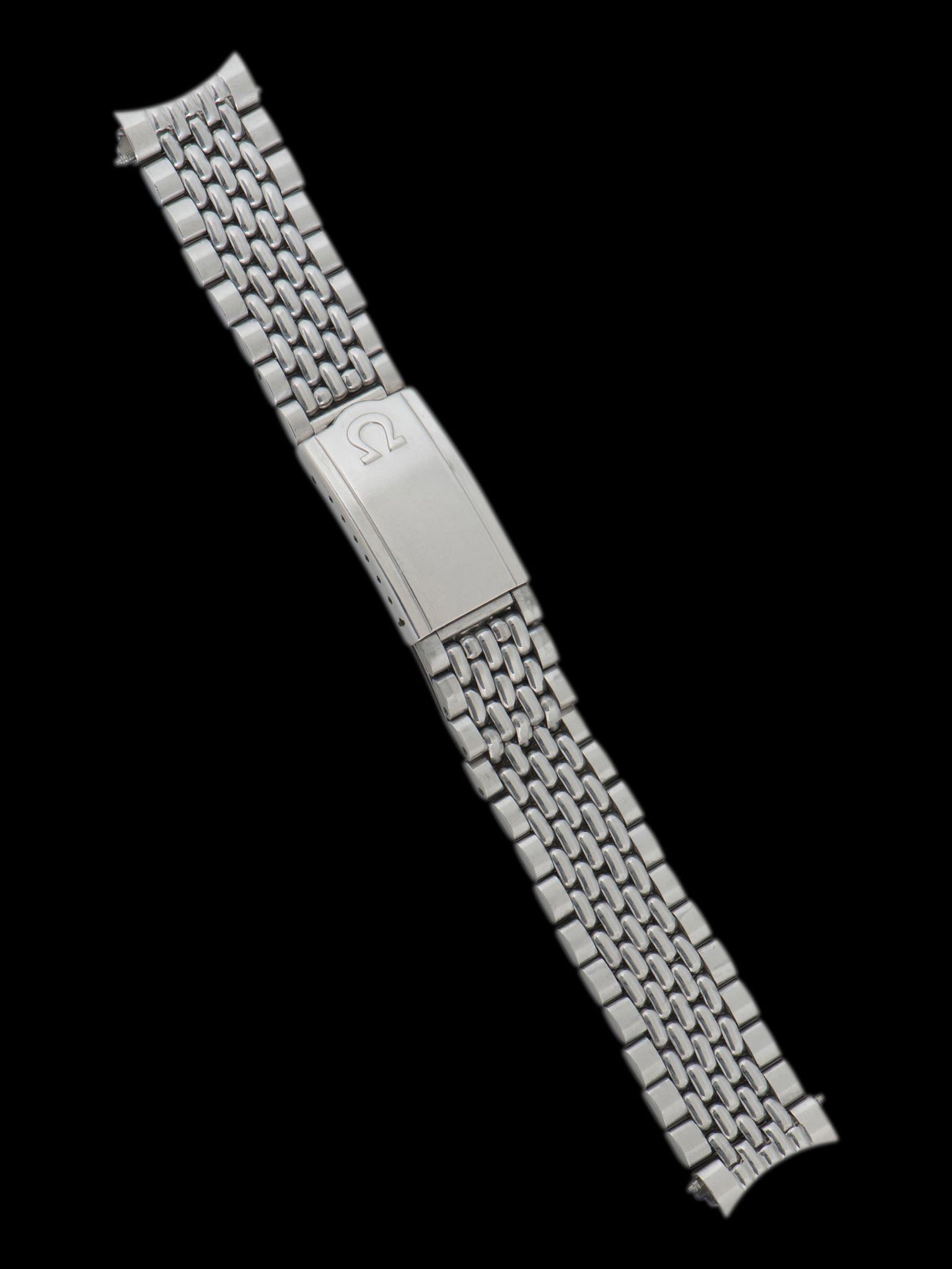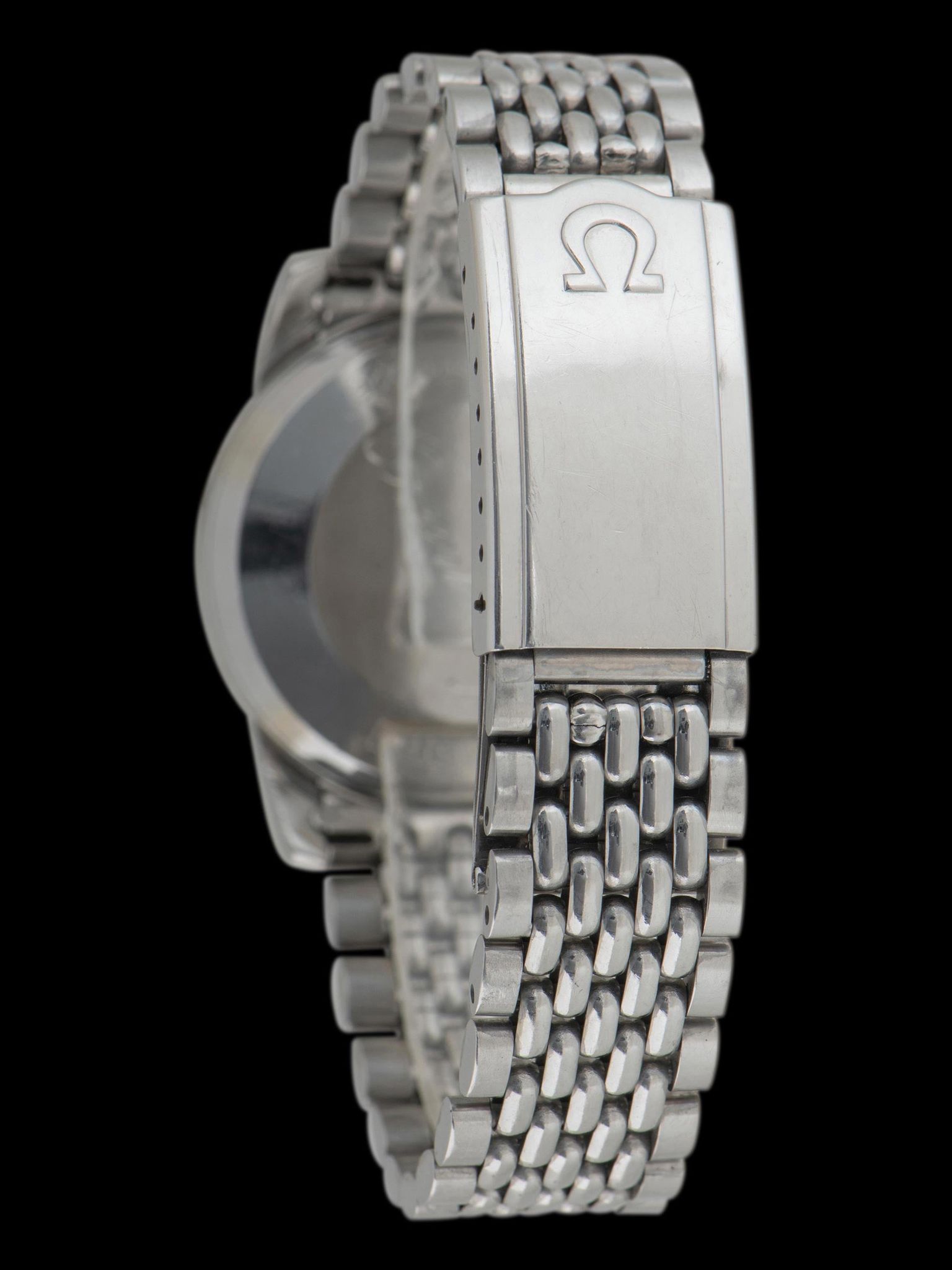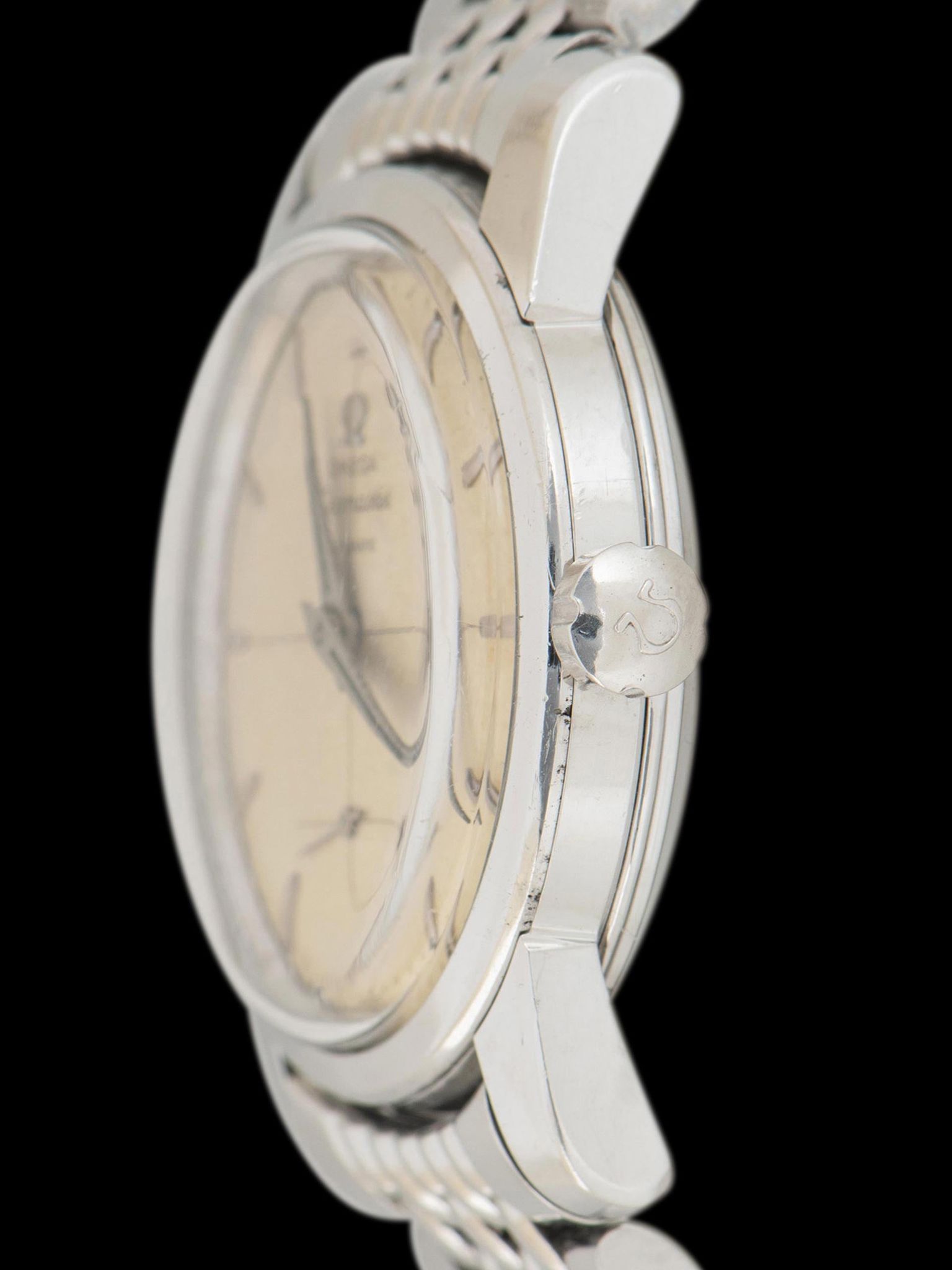 The excellent case has been gently polished in the past and retains thick and symmetrical lugs that retain slight chamfers. The case retains its original "flat foot" Omega-signed crown. The case back retains its original factory markings and features a hand engraving that reads "F.L. Greenland, Jr." The watch comes on an original Omega 8220 "beads of rice" bracelet with 11 end pieces. The bracelet retains 11 links and will fit up to a 7 1/4-inch wrist.