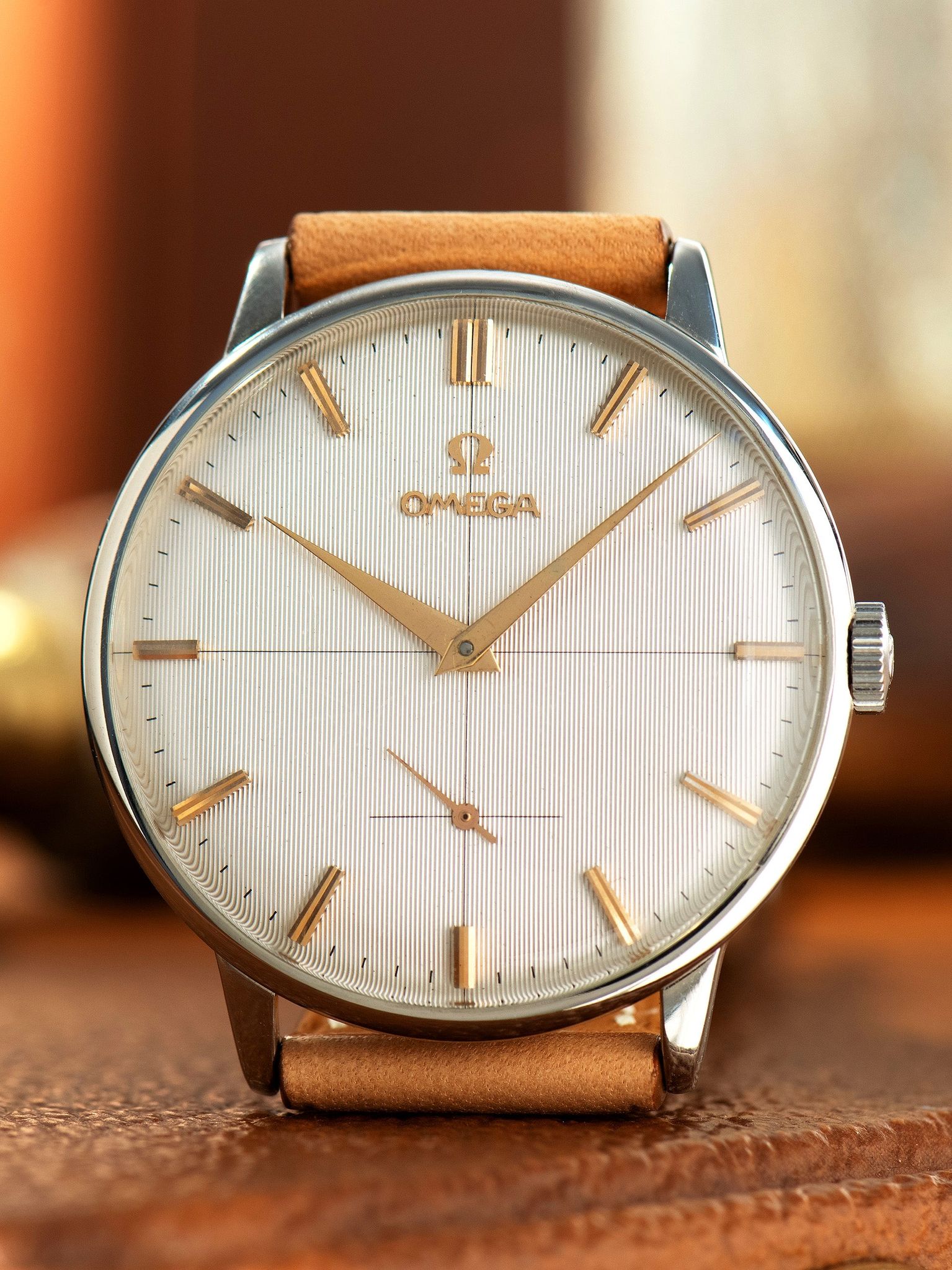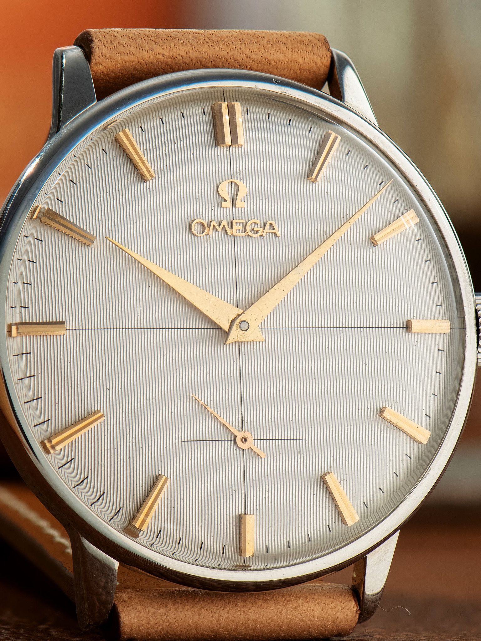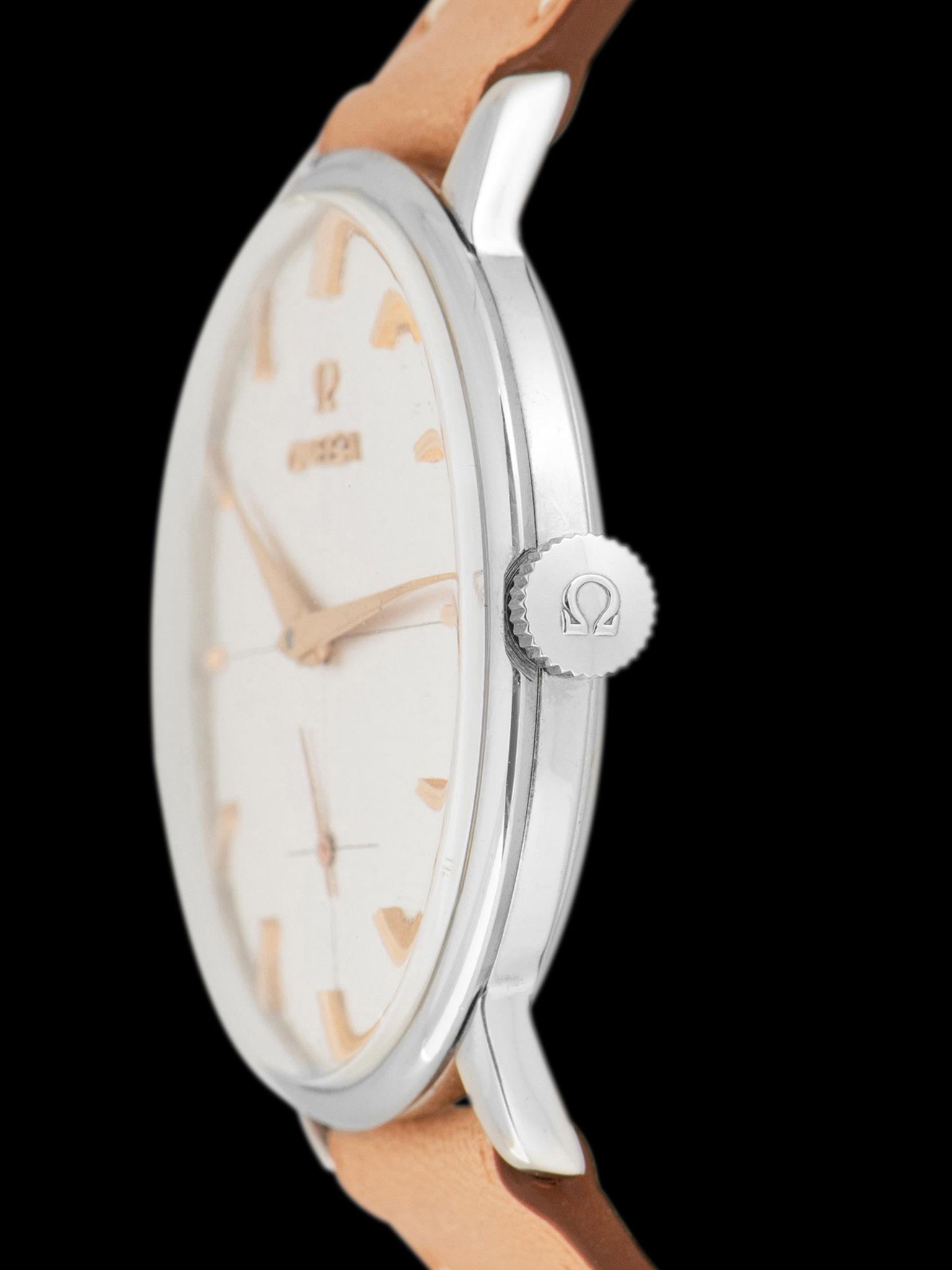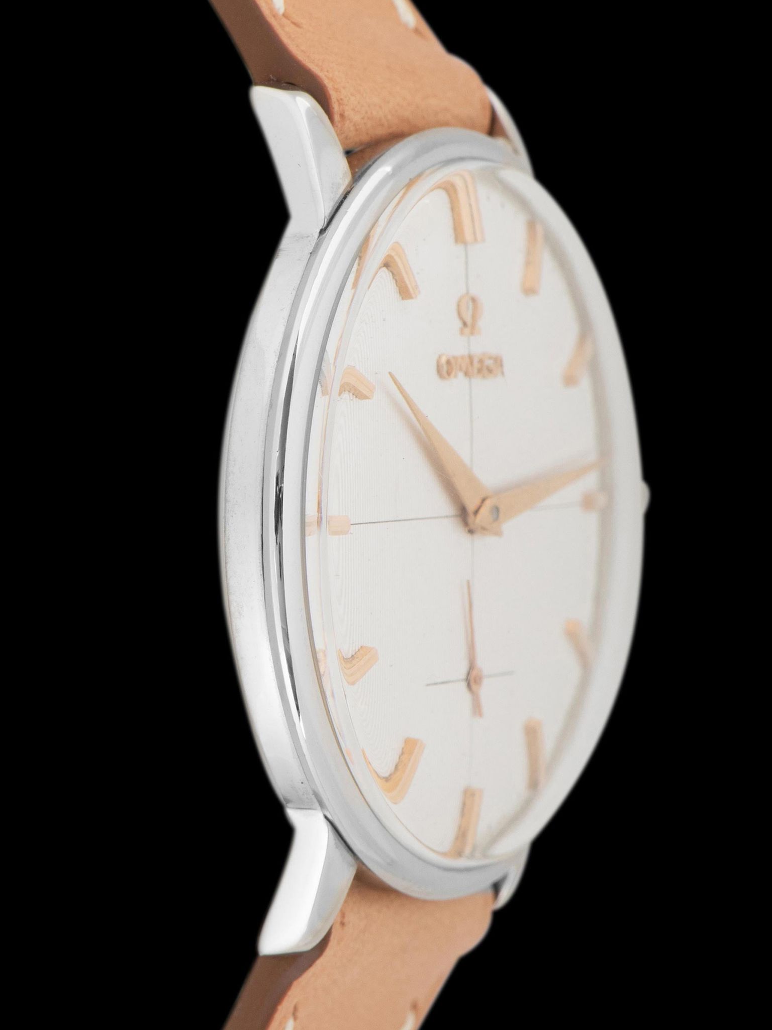 The classically shaped large and thin case exhibits minimal wear and evidence of only gentle polishing in the past. The svelte Omega signed crown is believed to be original to the watch. The snap-on case back is in excellent overall condition. The watch comes supplied on a vintage 2pc handmade leather strap with a stainless steel Omega tang buckle.