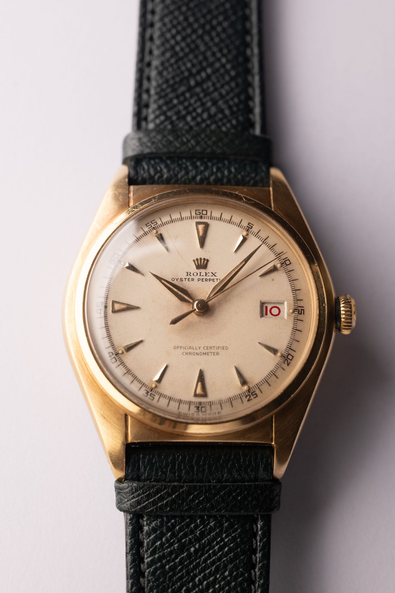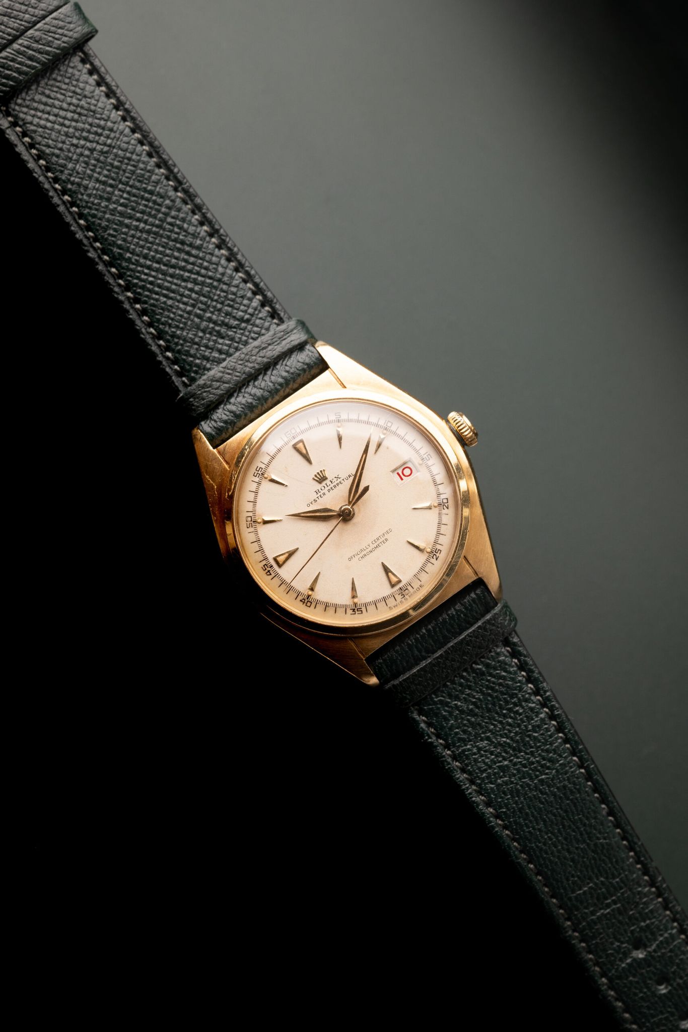 Prior to 16xx Datejust’s 1970’s ubiquitous boardroom takeover, the precious metal, claw dial, dauphine hand Oyster Perpetual set the stage. In off-white honeycomb, roulette date wheel, and 36mms of 18k yellow gold his 5030 was once the Halo of Rolex’s catalogue.