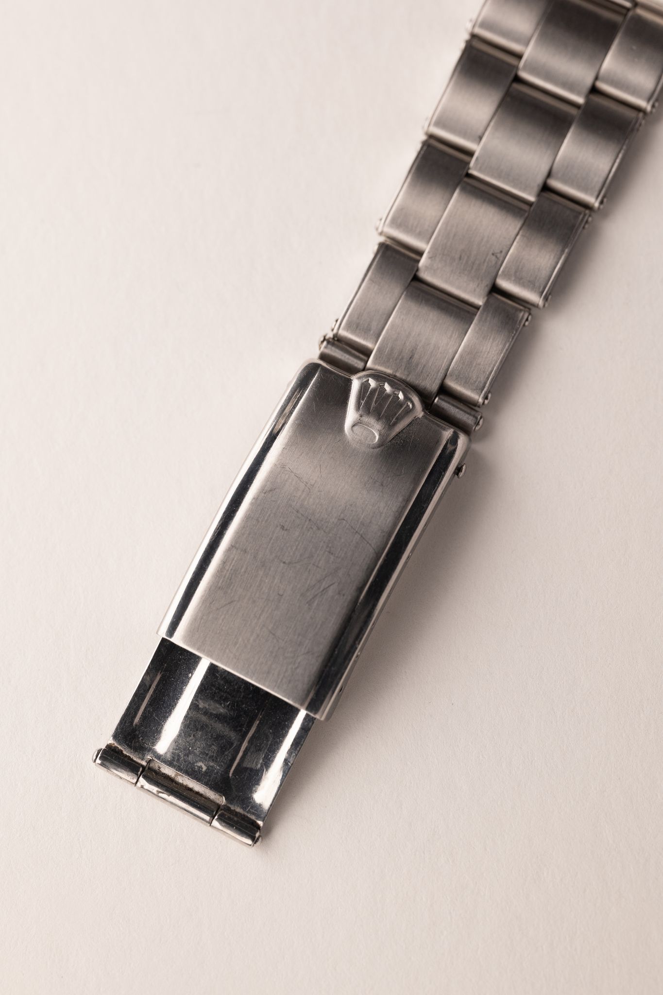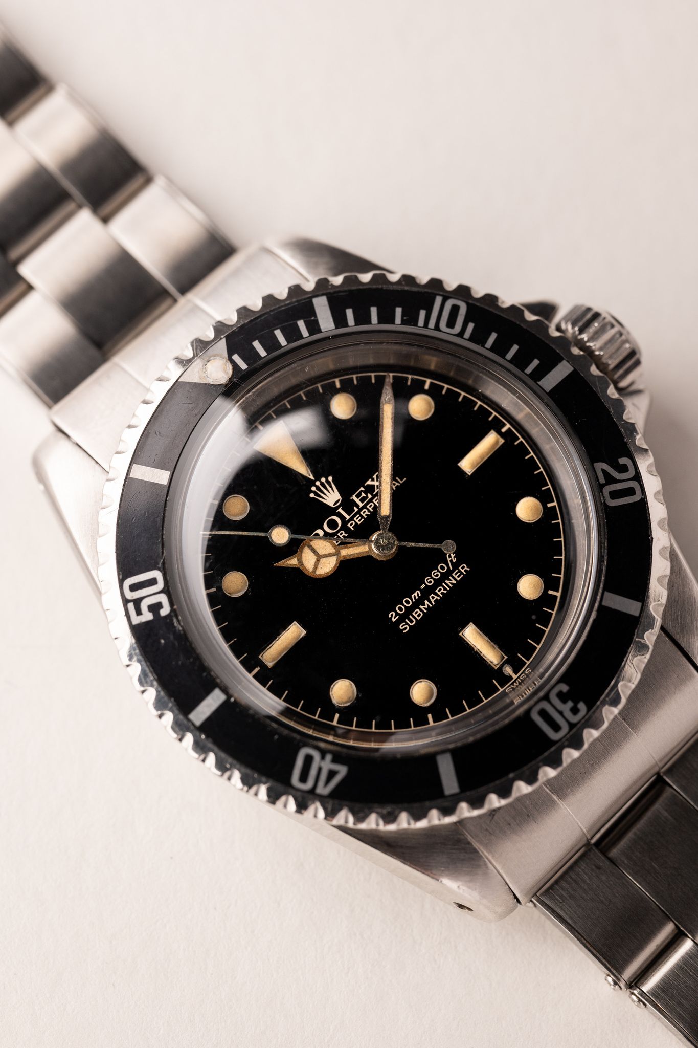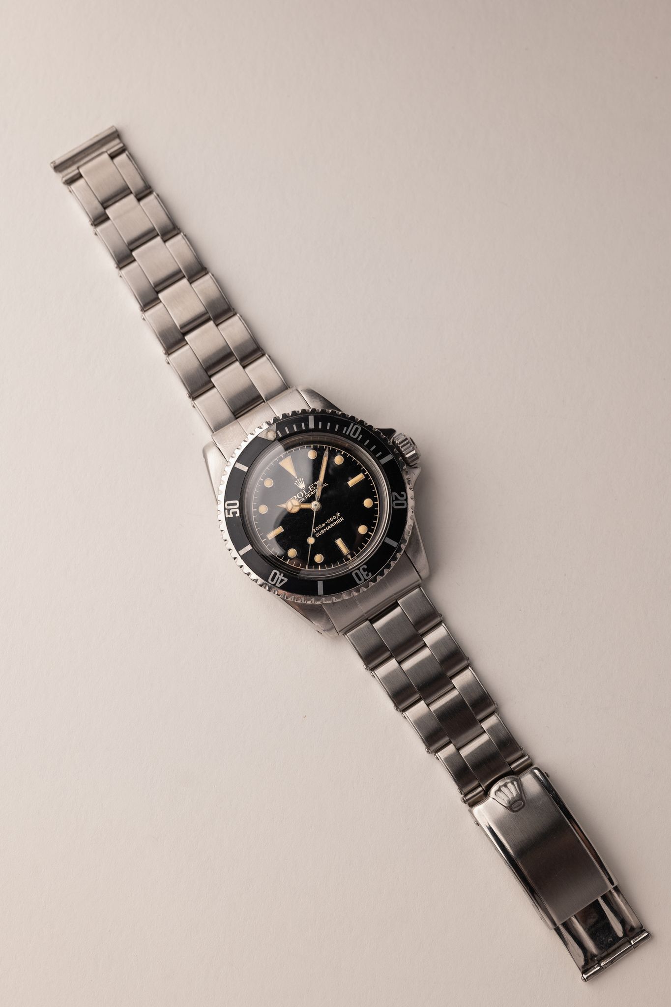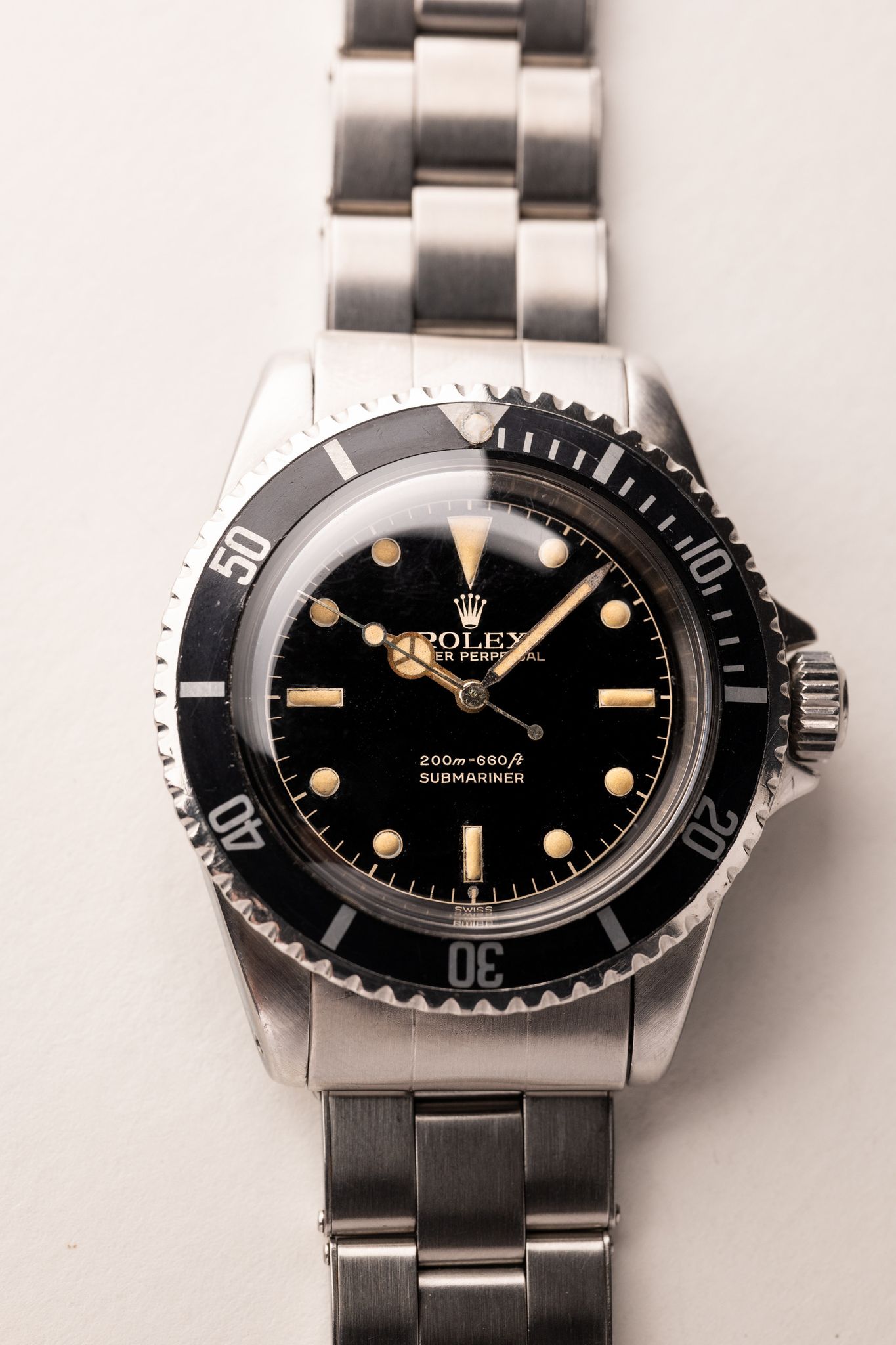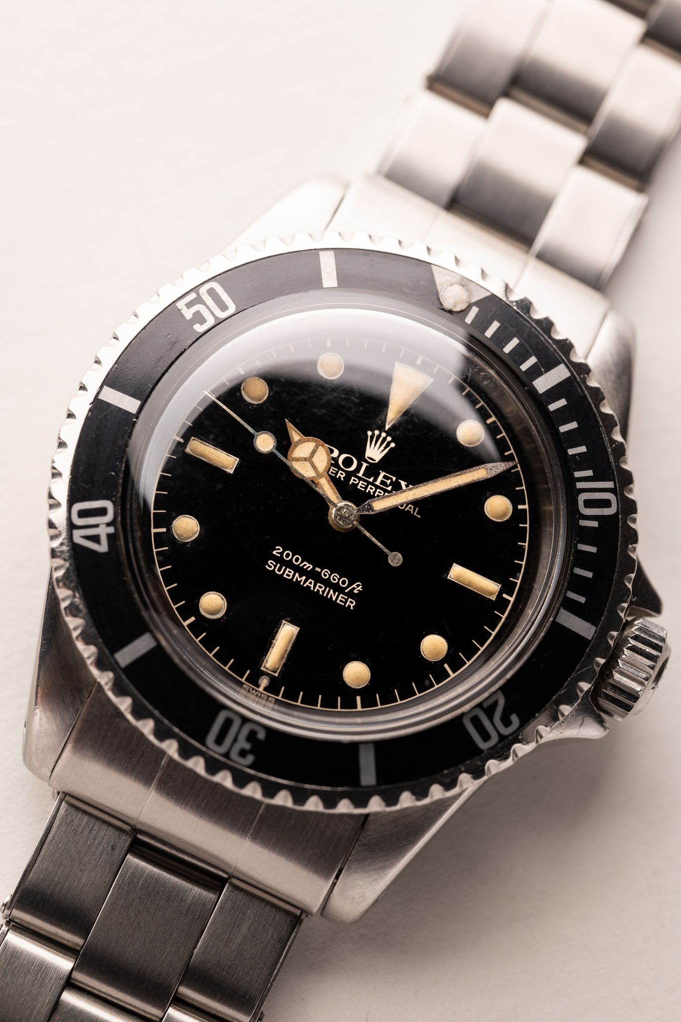 Description: The 5512 Gilt chapter-ring for most serious vintage Rolex collectors is a grail sub. These are one of the earliest Submariners to receive crown guards. The crown guards themselves also are pointed as opposed to the curved ones that replaced them shortly after this run. The lume is excellent and sits beautifully against a glossy black dial. There is slight patina on the gloss and this is rather normal and expected from this era of gilt. The gilt text that appears is actually the color of the dial as it is a negative relief. Hands are matching to the dial and the case has been previously lightly polished in the past. There is an exclamation point at the 6 o’clock position that is suspected to denote internally the switch and absence of radium to tritium. This is a beautiful grail Sub for any collector.