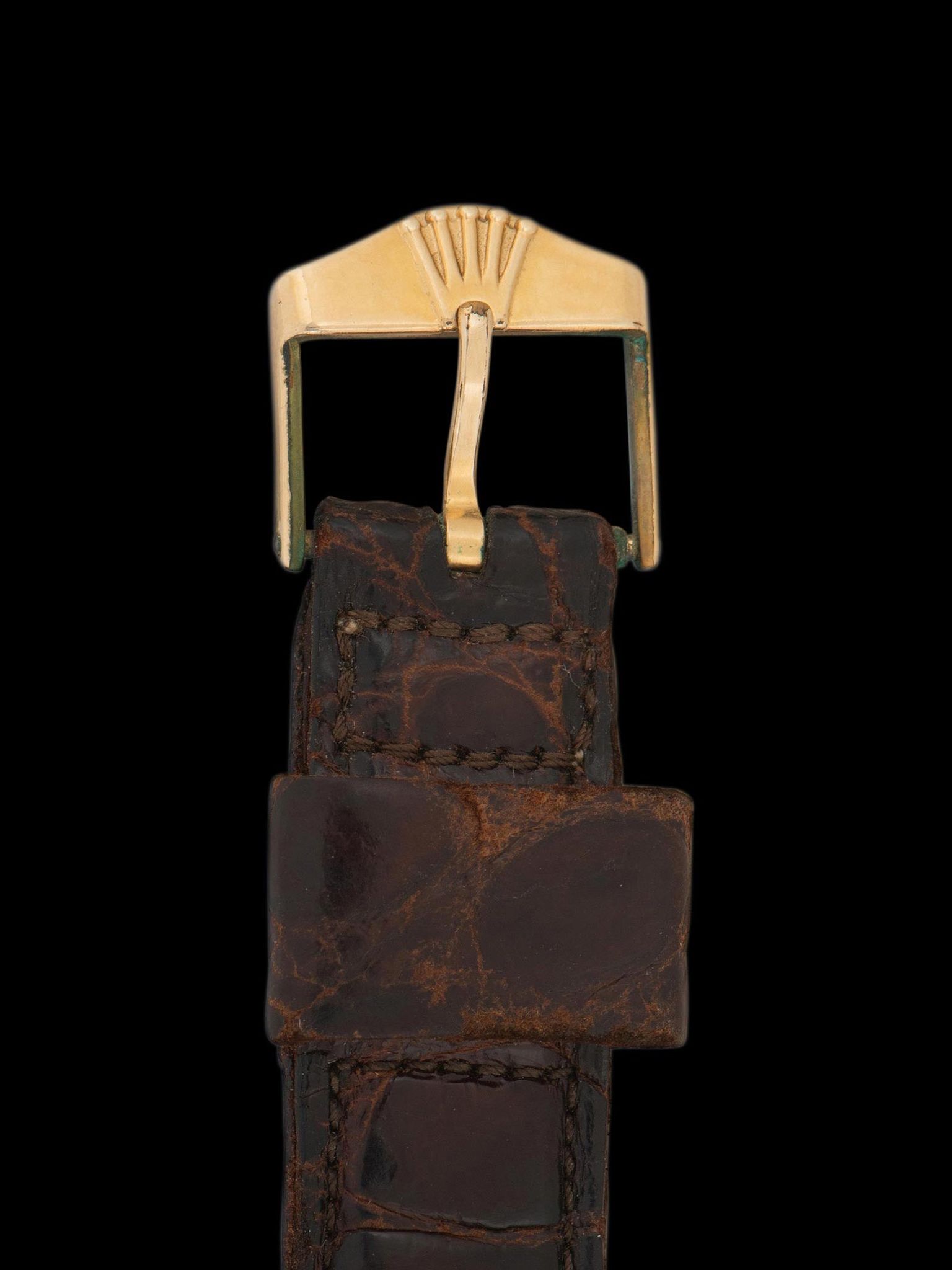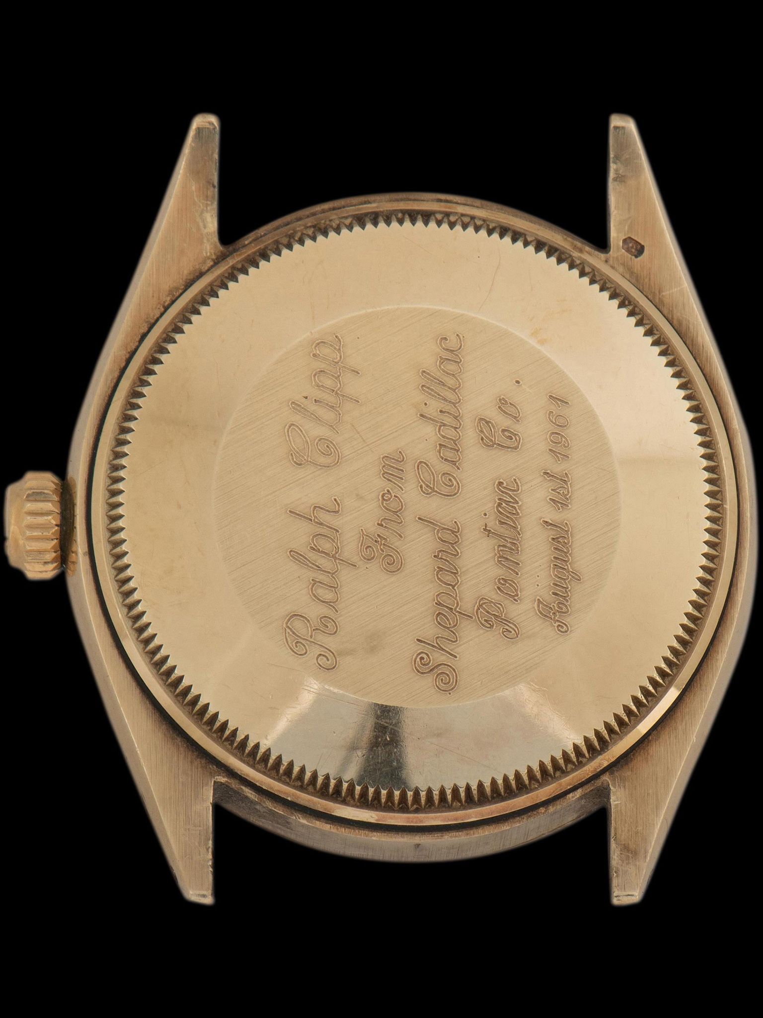 The 14K yellow gold case is in excellent condition, especially for its age, showing thick and symmetrical lugs that retain factory dimensions. The case exhibits some honest signs of previous use with no notable evidence of being previously polished, though there is a subtle sleeve polish from wear. The smooth 14k yellow gold bezel is unpolished and shows light signs of honest use. The case back is unpolished as well and features a personalized engraving to the original owner that reads, "Ralph Clipp, From Shepard Cadillac, Pontiac Co, August 1st, 1961". The watch comes supplied on a vintage two-piece brown alligator leather strap with its original gold plaque Rolex tang buckle.