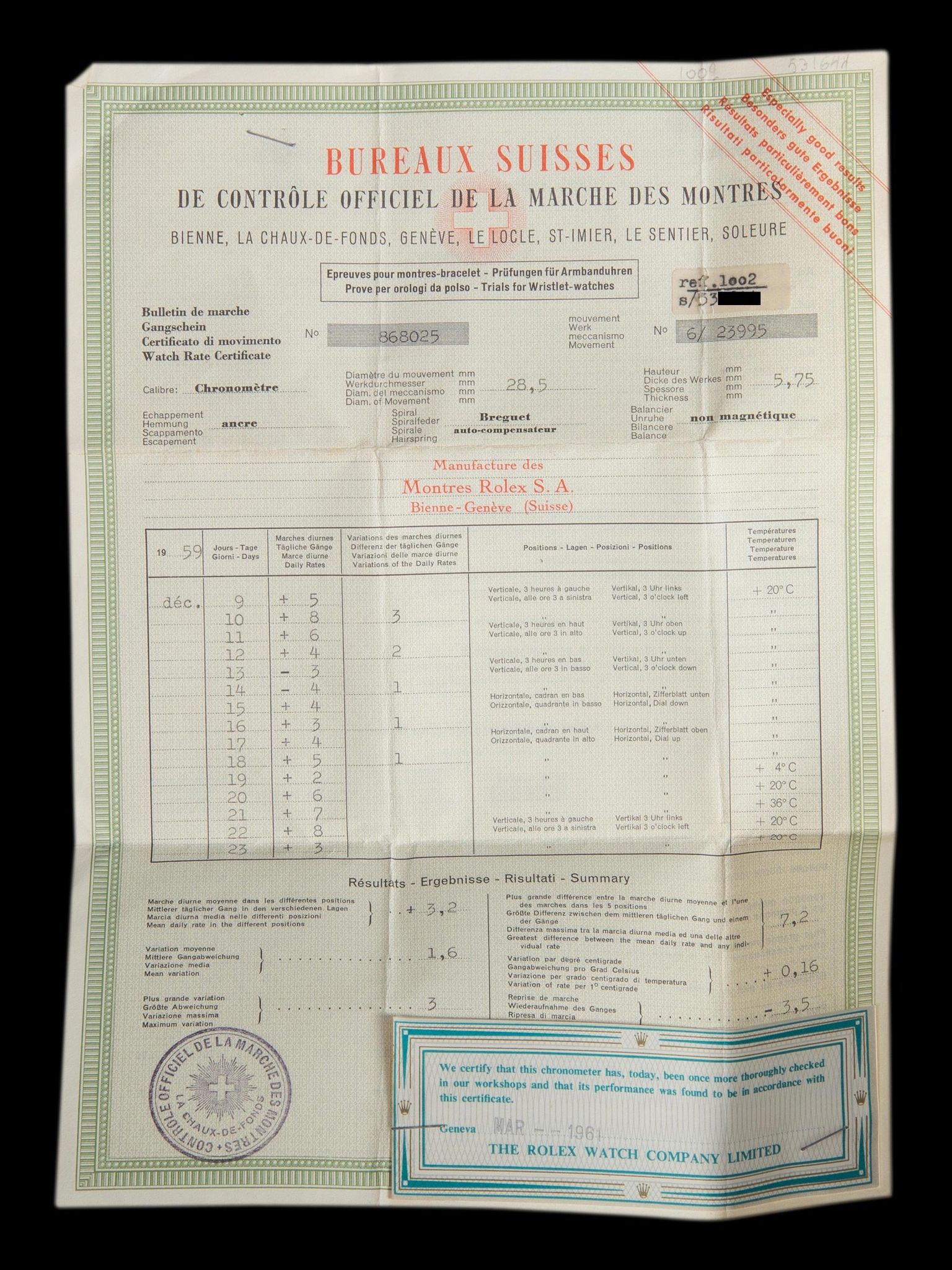 The watch comes with its original Rolex box, Rolex guarantee pamphlet, and chronometer certificate. The watch is keeping time, the previous service history is unknown. A movement service can be provided upon request.