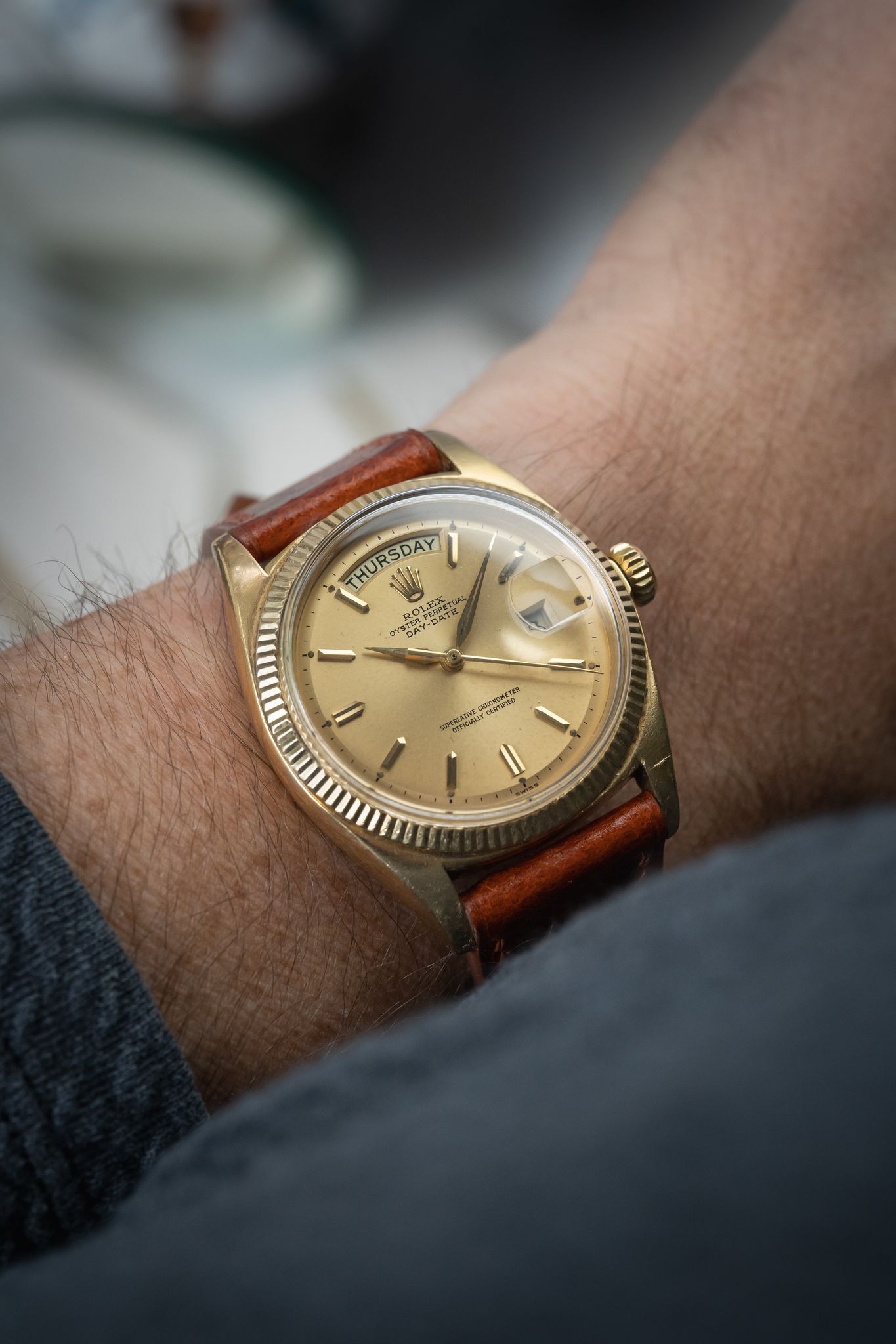 Preserved in attractive vintage condition, this piece exudes authenticity and character, reflecting its remarkable history and enduring elegance. The gold case, with its warm patina, speaks to its well-loved heritage, while maintaining the unmatched craftsmanship that collectors and enthusiasts admire. Known as the “President” watch, the Day-Date has graced the wrists of global leaders and visionaries, cementing its place as an icon of prestige and refinement. This 1960 model not only offers a glimpse into the golden age of watchmaking but also stands as a statement of impeccable taste and discernment. A true collector’s item, this Rolex is more than a timekeeper—it’s a legacy of style and history that belongs in the most distinguished collections.