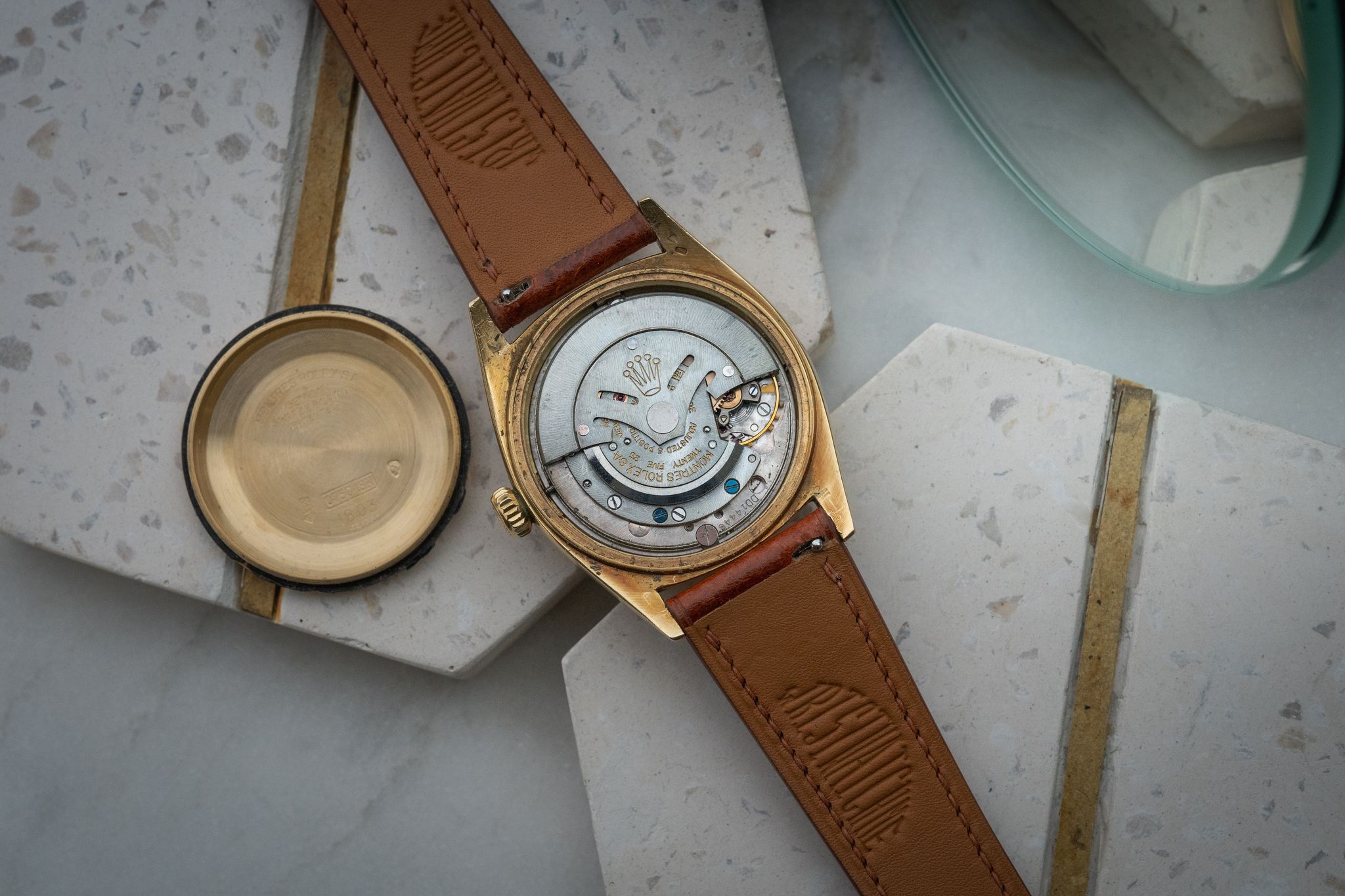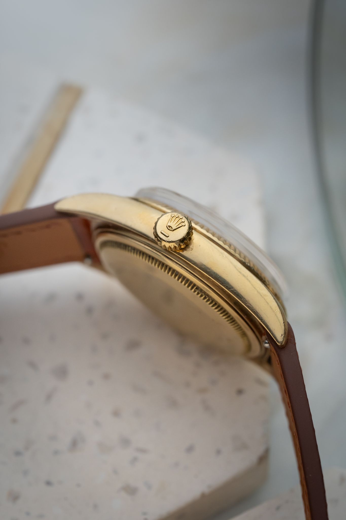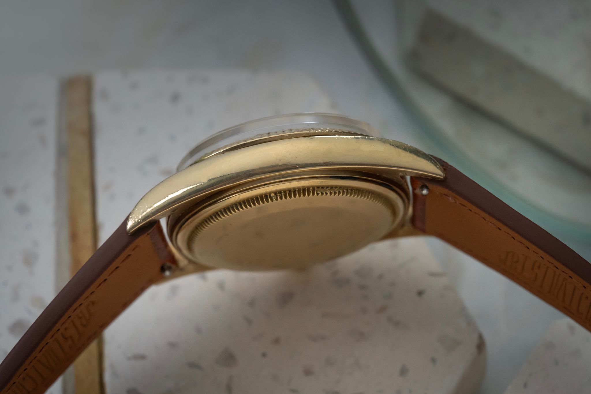 Case: 36mm solid 18 karat solid yellow gold case in attractive condition. It shows honest signs of wear with no major distractions.