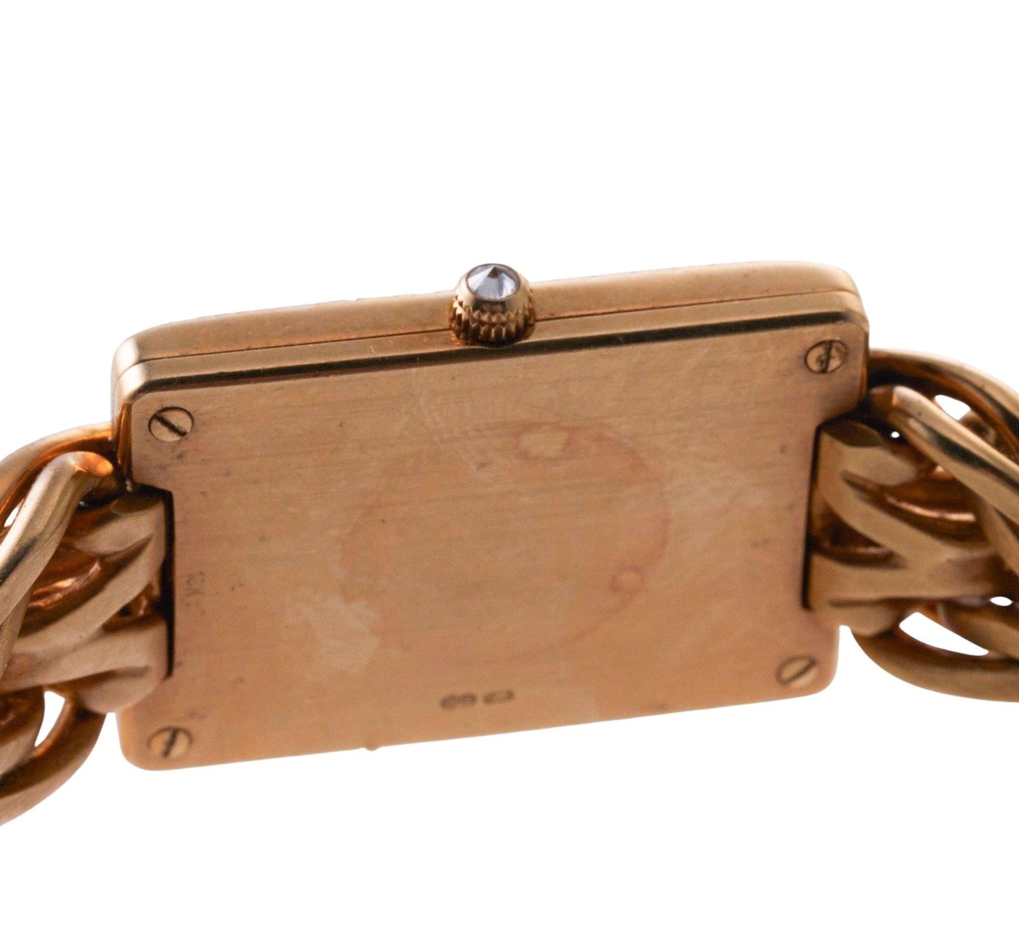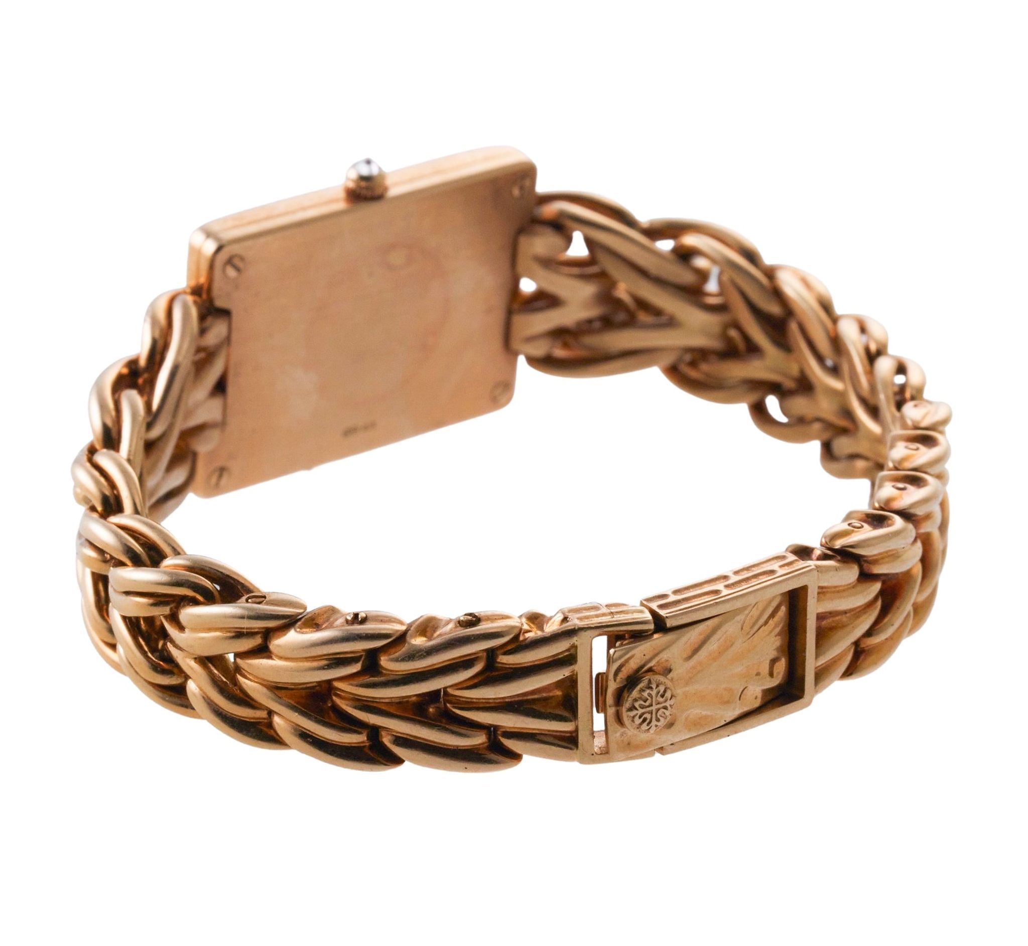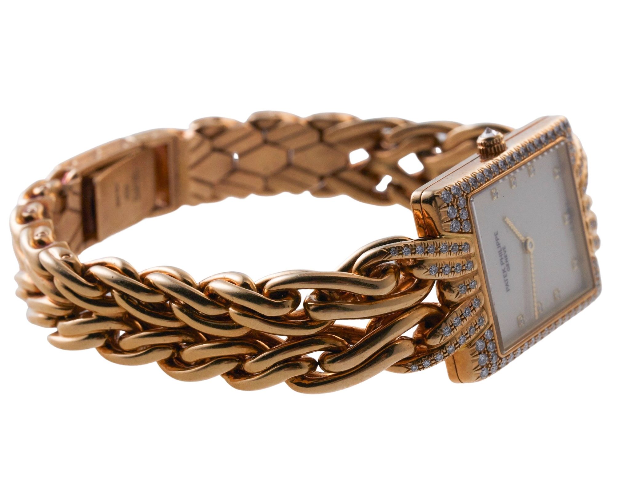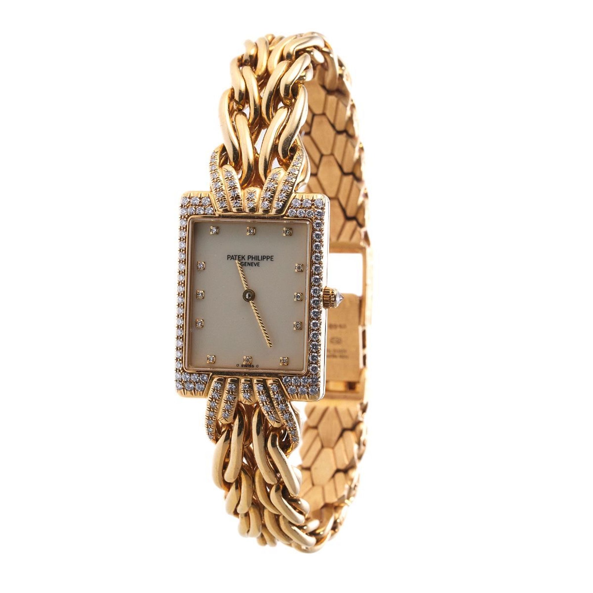 Patek Philippe La Flamme Gold Diamond Ladies Quartz Watch 4835/3. Watch is in great preowned condition, set on an original 18k gold integrated bracelet.