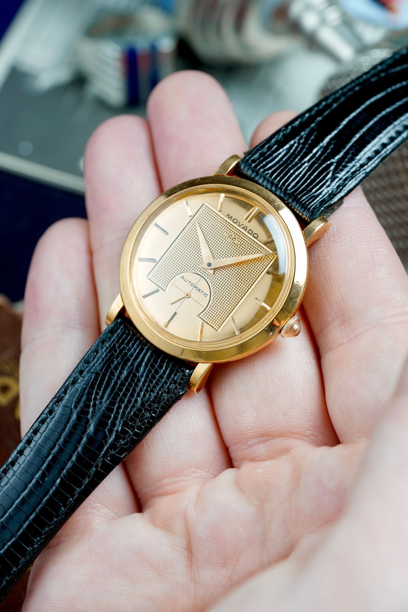 Movado of this era made a lot of amazing chronographs and triple calendars. This offering is something slightly off the beaten path. There were several iterations of what was eventually known as the "Gentleman" and this is one of them. Known for its isle of Guilloché at the center of the dial, offset buy a sub seconds hand, this watches symmetry is ASMR to eyeballs.