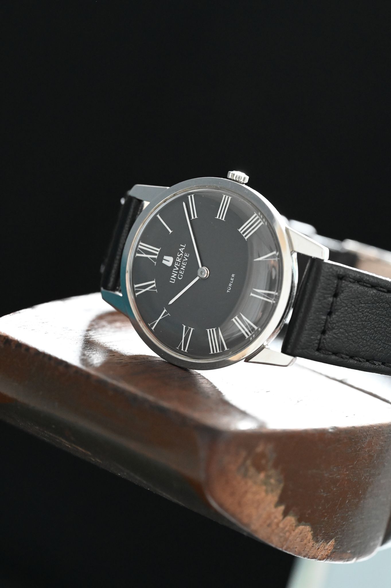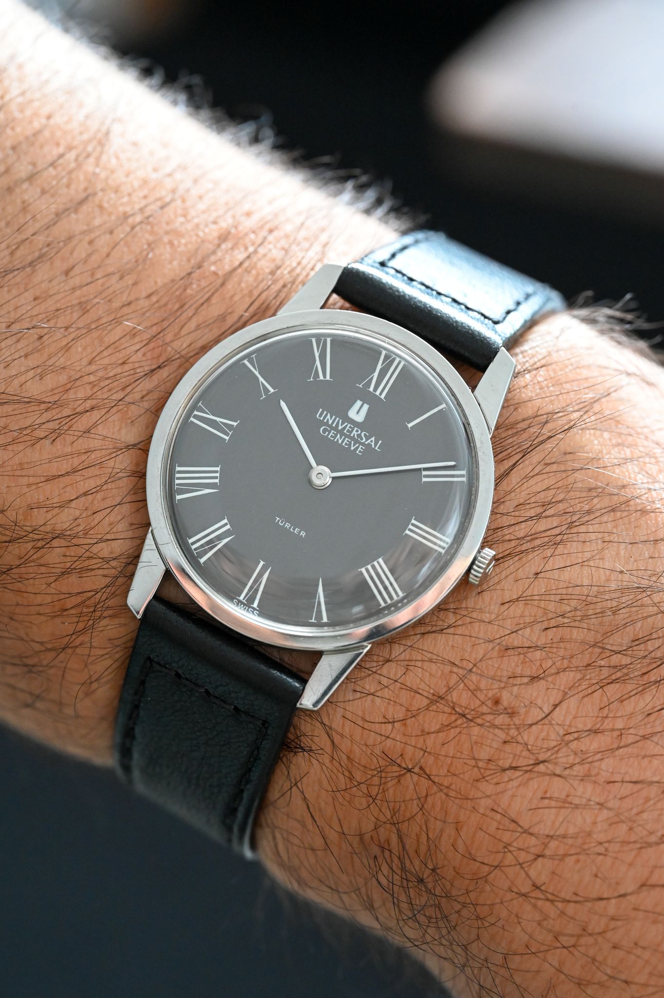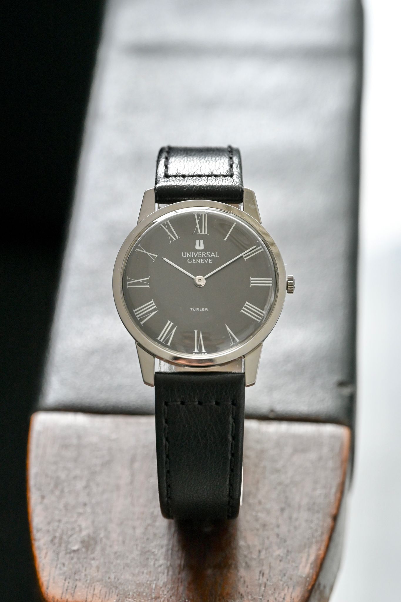 Dial: Clean grey matte dial with painted white roman numerals and double signature ‘‘ Turler’’