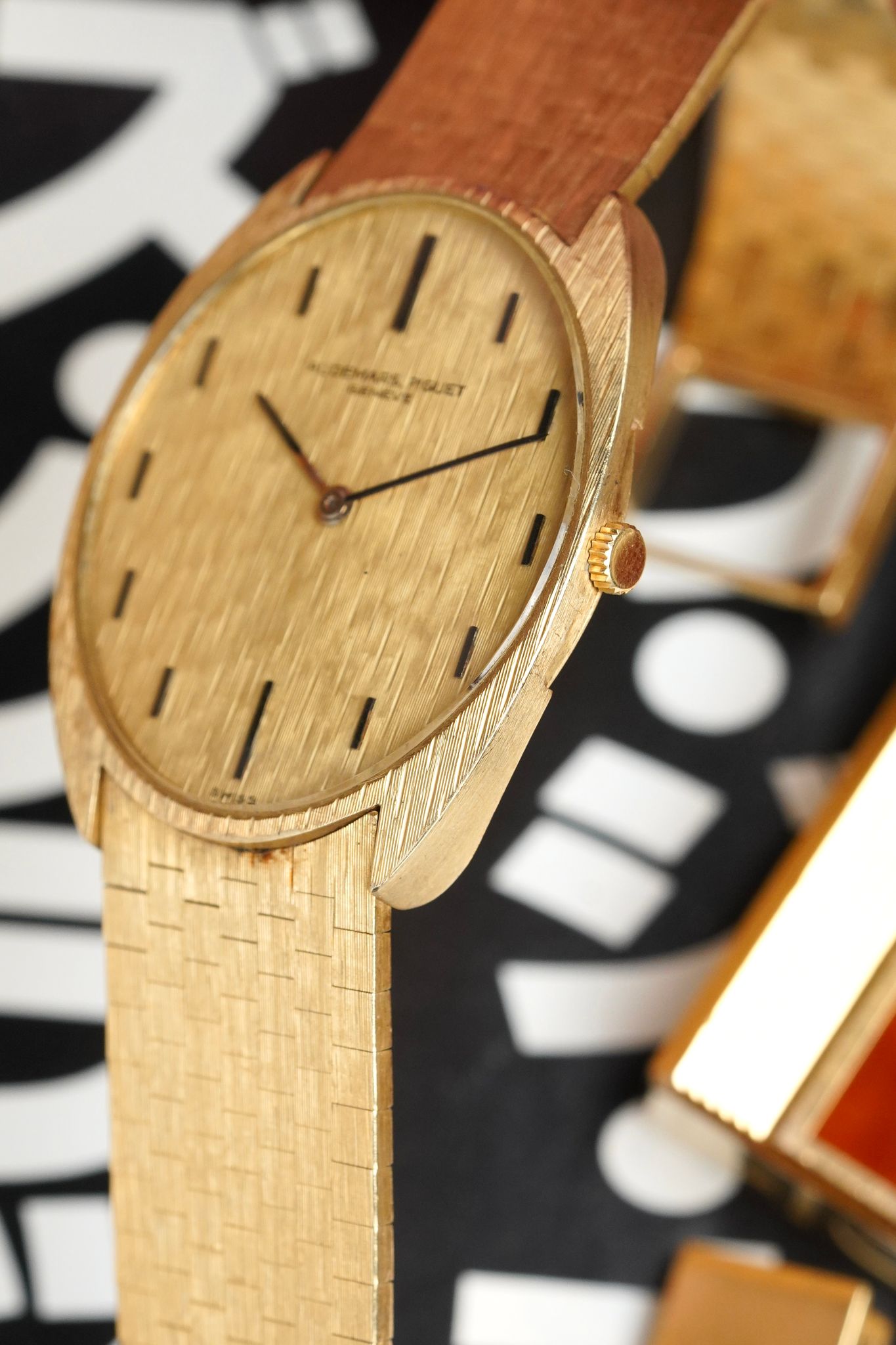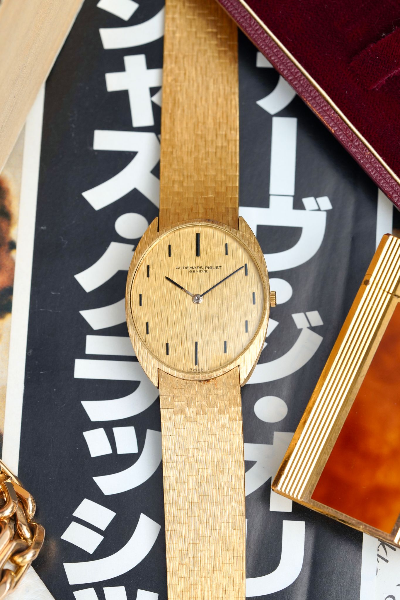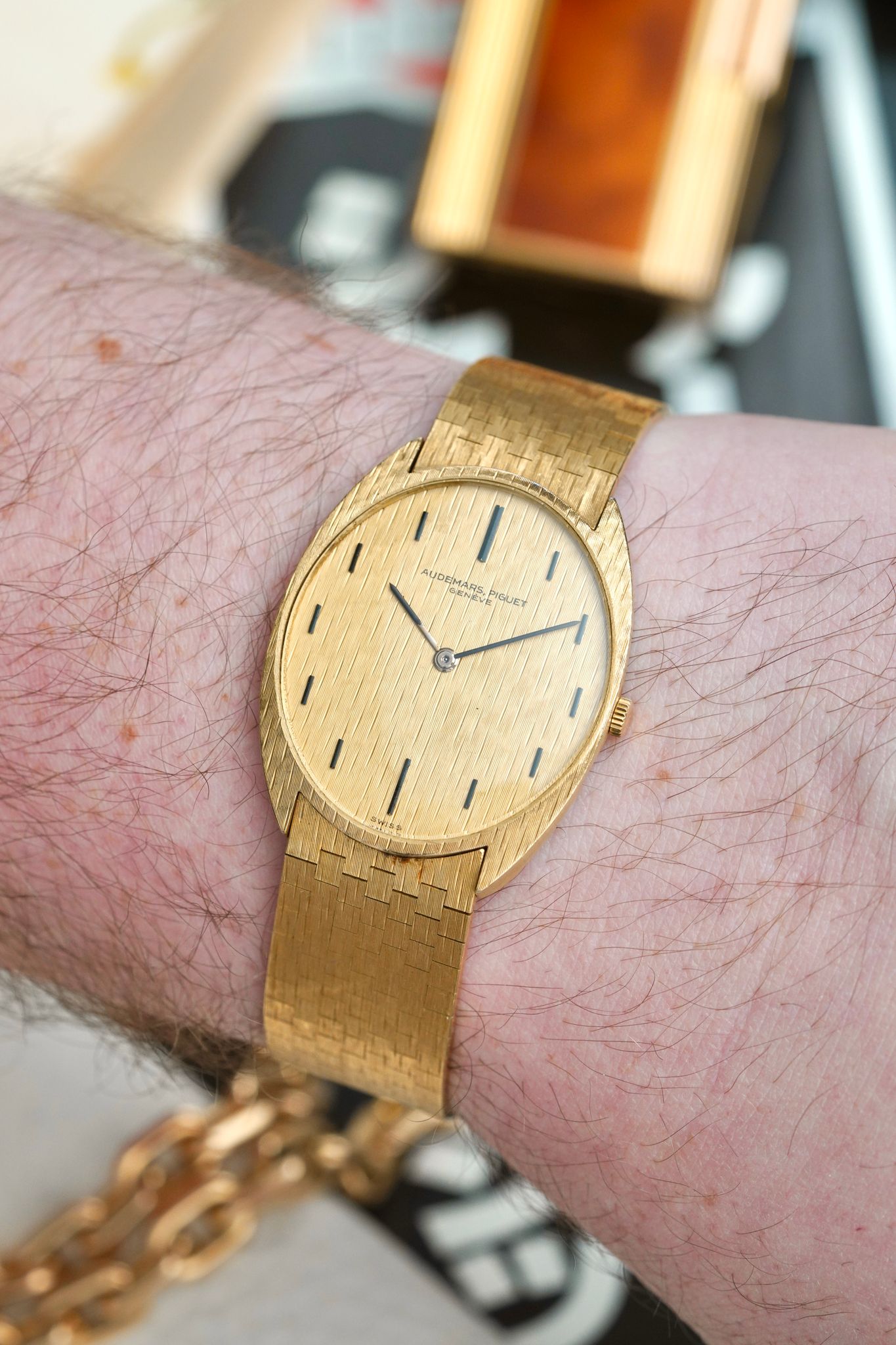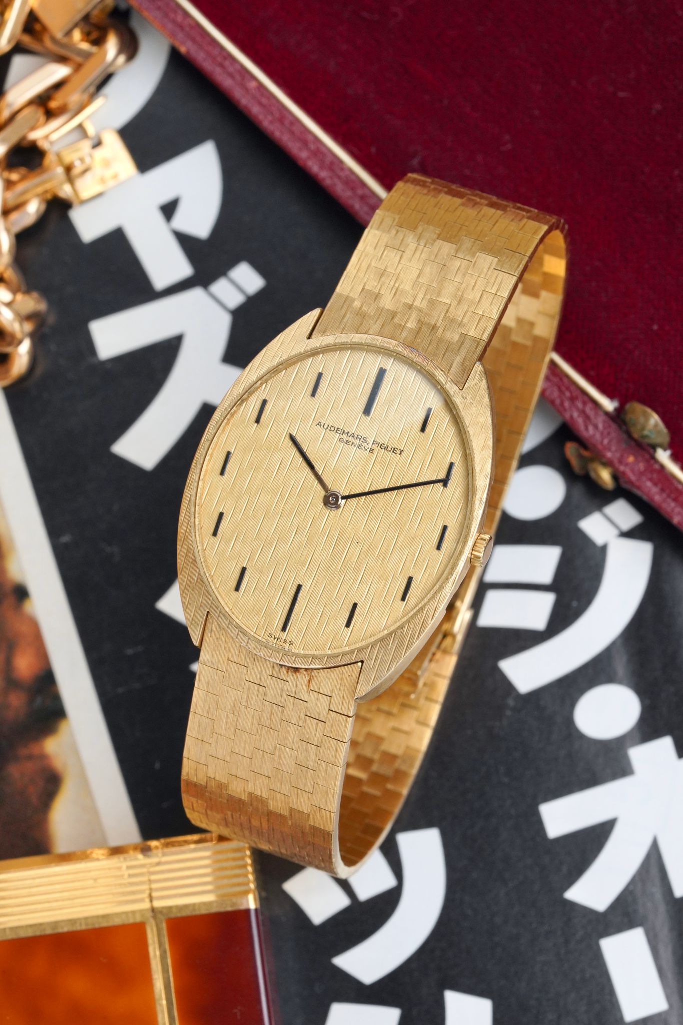 A very funky 1960s Audemars Piguet textured dress watch in 18K yellow gold with its original and long integrated style yet removable brick bracelet affixed to an exaggerated jumbo tonneau C shaped case, vertical applied onyx indices in absolutely razor sharp condition, powered by the manual wind cal. 2003.
