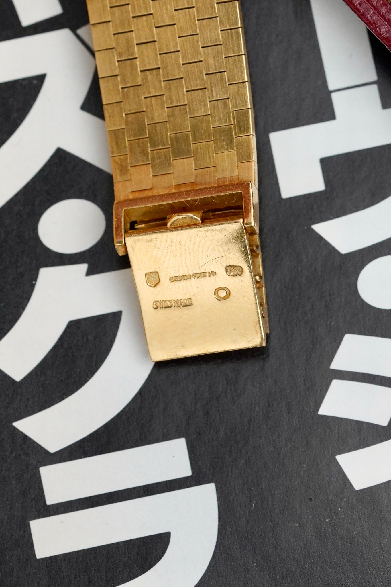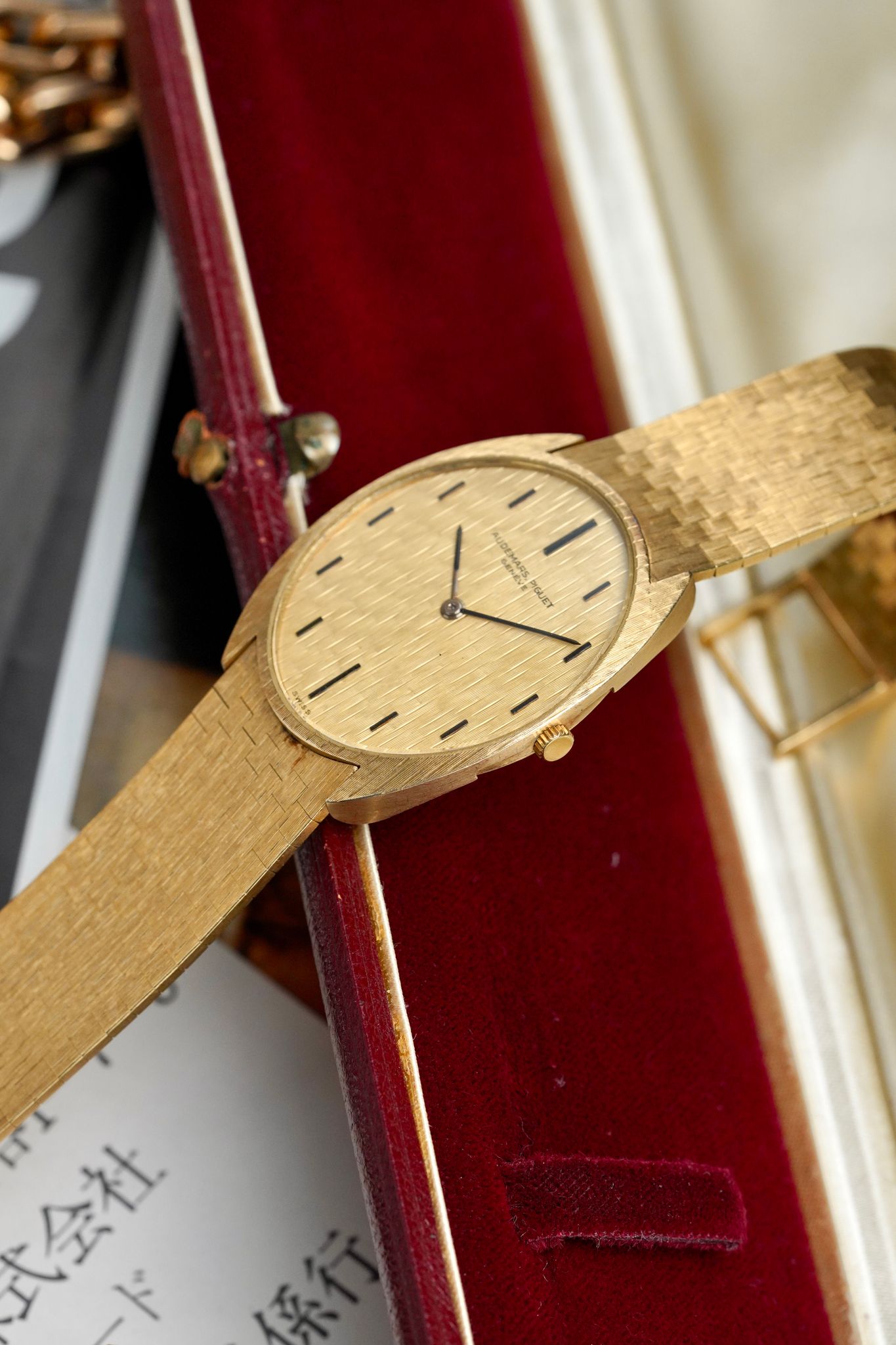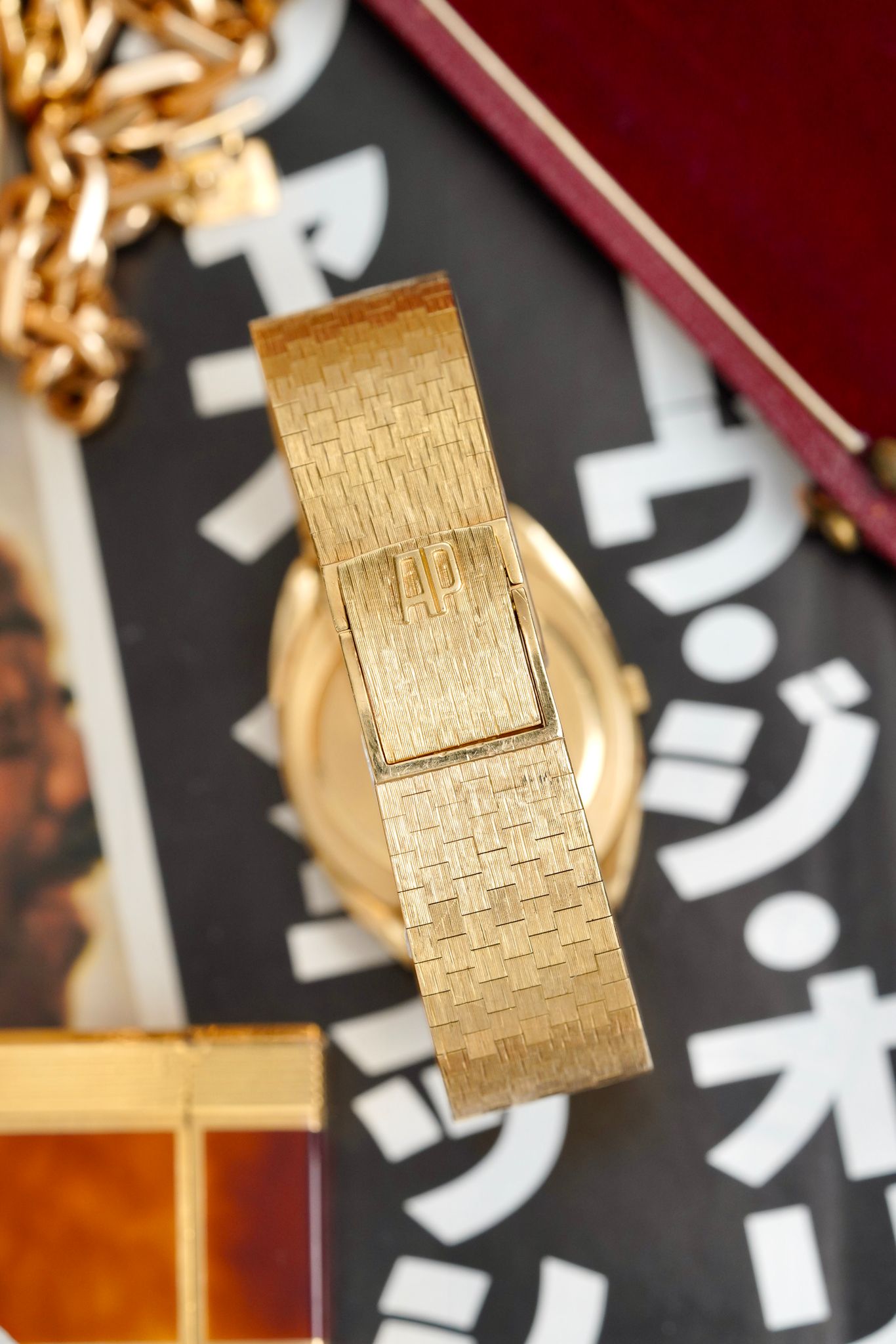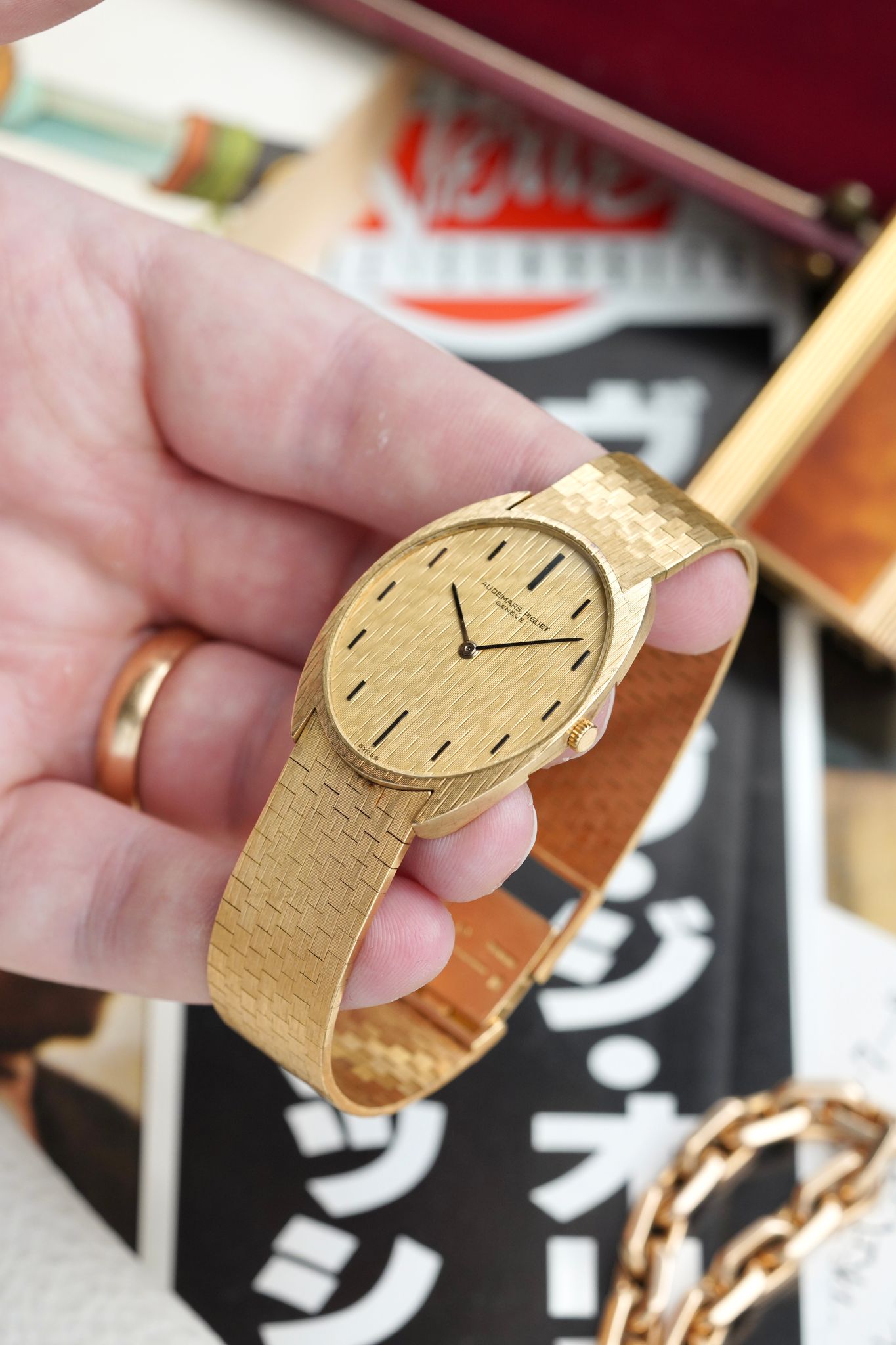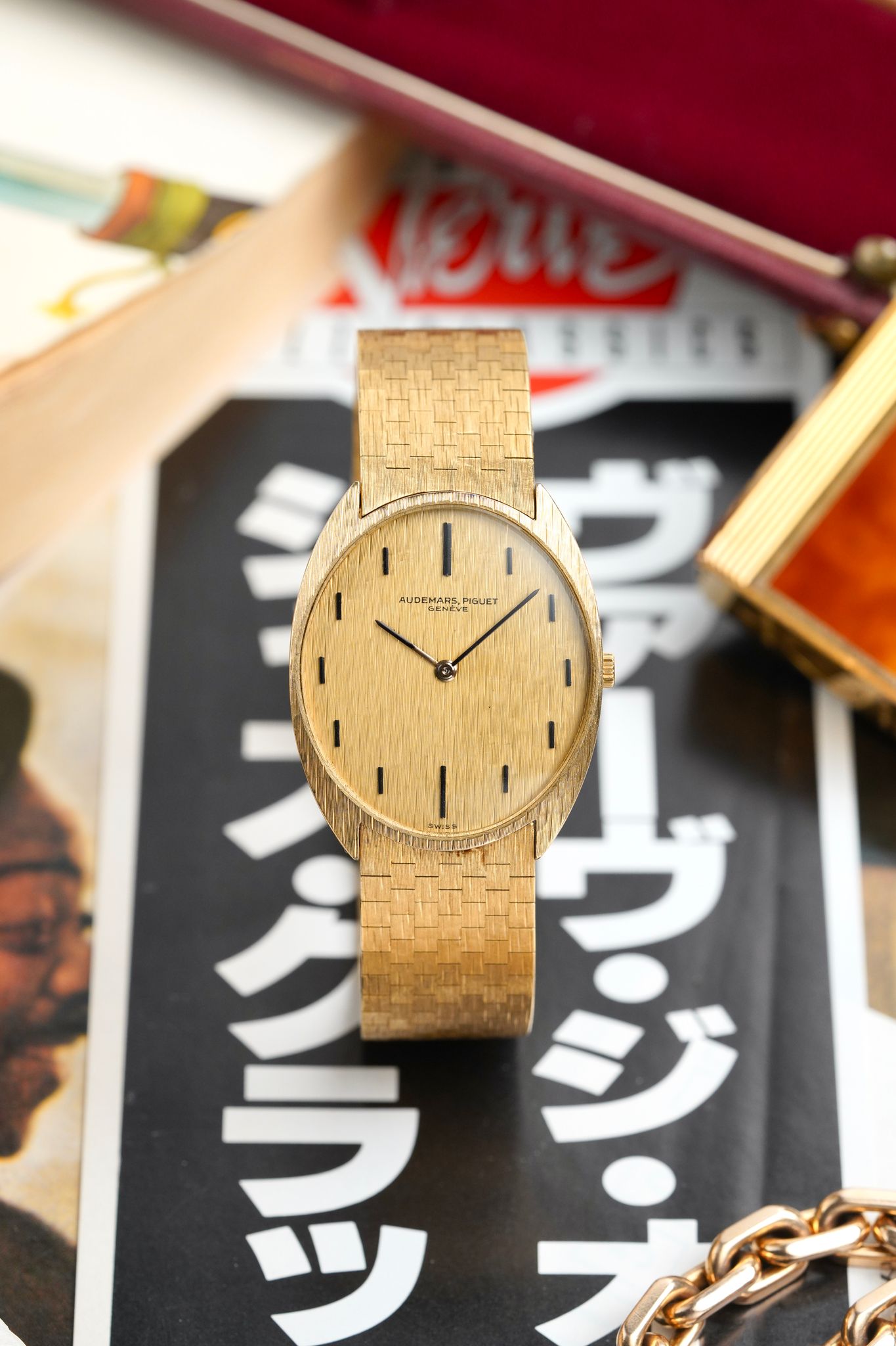 A very funky 1960s Audemars Piguet textured dress watch in 18K yellow gold with its original and long integrated style yet removable brick bracelet affixed to an exaggerated jumbo tonneau C shaped case, vertical applied onyx indices in absolutely razor sharp condition, powered by the manual wind cal. 2003.