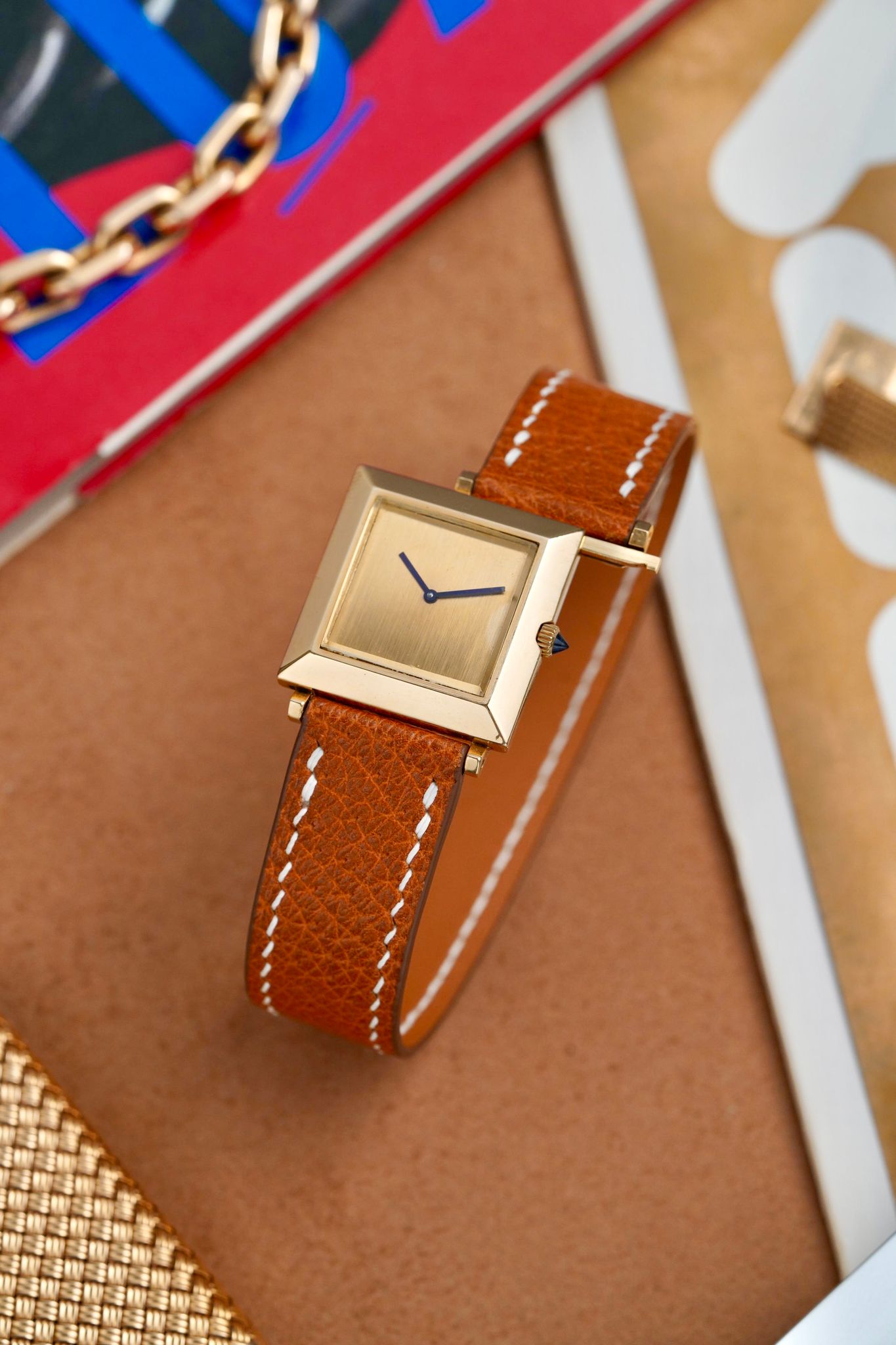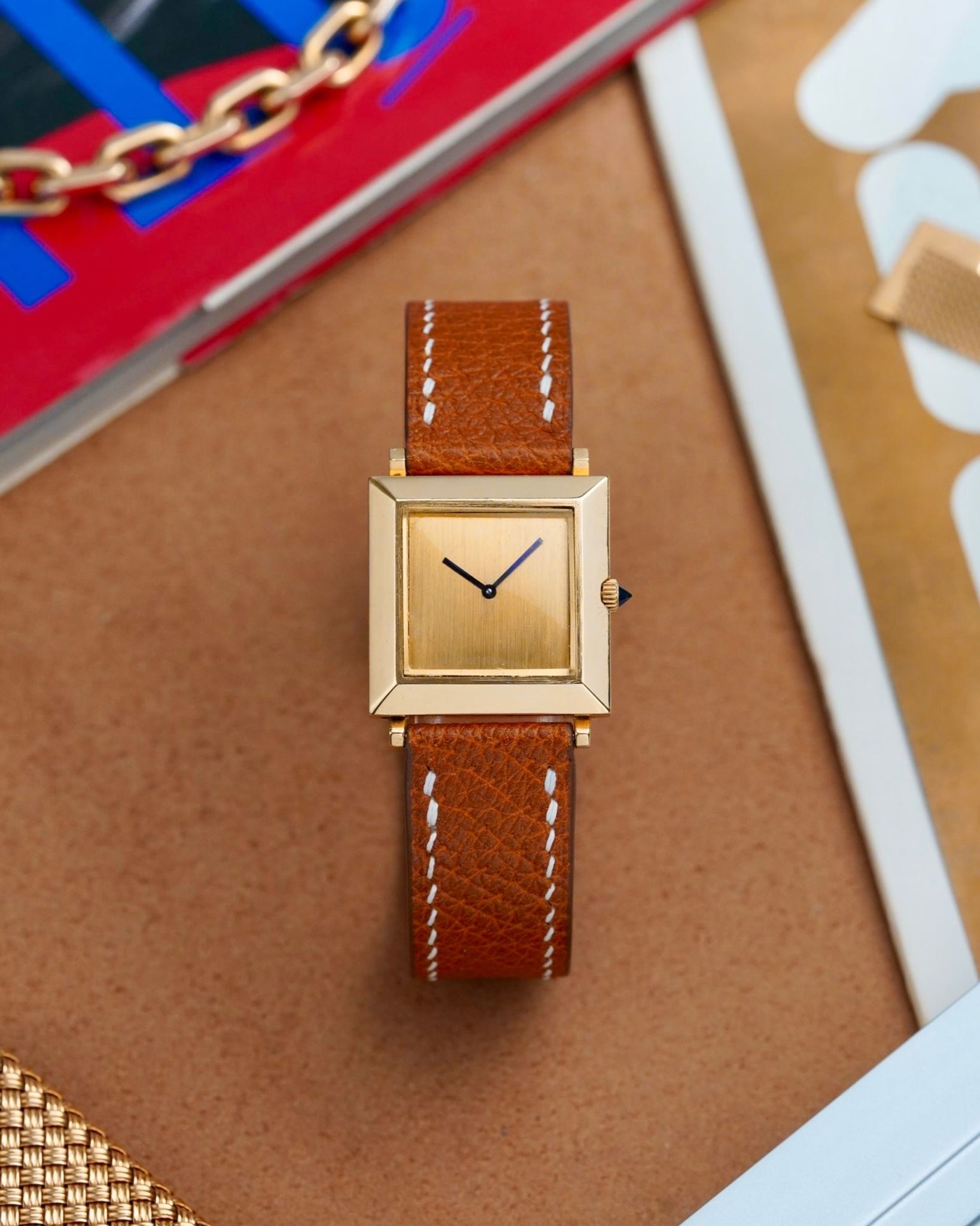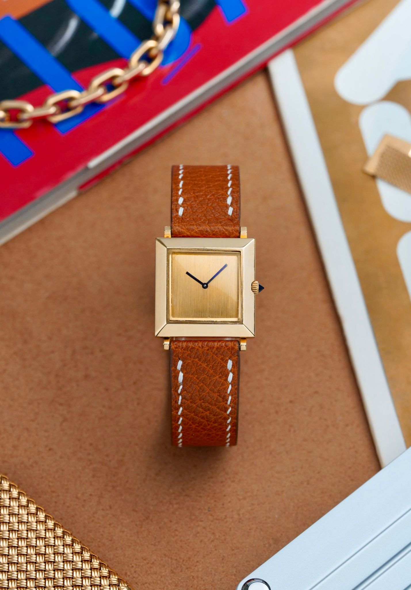 A beautiful and chic late 1960s Boucheron Carré in 18K yellow gold, a reflective mirror polished large format 25x25mm case, brushed dial, signature broad blue hands that are almost purple, sharp faceted sapphire crown and their famous patented sliding lug system, powered by a manually wound Boucheron caliber.