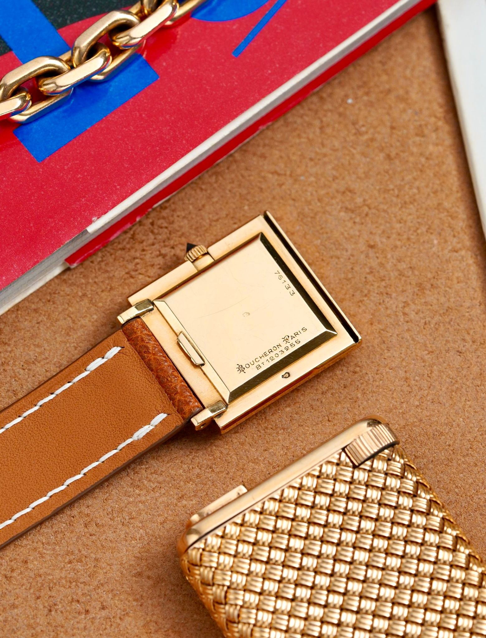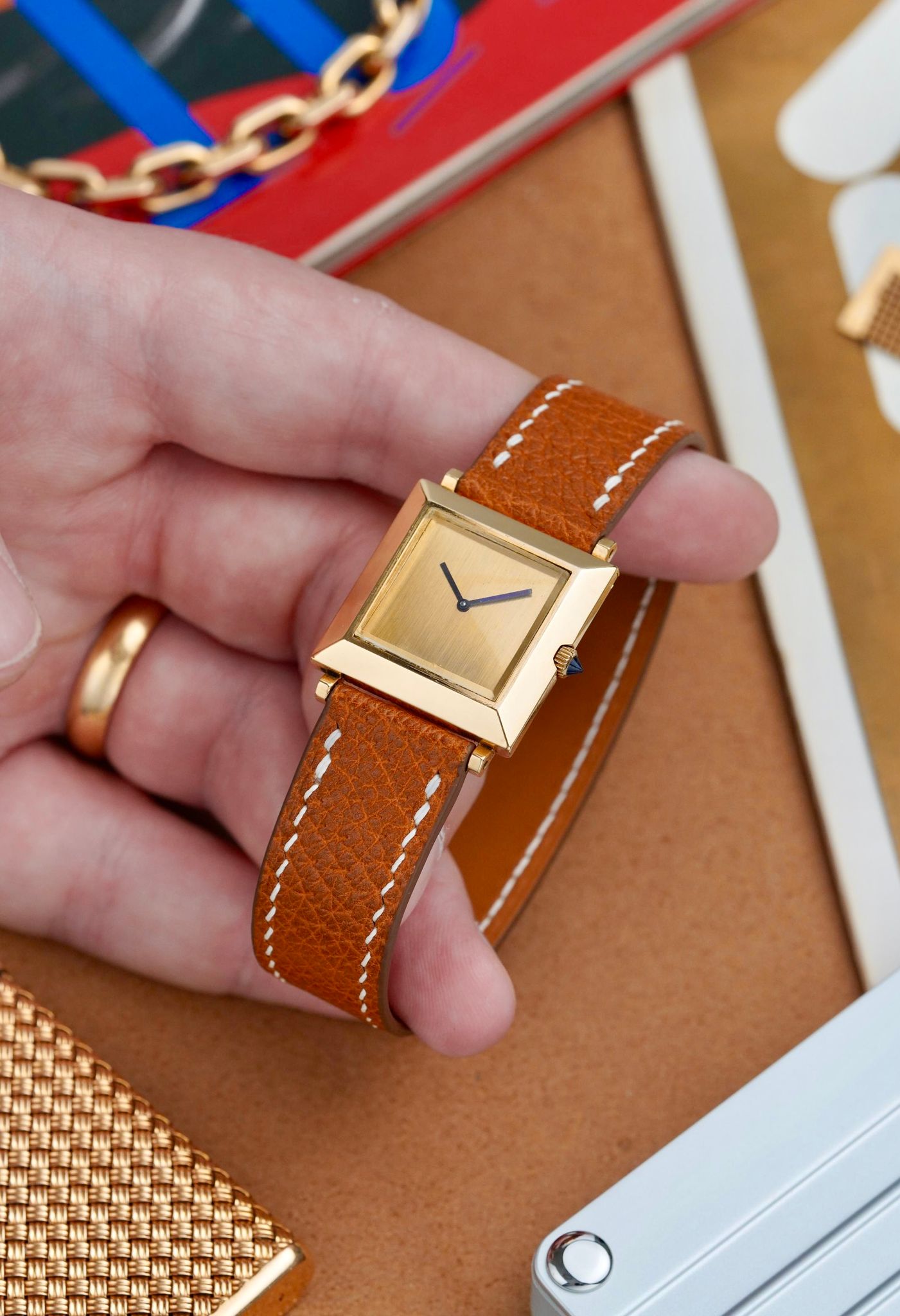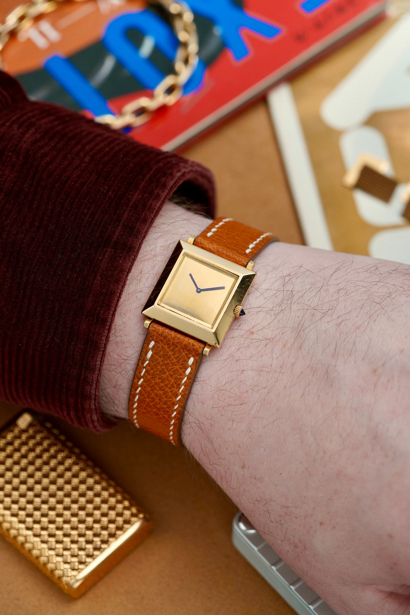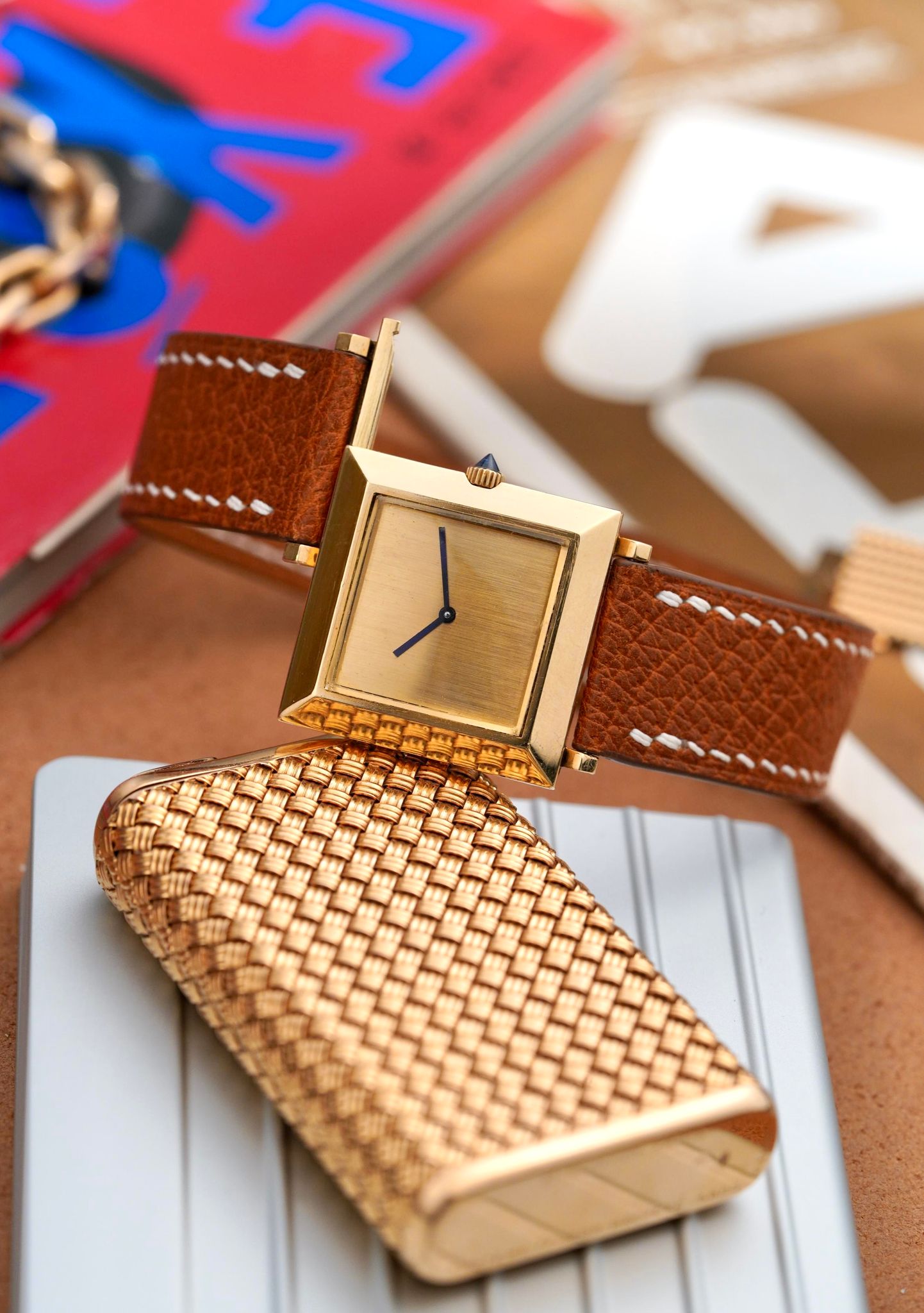 A beautiful and chic late 1960s Boucheron Carré in 18K yellow gold, a reflective mirror polished large format 25x25mm case, brushed dial, signature broad blue hands that are almost purple, sharp faceted sapphire crown and their famous patented sliding lug system, powered by a manually wound Boucheron caliber.