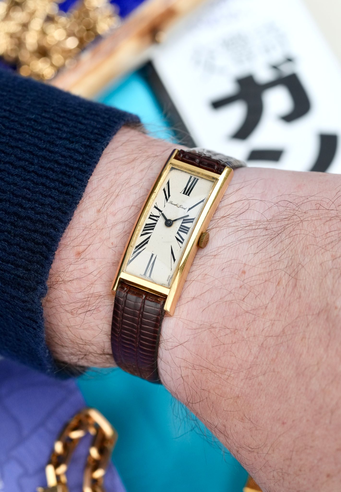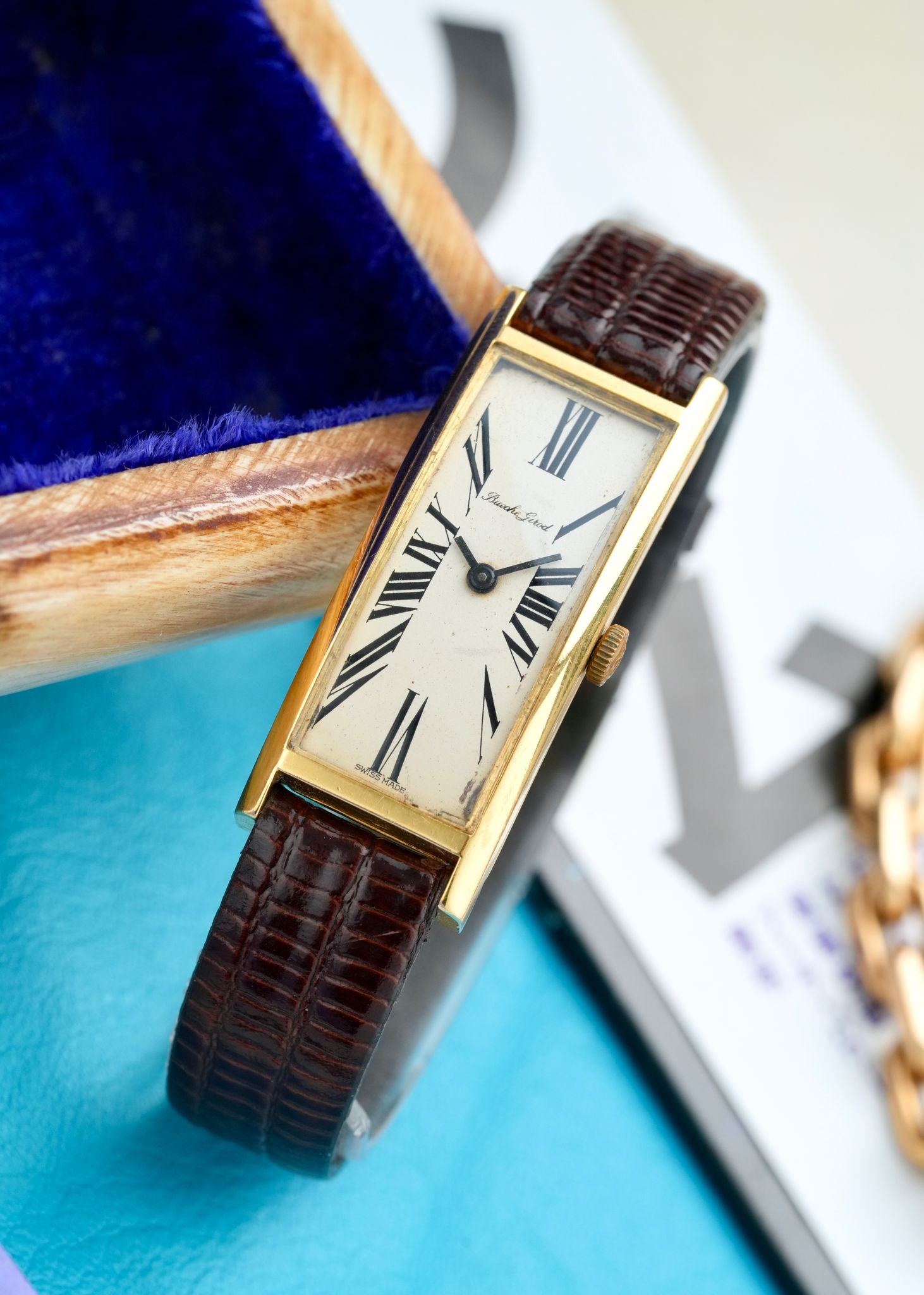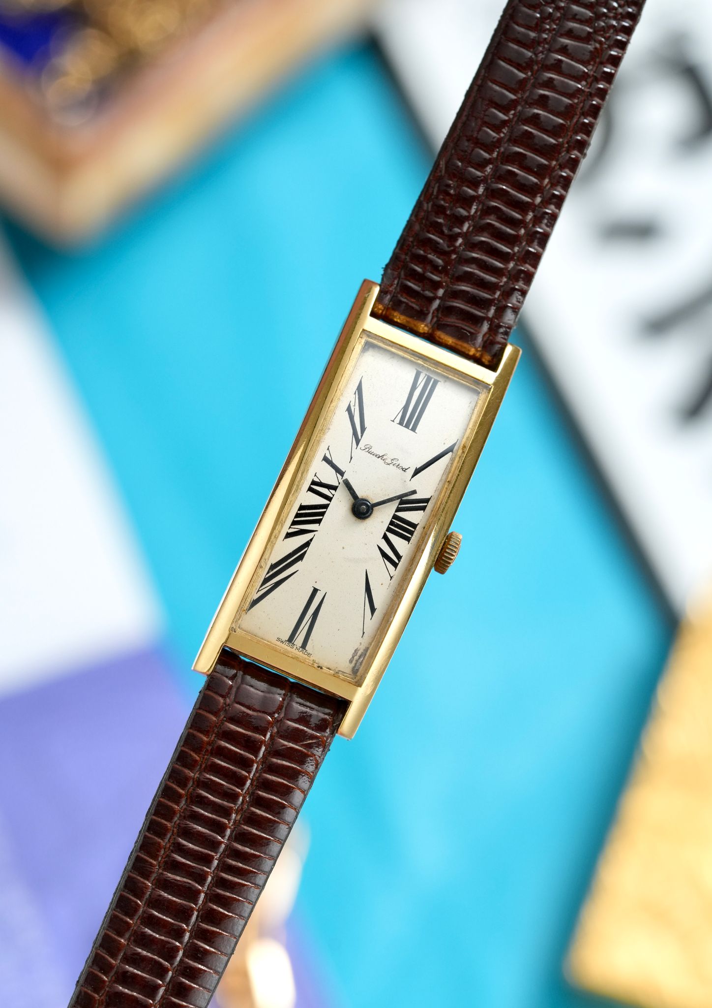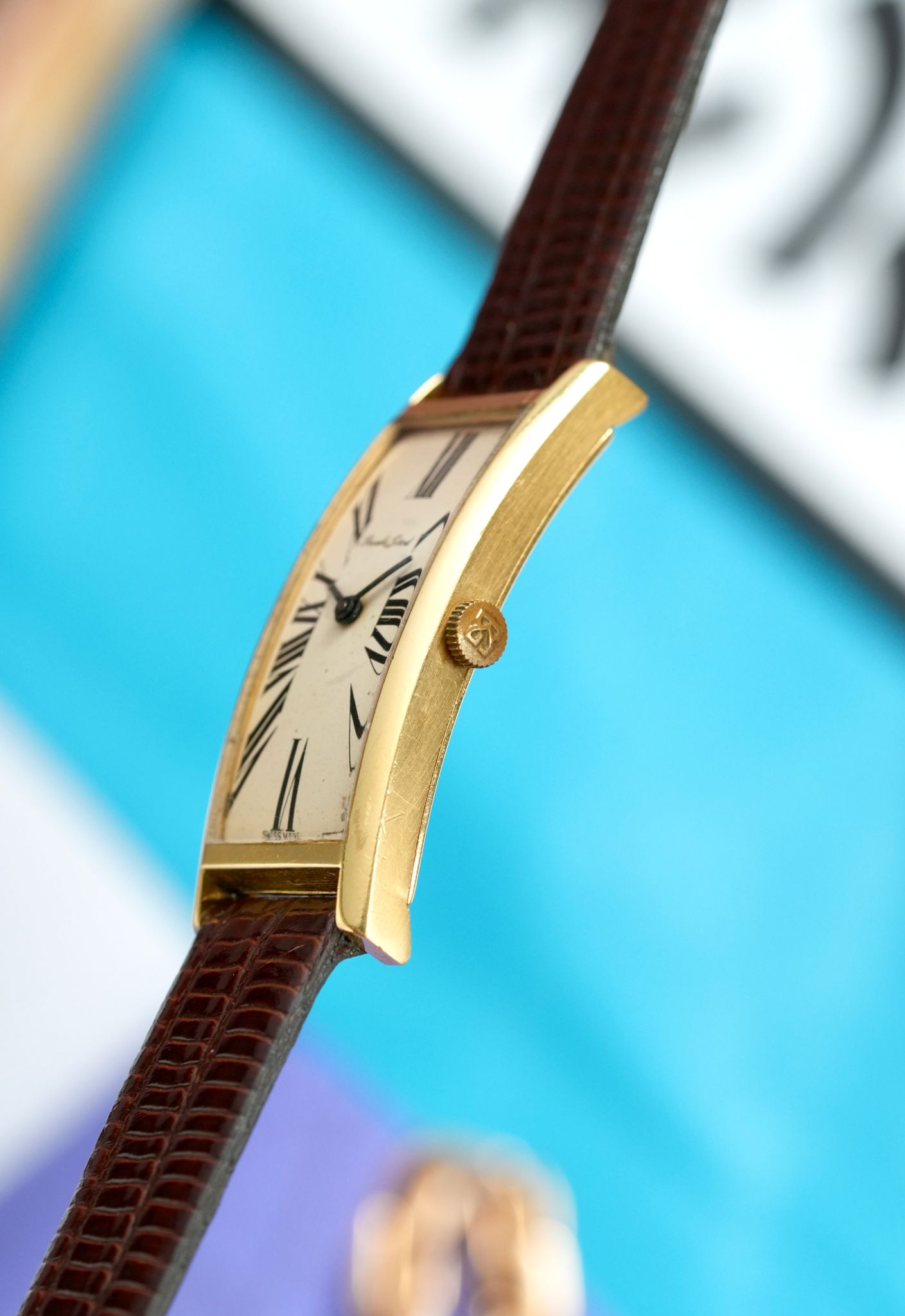 A very chic 1960s Bueche Girod Tank Cintreé Alongeé in a London crafted 18K curved and exaggerated long yellow gold case, the same proportions as the famous “Steve McQueen” Cartier version, with exploded Roman numeral dial, paired on a London hallmarked 18K yellow gold pin buckle, powered by a manually wound BG signed caliber.