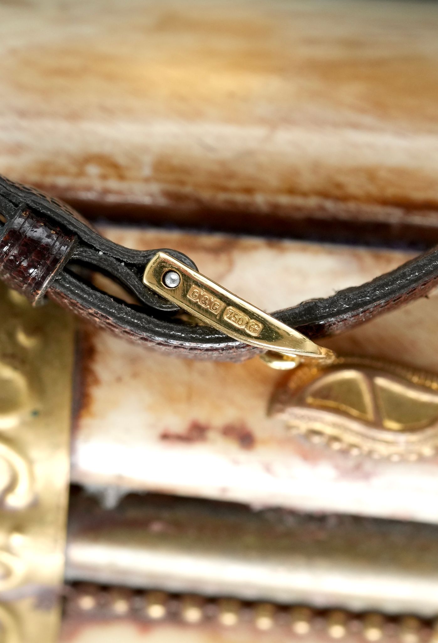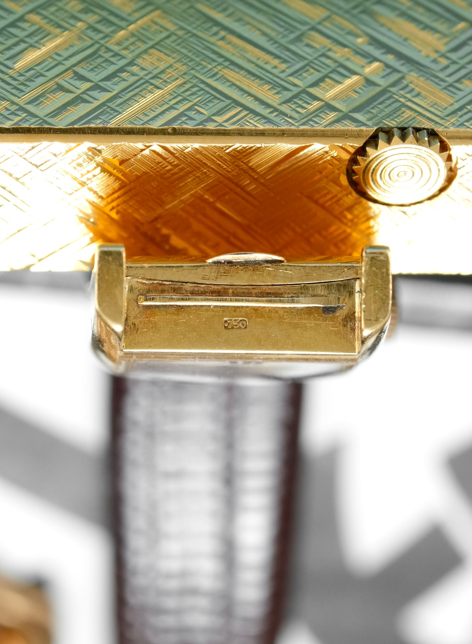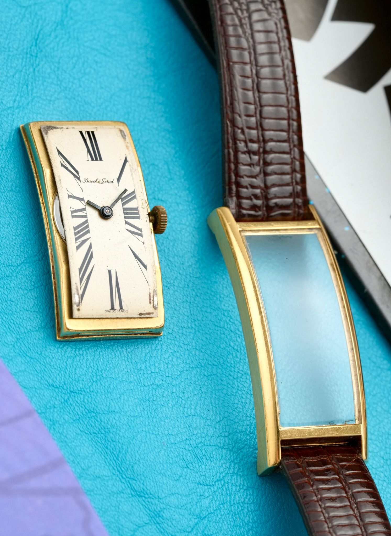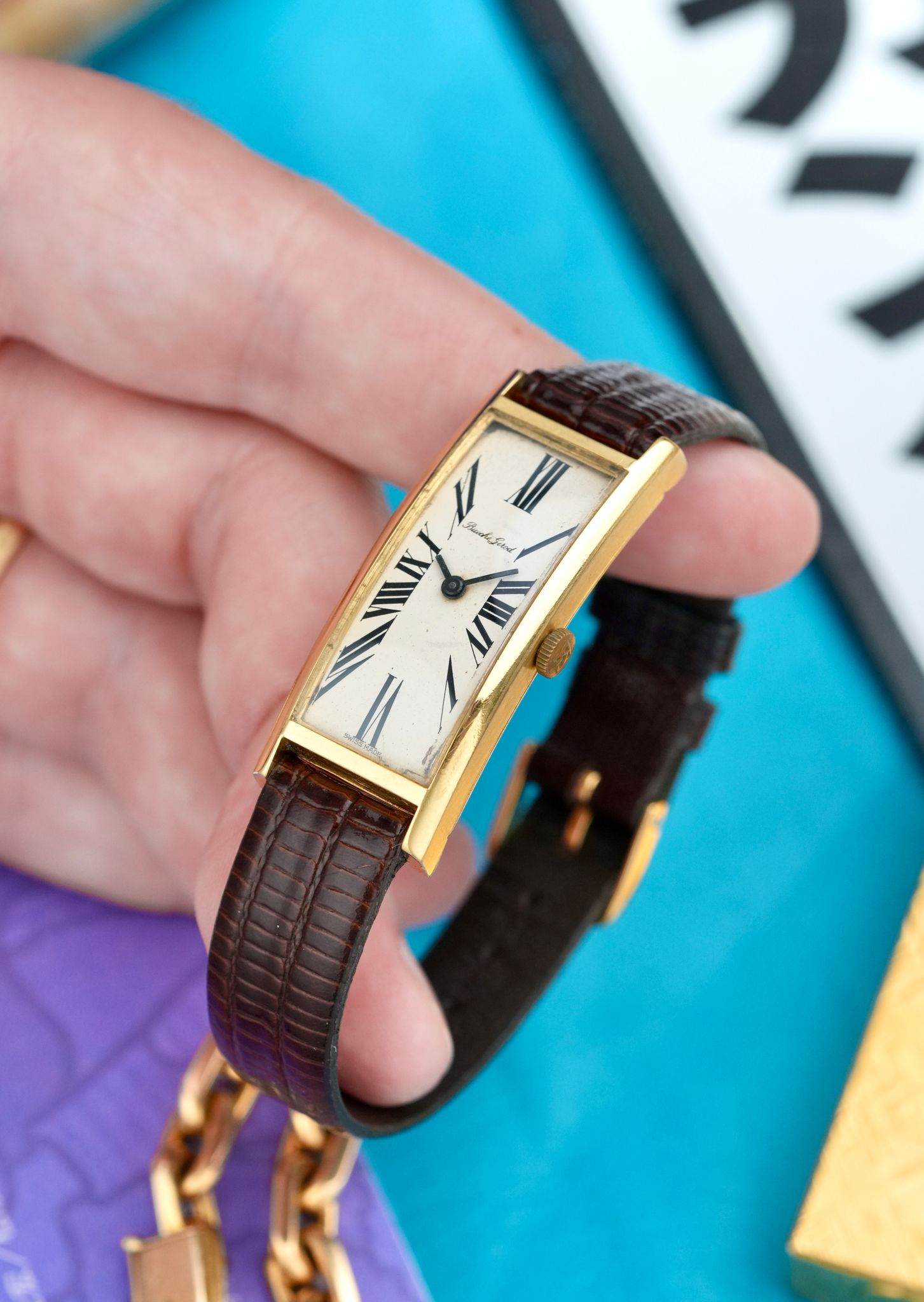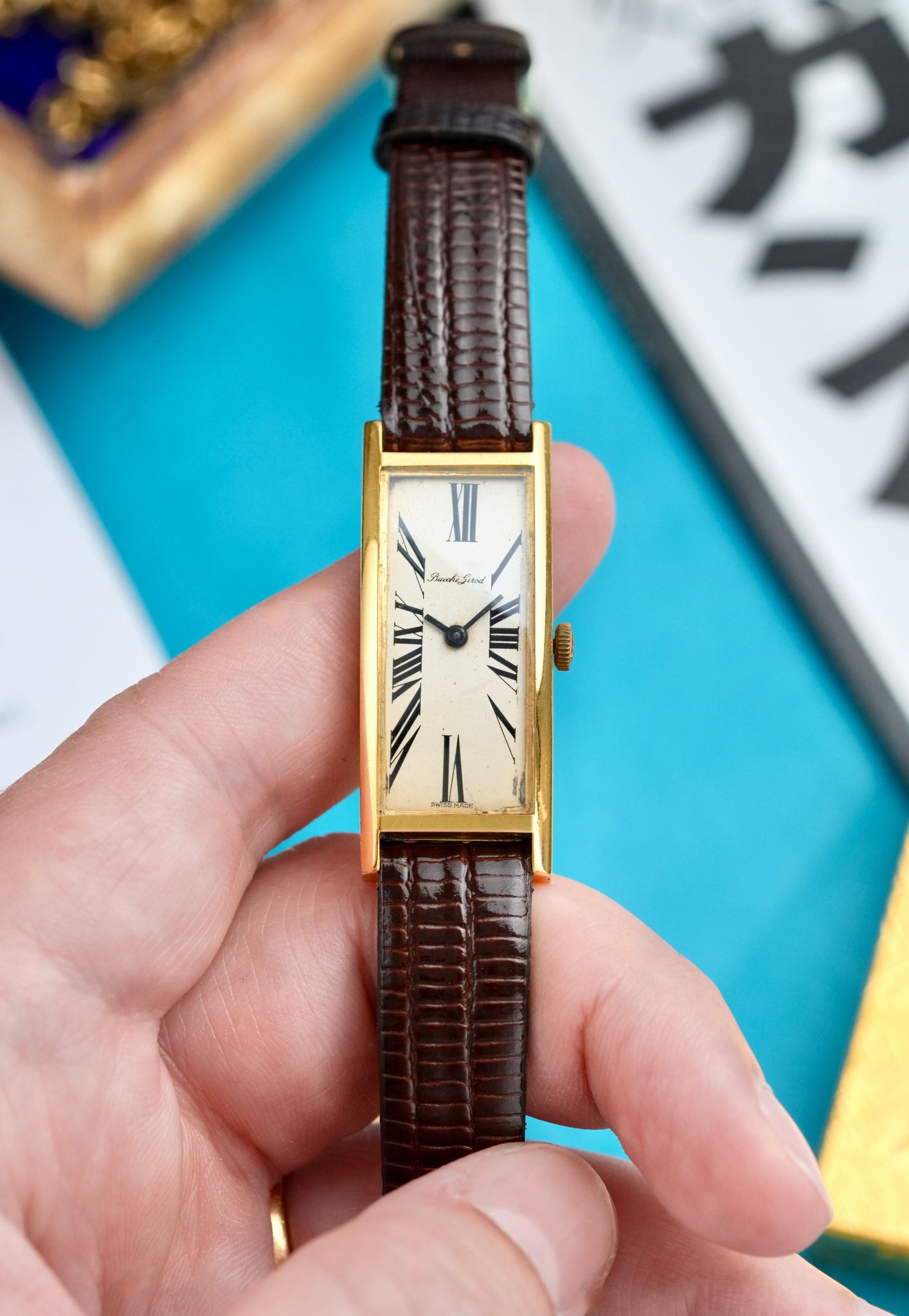 A very chic 1960s Bueche Girod Tank Cintreé Alongeé in a London crafted 18K curved and exaggerated long yellow gold case, the same proportions as the famous “Steve McQueen” Cartier version, with exploded Roman numeral dial, paired on a London hallmarked 18K yellow gold pin buckle, powered by a manually wound BG signed caliber.