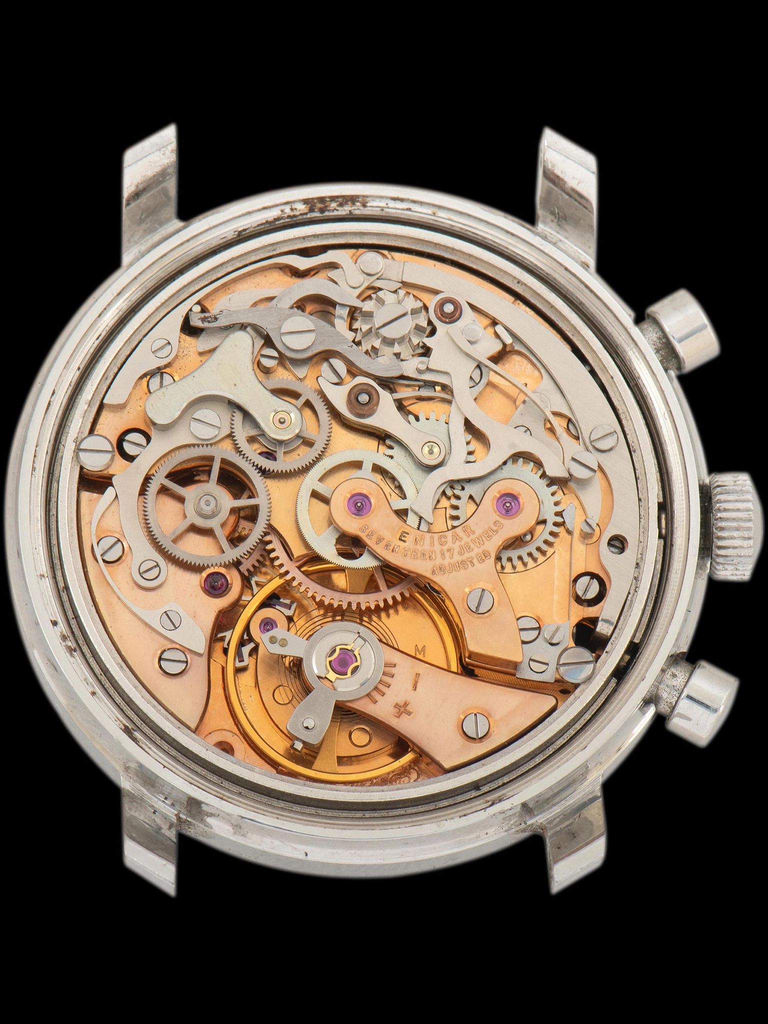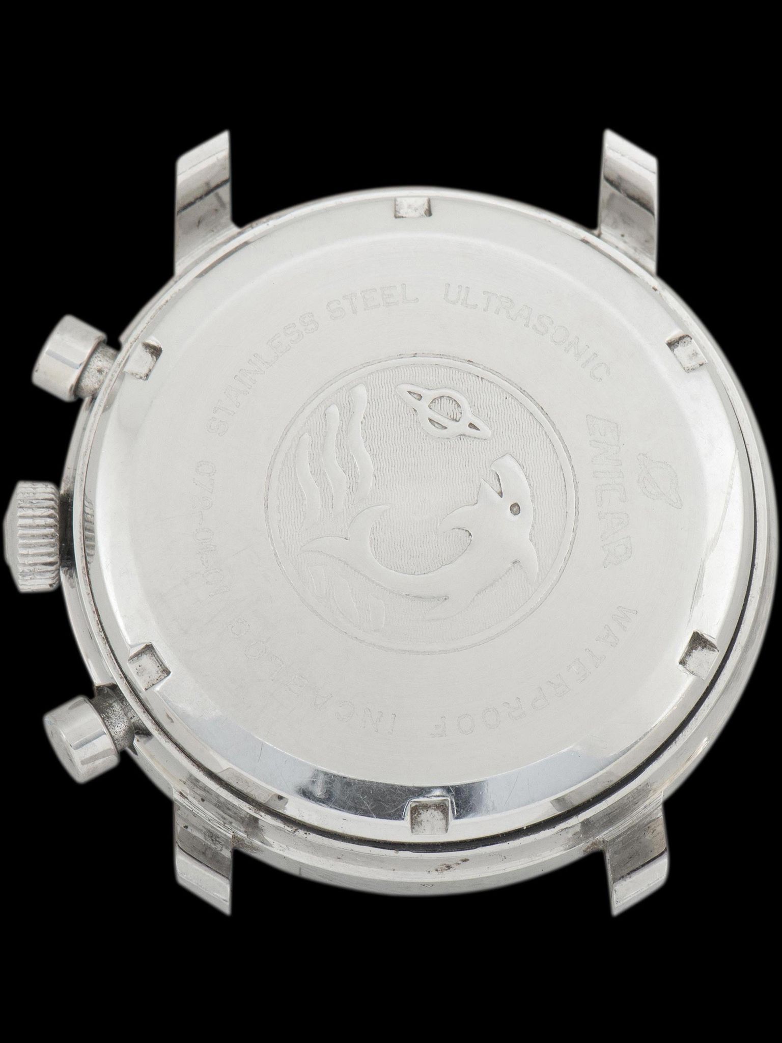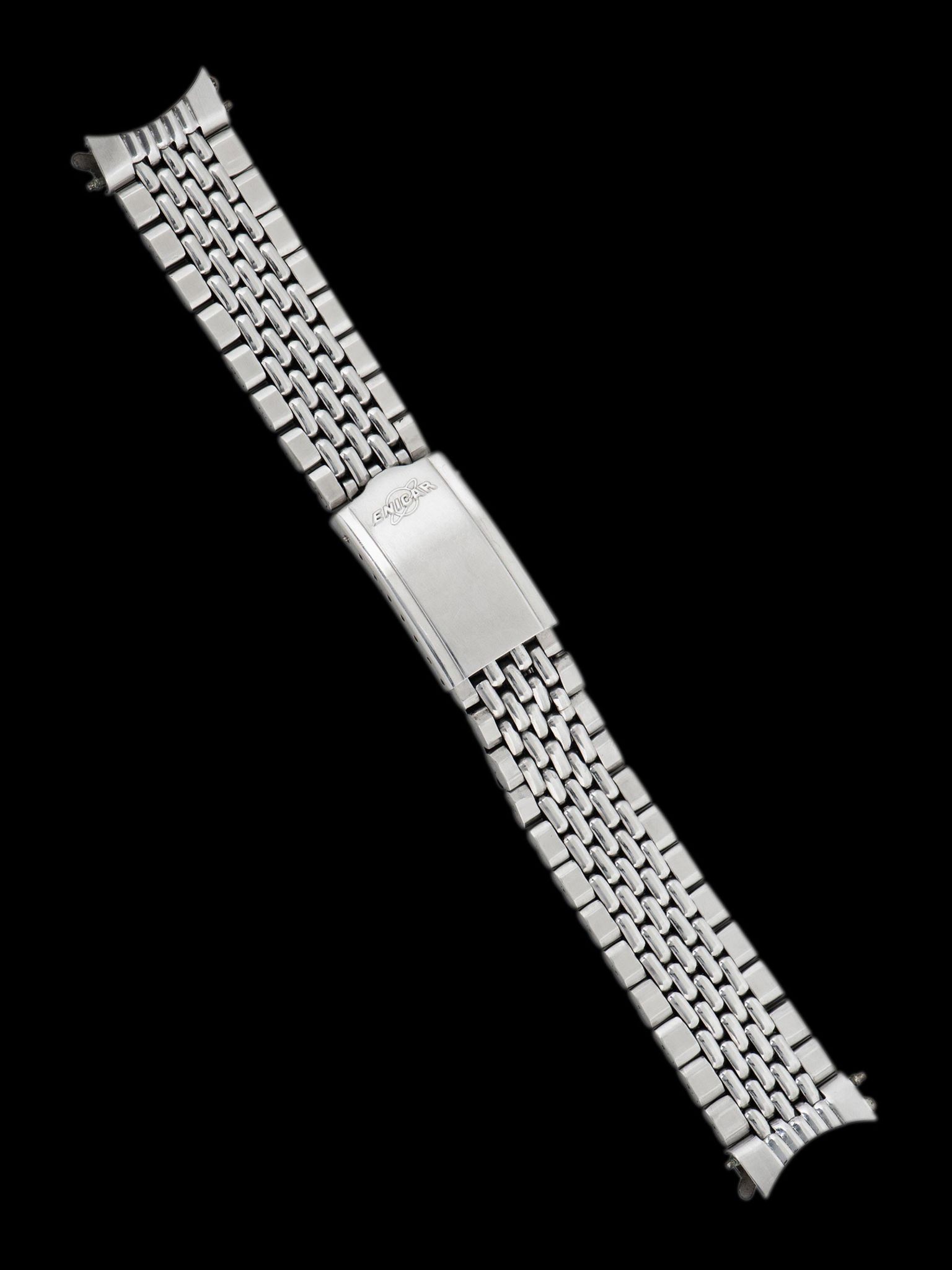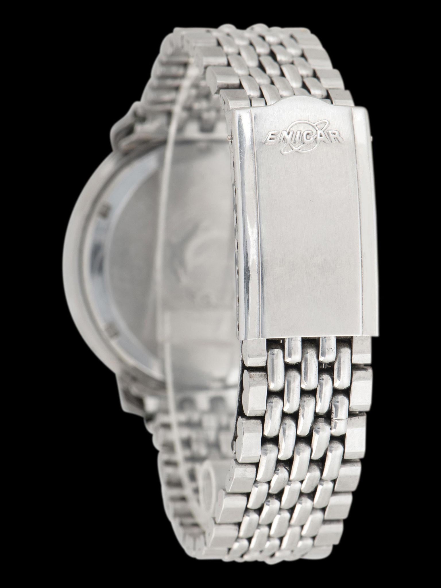 The case is in impressive vintage condition, displaying crisp edges and factory finishing throughout, with only light signs of previous use present. The case retains its original pump pushers and "Enicar" signed crown. The screw-down case back is in excellent condition, retaining all of its original factory engravings. The original Enicar "Beads of Rice" bracelet is in excellent condition and retains 20 links, fitting up to a 7.25-inch wrist.