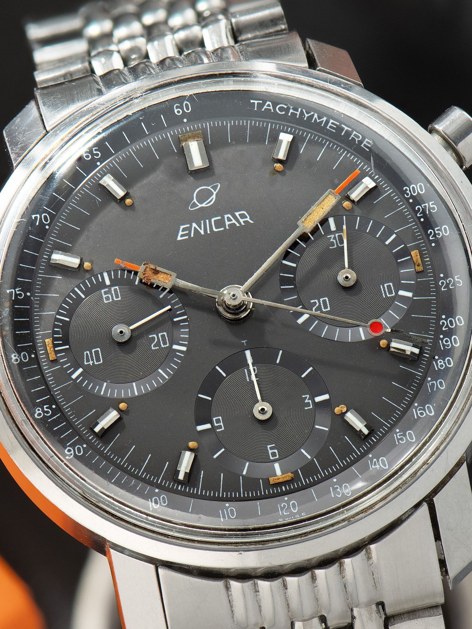 Not only is the Garnix mysterious, but it's also a rather impressive and handsome timepiece. The ref. 2303 Enicar is powered by the Valjoux 72 manual winding chronograph movement and features a unique dark grey dial with both satin and reflective textures that, unsurprisingly, work very well together. The Enicar ref. 2303 "Garnix" is collectible, though not extremely well-known, and being a stylish timepiece with a fun mystery gives the ref. 2303 it's "if you know, you know" character that collectors love.