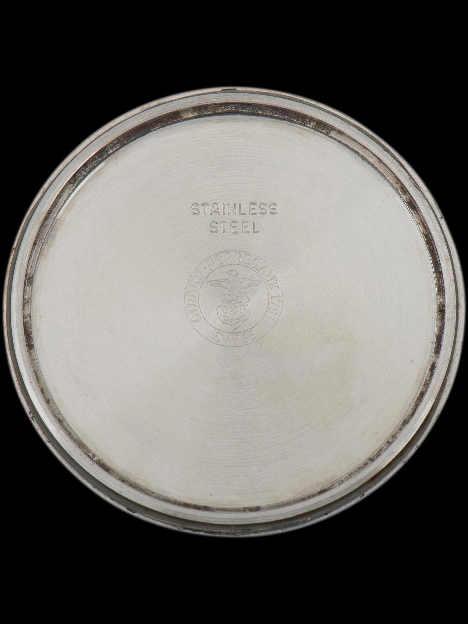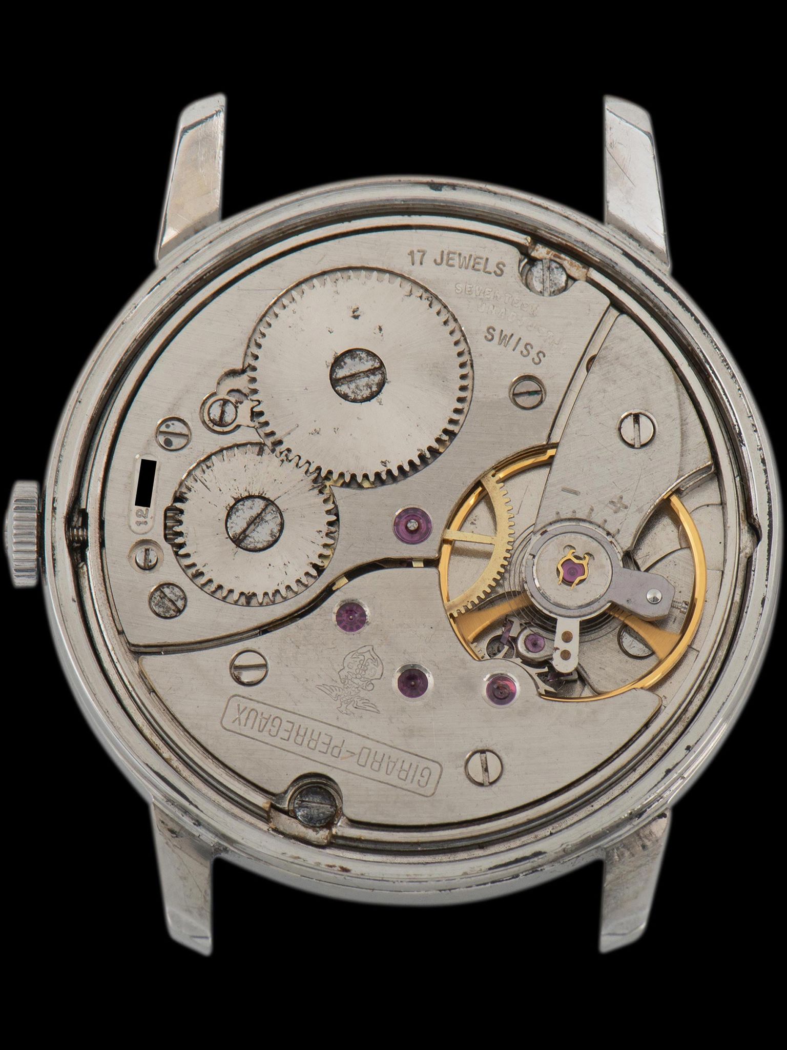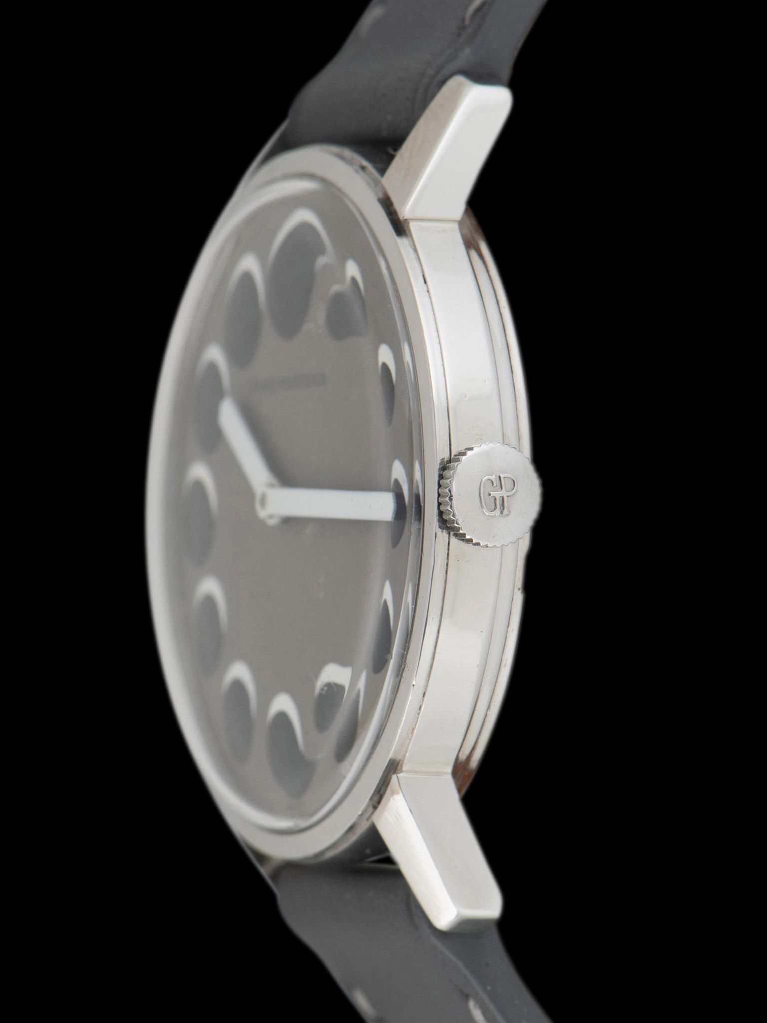 The excellent case exhibits minimal signs of previous use and no evidence of excessive polishing in the past, retaining thick and symmetrical lugs throughout. The "GP" signed crown is original to the watch. The case back retains its factory engravings in deep and crisp condition with light tool wear present. The watch comes supplied on a 2pc black leather strap.
