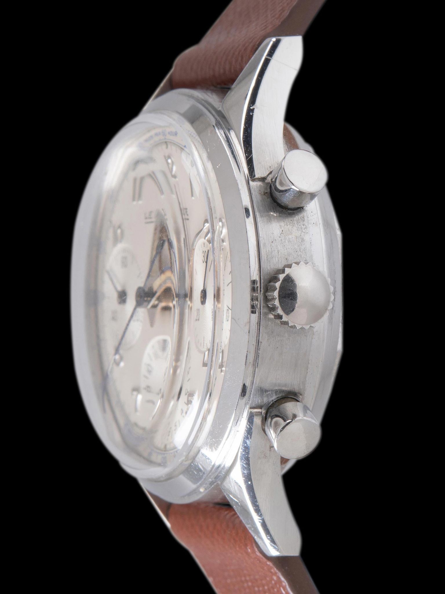 and the pump pushers are believed to be original to the watch. The screw-down case back is in good condition with some scratches but deep, highly legible factory serial markings. The watch comes supplied on a 2pc handmade leather strap.