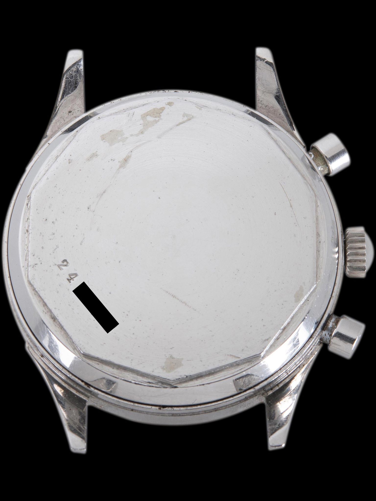 The stainless steel case exhibits light signs of gentle polishing in the past with some signs of previous use. The unsigned crown