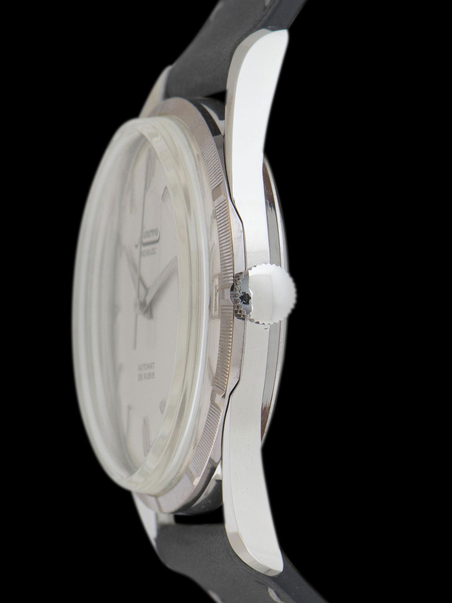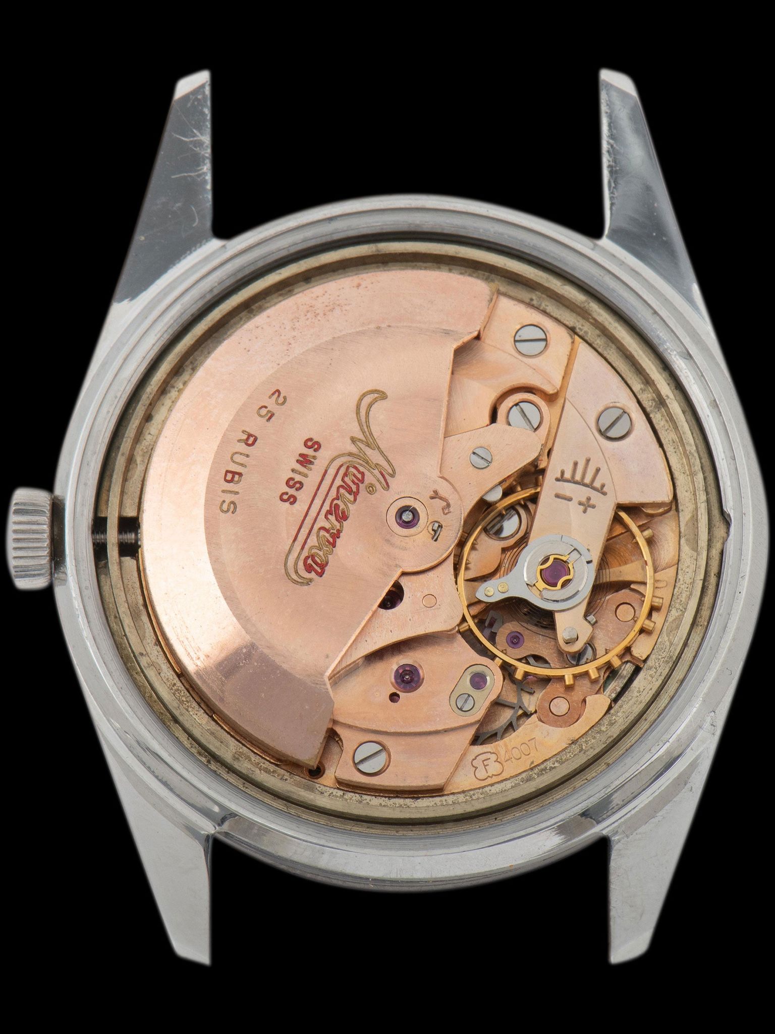 The original silver dial exhibits a subtle warmth that enhances the exquisite vintage aesthetic with a pie-pan-esque design, and shows no major age or damage present. The original dauphine-style hands are in exceptional condition and show no significant signs of wear or age.
