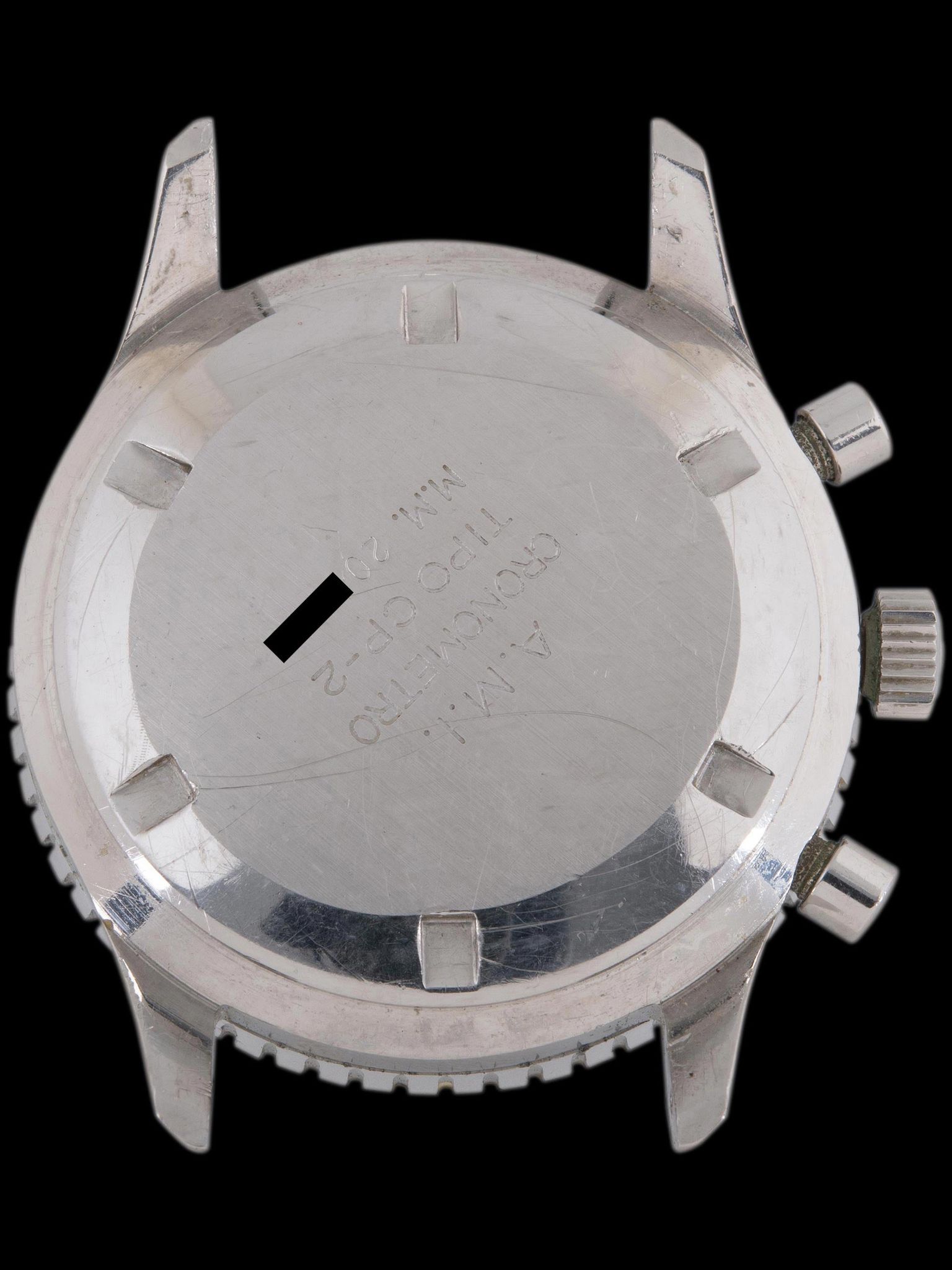 The beautiful matte black "A. Cairelli" dial is exceptionally well preserved. The original dial printing remains perfectly intact. The tritium Arabic numerals have aged to a charming sandy-ivory coloration and exhibit no lume degradation when inspected under UV light. The original tritium hands match the dial perfectly with no degradation present under UV light inspection. The chronograph and sub-dial hands are painted white and exhibit minor paint loss which is very common to see in this era.
