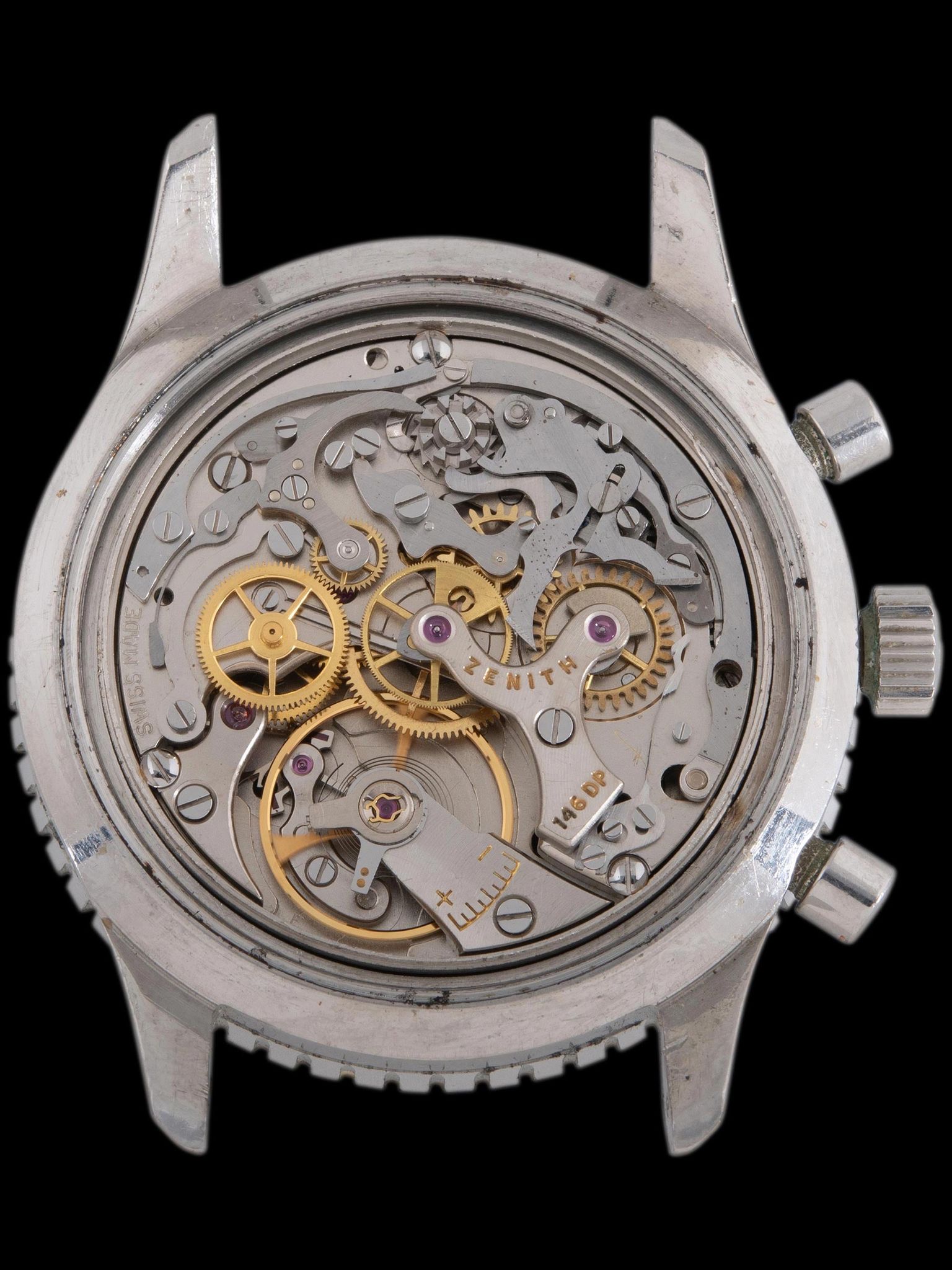 The large and robust stainless steel case remains in excellent condition, showing honest wear but still retaining its original shape with crisp chamfers present down the long, sharp lugs. The rotating bezel is in good condition, showing minor wear around the edges and light fading, the lume triangle at 12 o'clock remains intact and all the numerals are still highly legible and in great shape. The case retains its original pump pushers and Zenith-signed crown. The case back clearly displays all of the military engravings in deep and crisp condition. The watch will come supplied on a single-pass fabric strap