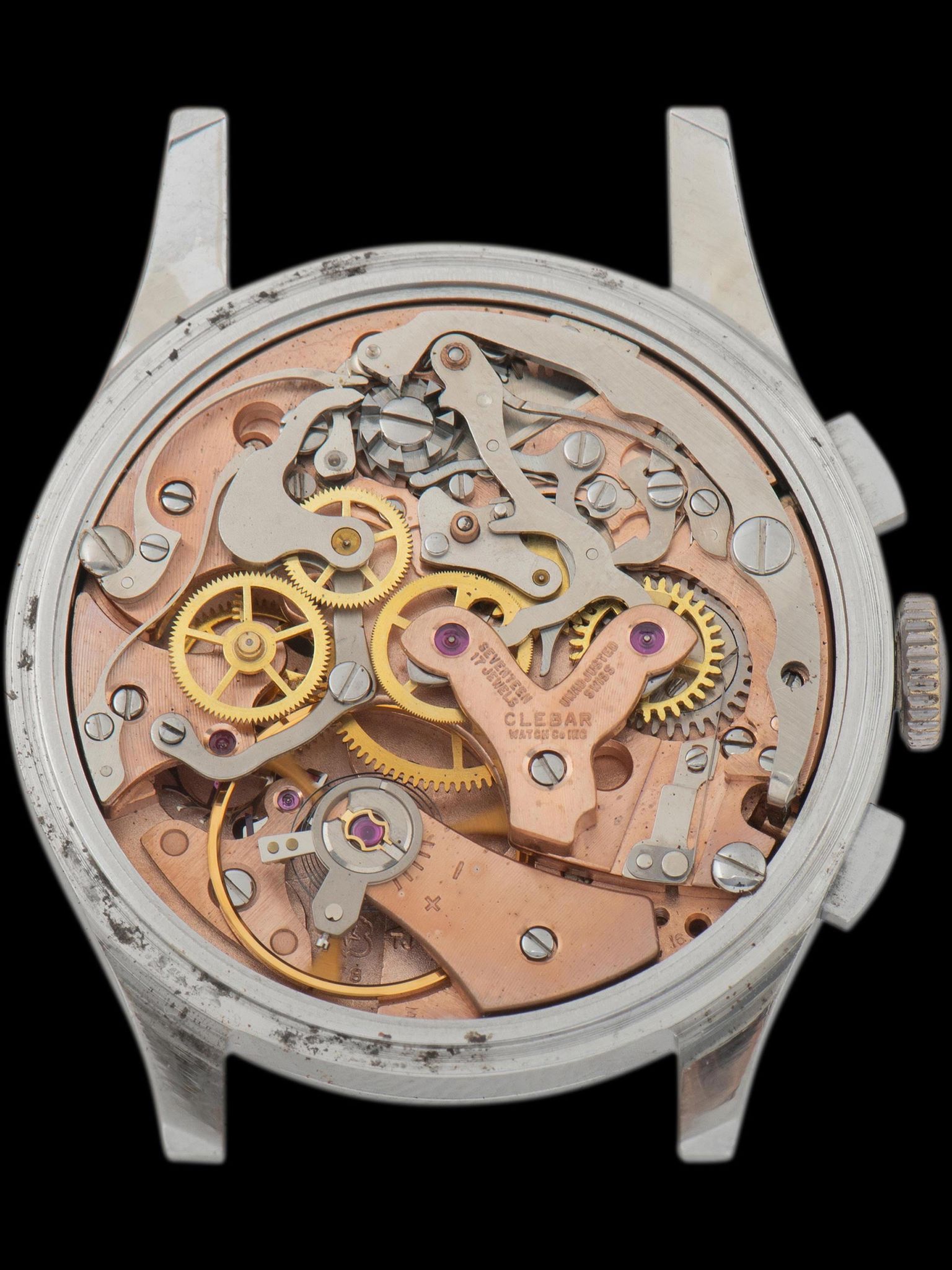 The crisp and handsome case exhibits minimal evidence of previous polishing and shows light signs of honest use present. The case retains its original unsigned crown and pump pushers. The case back features its original factory engravings deep and legible. The watch comes supplied on a 2pc handmade leather strap.