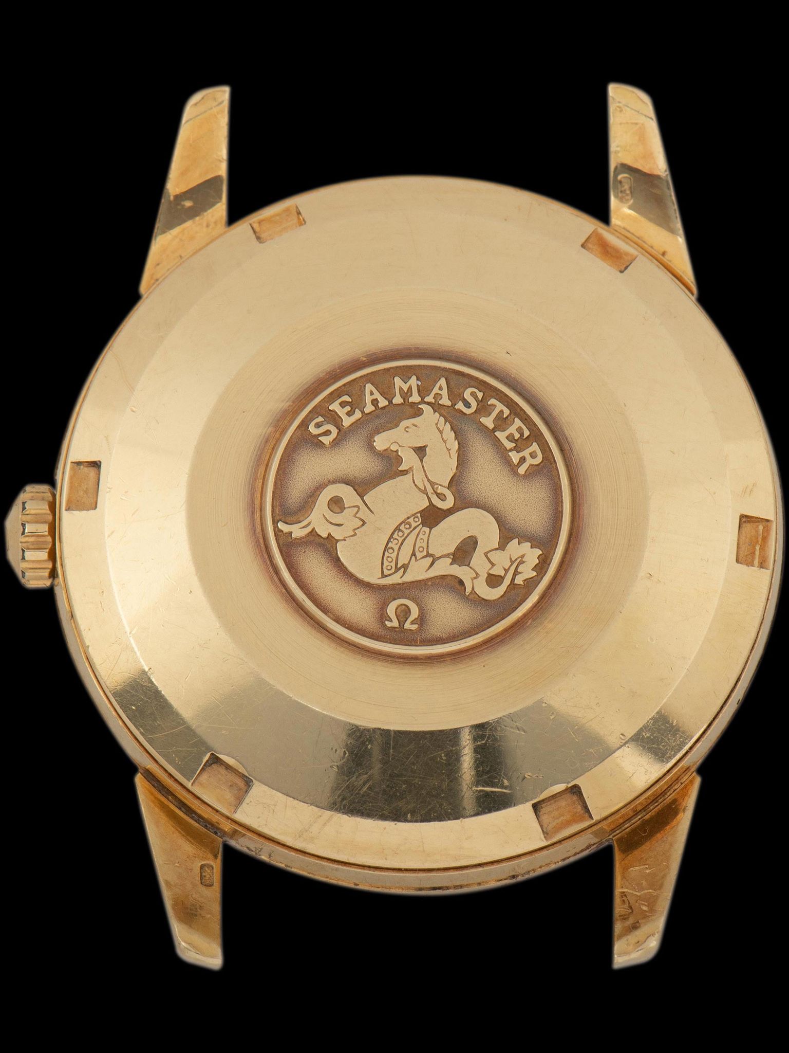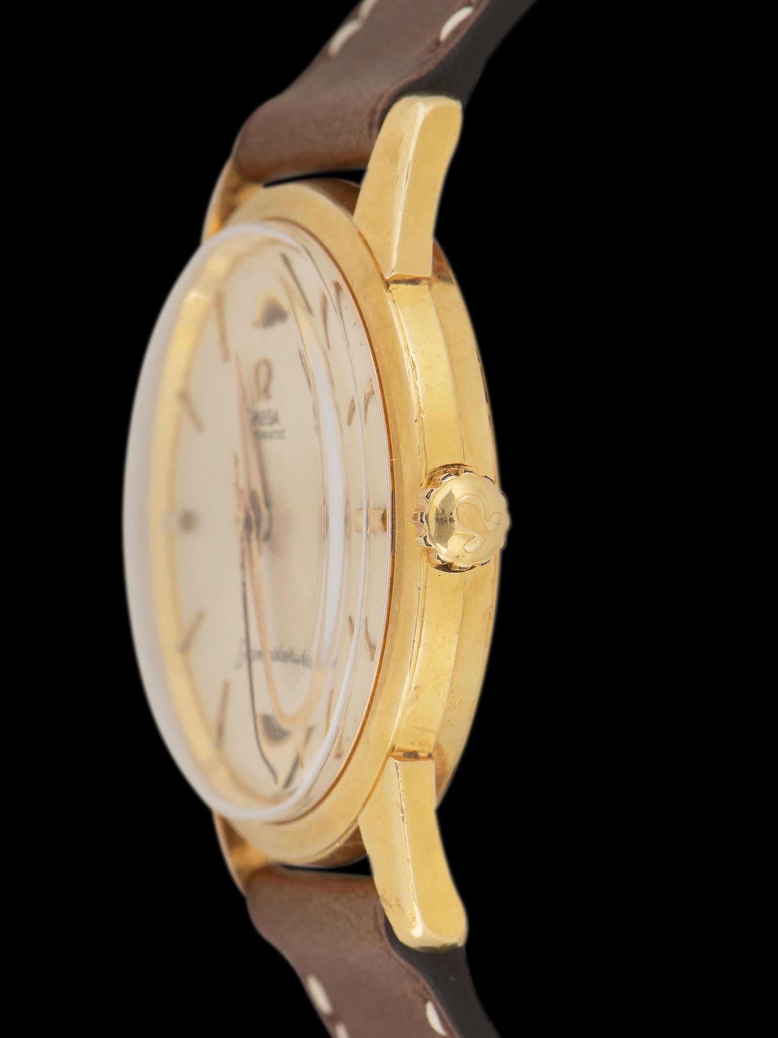 The 18K yellow gold case appears to remain unpolished, showing very crisp finishing throughout, with the original lug chamfers remaining intact with some softening present from wear. The case retains its original Omega-signed crown. The screw-down case back retains impressive factory finishing with the original Seamaster medallion fully present. The watch comes supplied on a 2pc handmade leather strap.