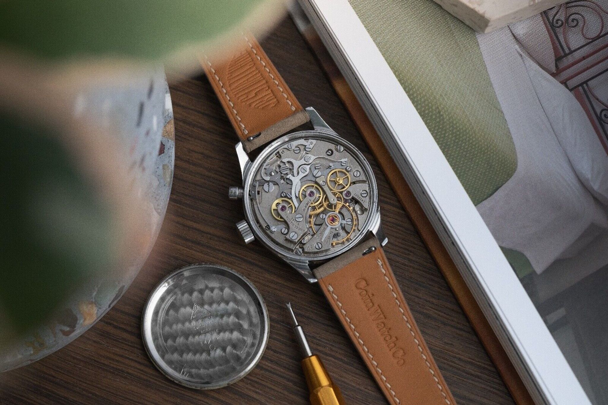 The details on this example are impeccable, considering it was issued in 1962 and likely saw some active duty in the Canadian Royal Air Force in its day. Inside is the manual winding Cal. 2221 Lemania chronograph, which is made that much cooler by the fact that it hacks. Adding a little more character are the lume pips extending into the dial and the engine turned subsidiary dials for the running seconds and 30 minute recording. The steel case has a screw back engraved with military numbers HA-62-1361 6W/16 and 34/62 inside.