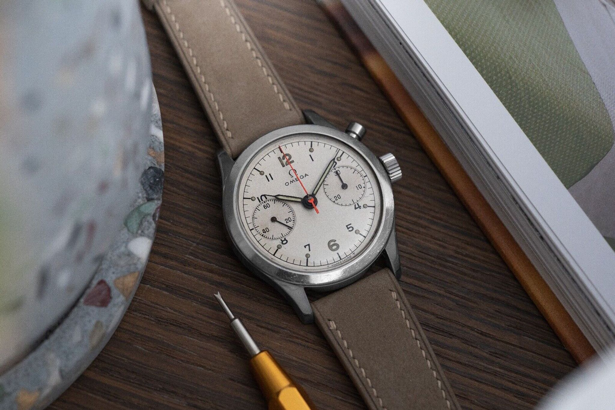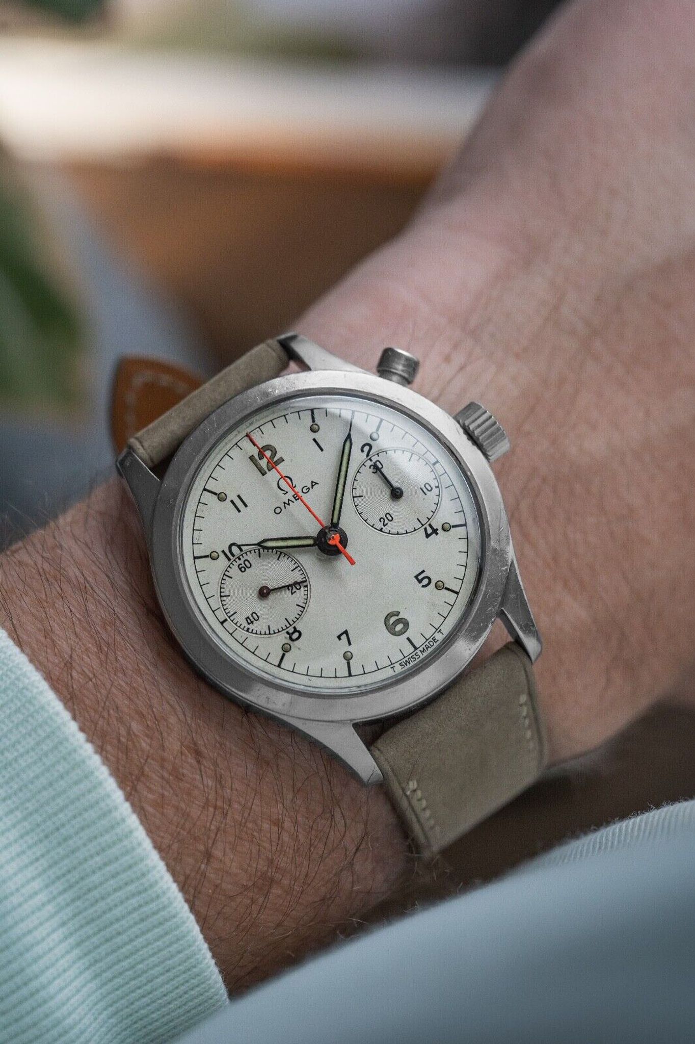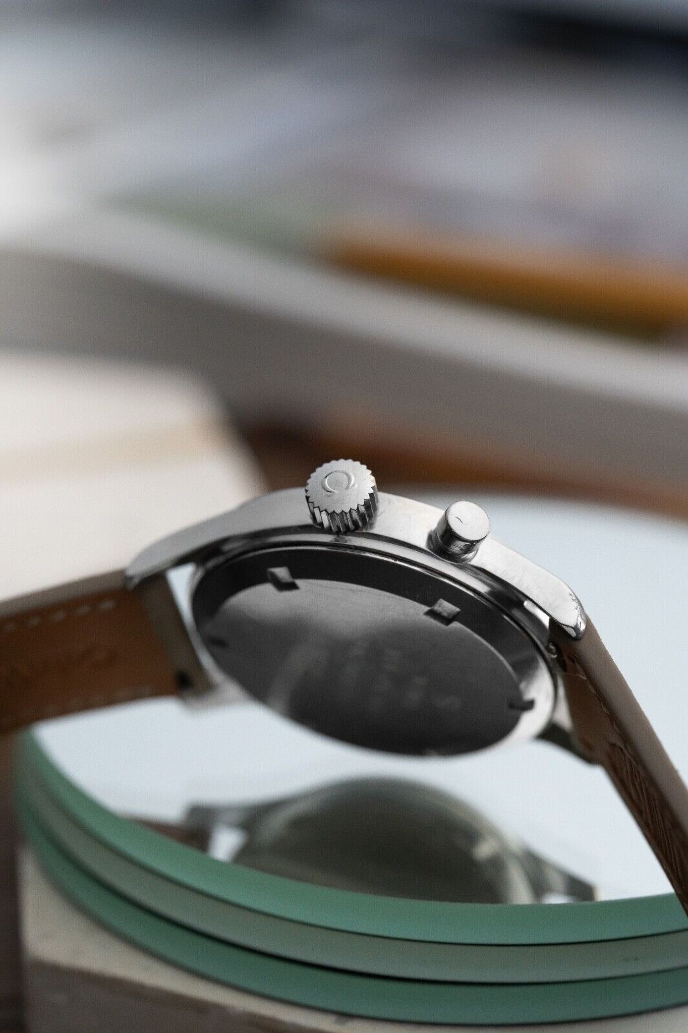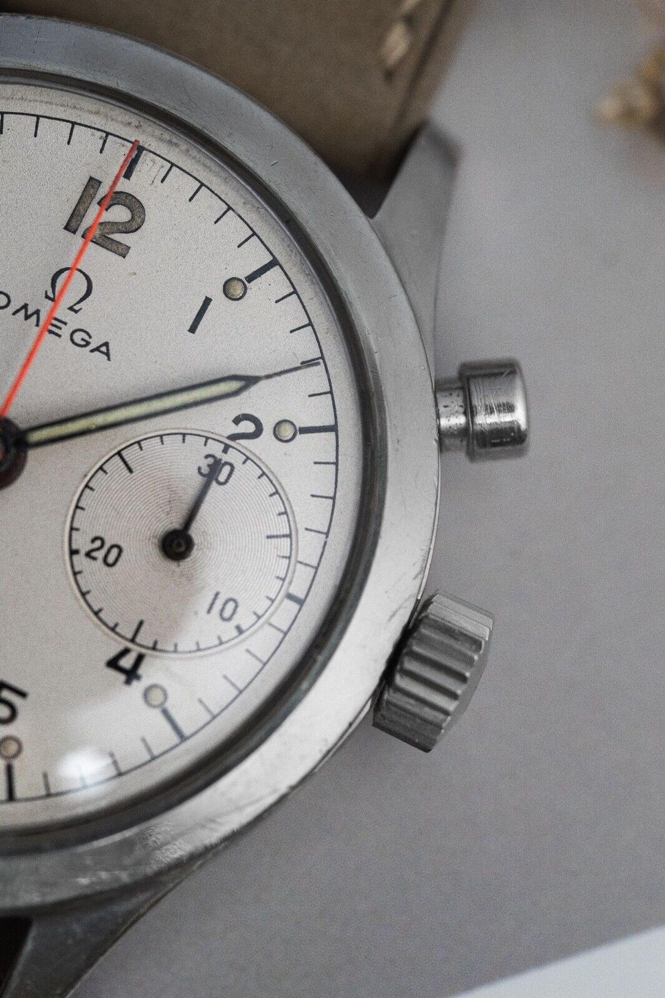 Designed for the rigors of military service, this chronograph bears witness to an era where precision timing was paramount. The single button mechanism, a hallmark of early chronographs, provides a unique functionality that is both simple and efficient, capturing the spirit of innovation that Omega is renowned for. The watch's robust design, featuring a classic round case and easy-to-read dial, speaks to its utilitarian origins while offering timeless style.