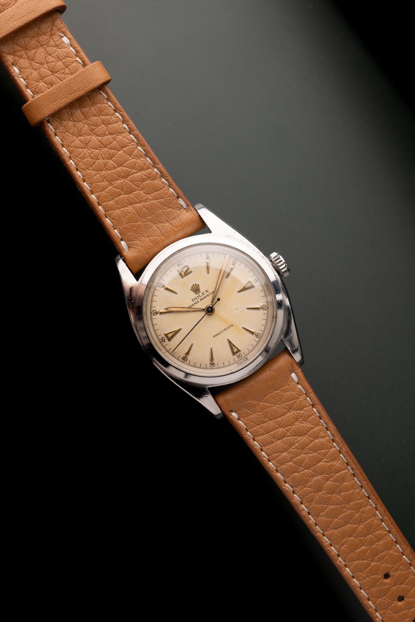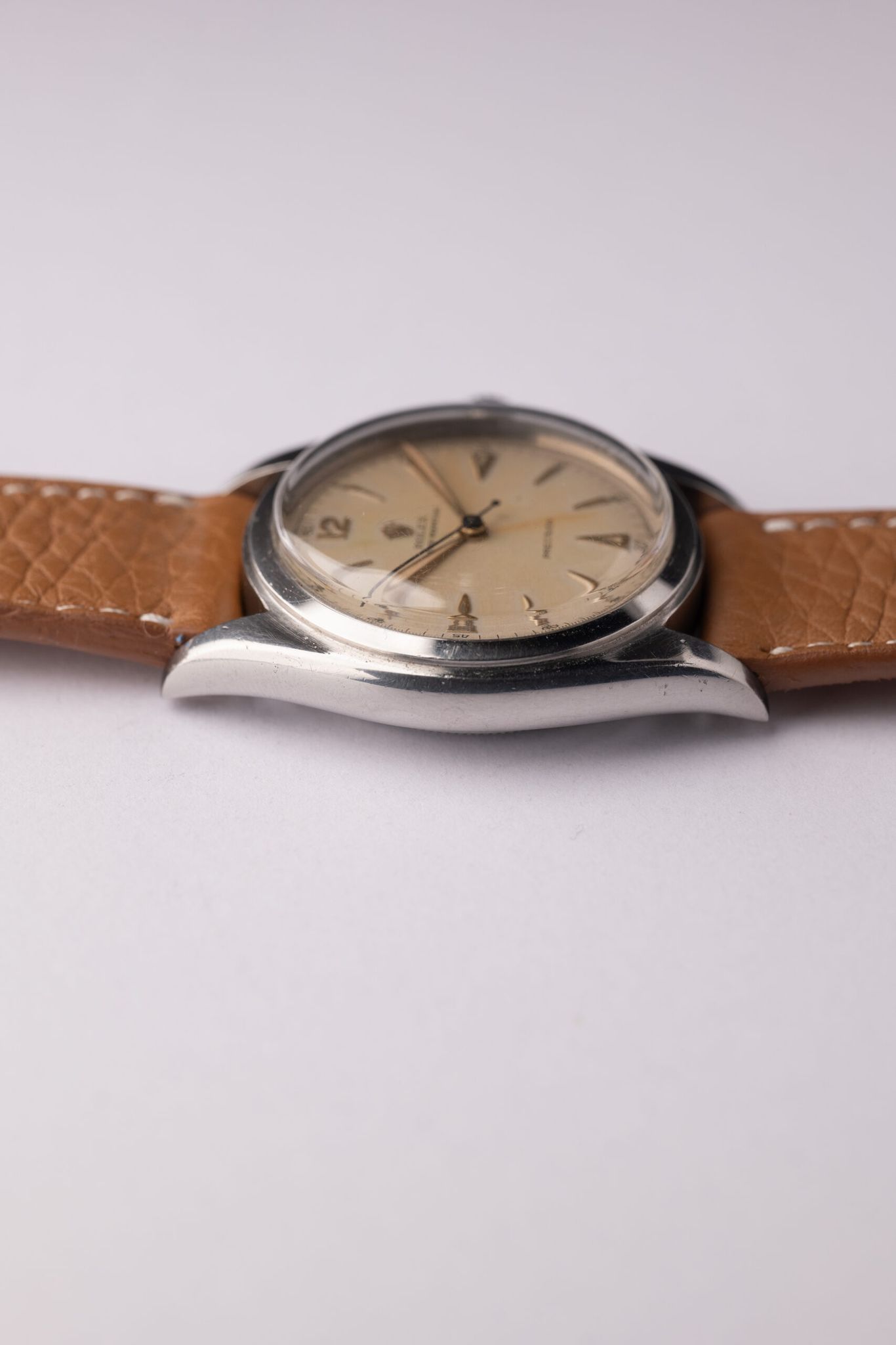 This 6098’s unique military hands have burned radium directly onto the dial where they once went unmoved. This quirk is something only students of vintage may appreciate.