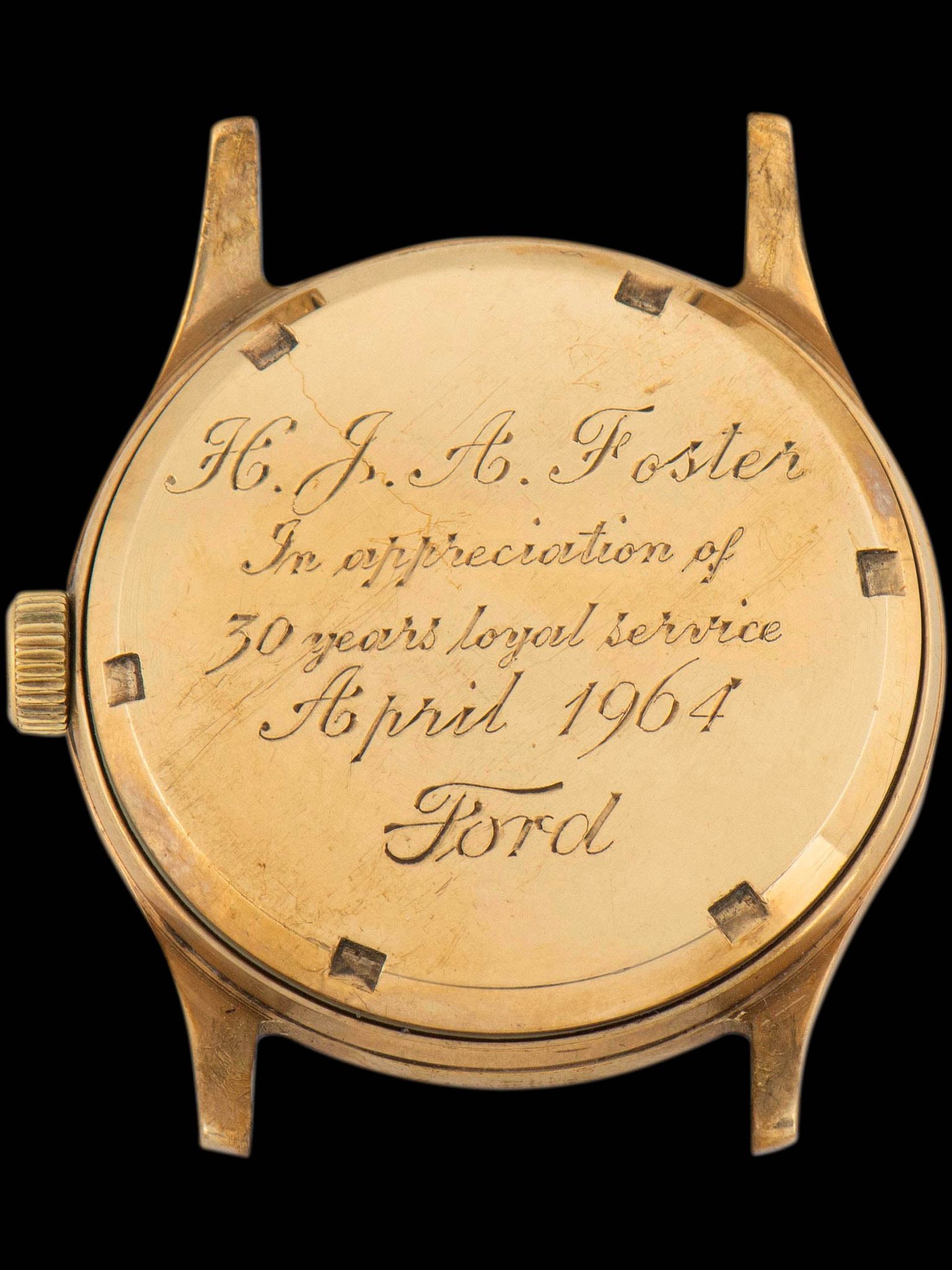 The strong and symmetrical 9k yellow gold case is in incredible condition, especially considering its age. It appears to remain unpolished and shows only minor signs of use. The unsigned gold crown is believed to be original to the watch. The screw-down case back is in excellent shape, featuring only minor wear and a custom inscription that reads, "H.J.A. Foster. In appreciation of 30 years of loyal service. April 1964. Ford." The watch will come supplied on a two-piece handmade leather strap.