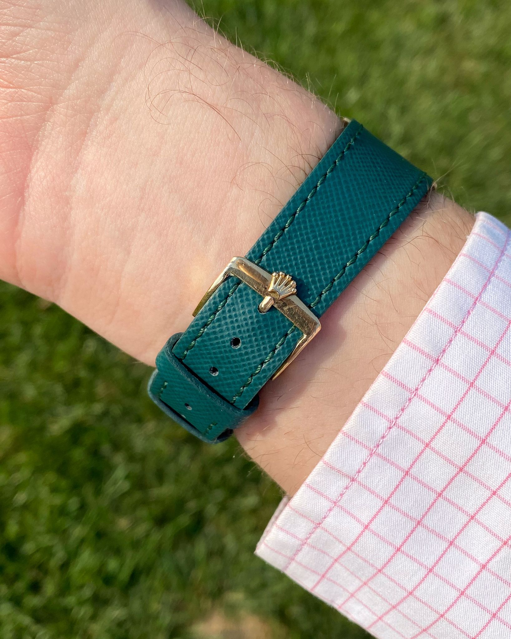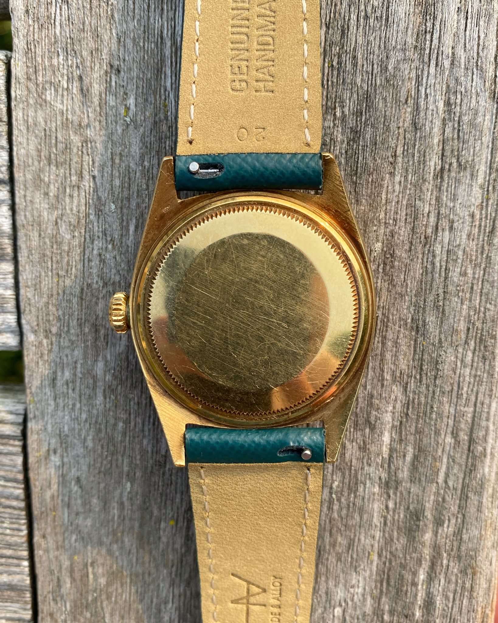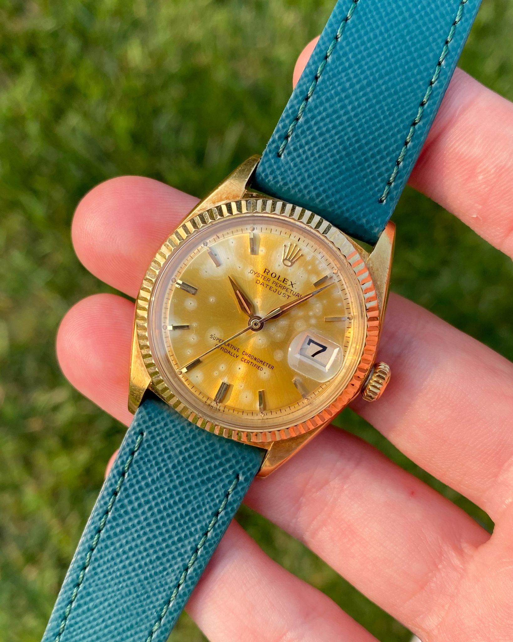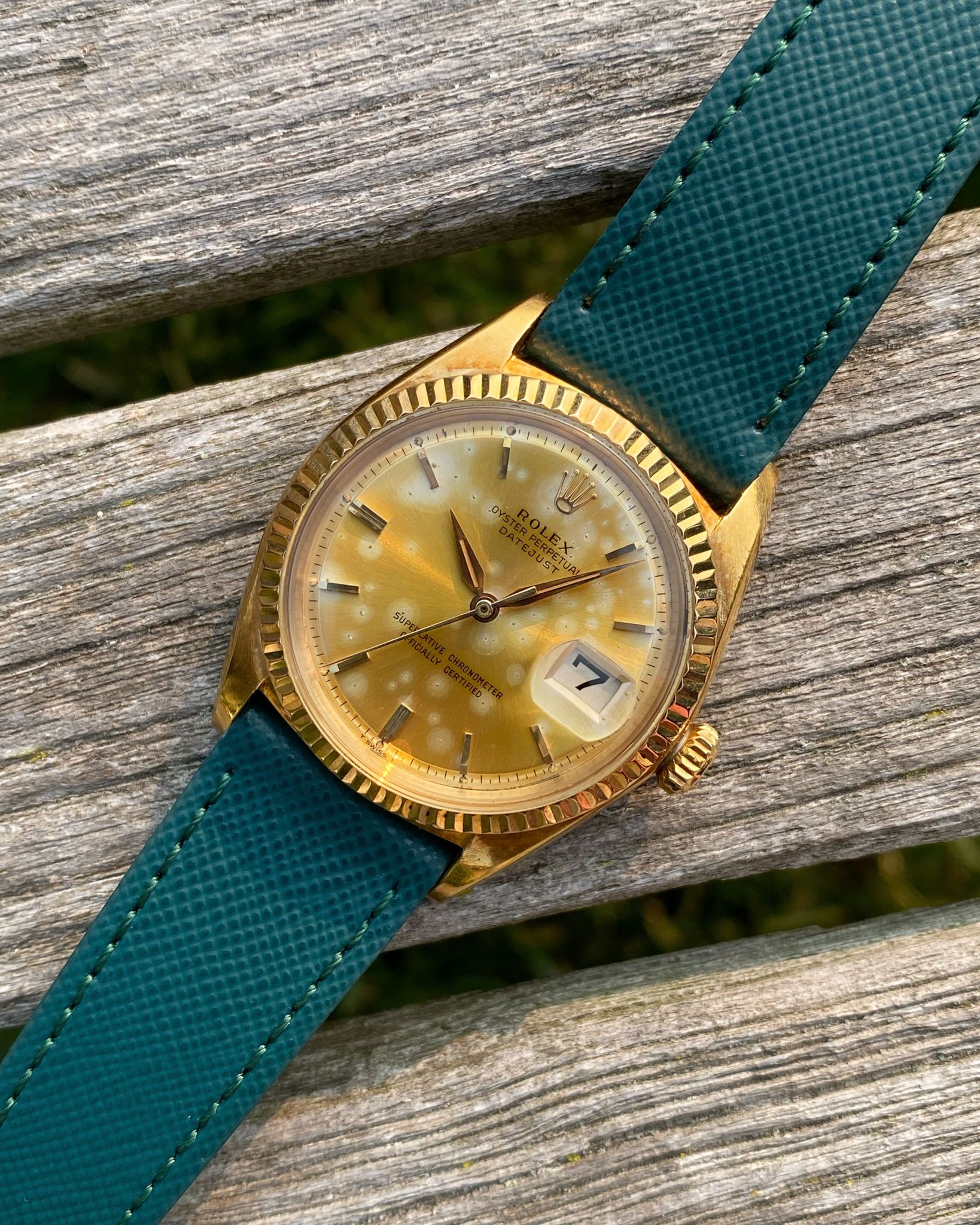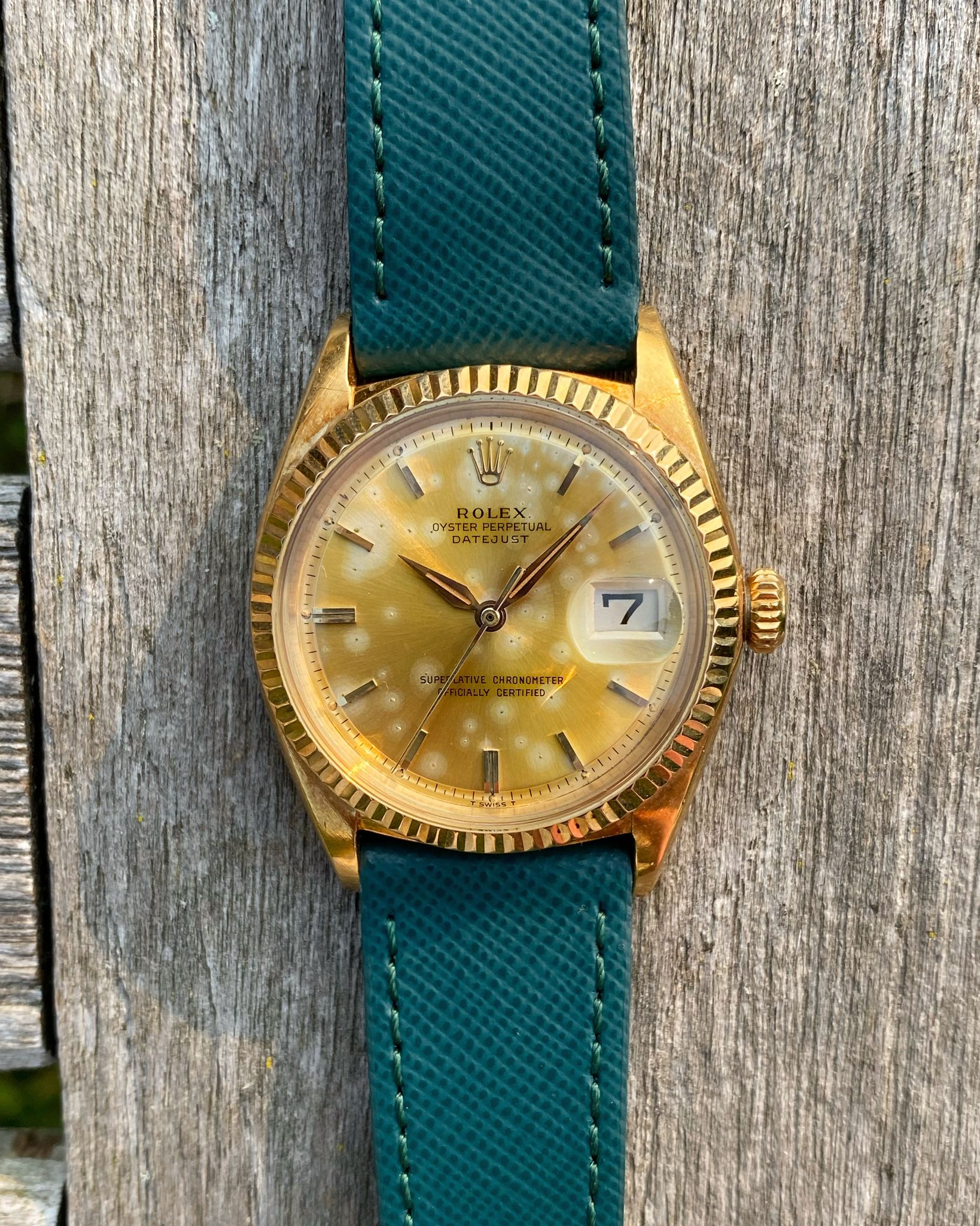 The Rolex features a yellow gold case with a fluted gold bezel, which have acquired a lovely, even, ‘rosy’ colored oxidation with age. The Datejust is mounted on an unworn, quick-release, Dark Teal Saffiano leather strap from Hide & Alloy, which is secured by a vintage gold tone Rolex tang buckle. The Rolex retains its original Pie-Pan dial and gold “Dauphine” hands. The Pie-Pan dial has developed a vivid patina over time, appearing mostly champagne-colored with sporadic silver spots. The tritium lume plots and hands have acquired an orangish-gold patina with age. The movement used in the 1601 is the Rolex Caliber 1560, which is running smoothly.