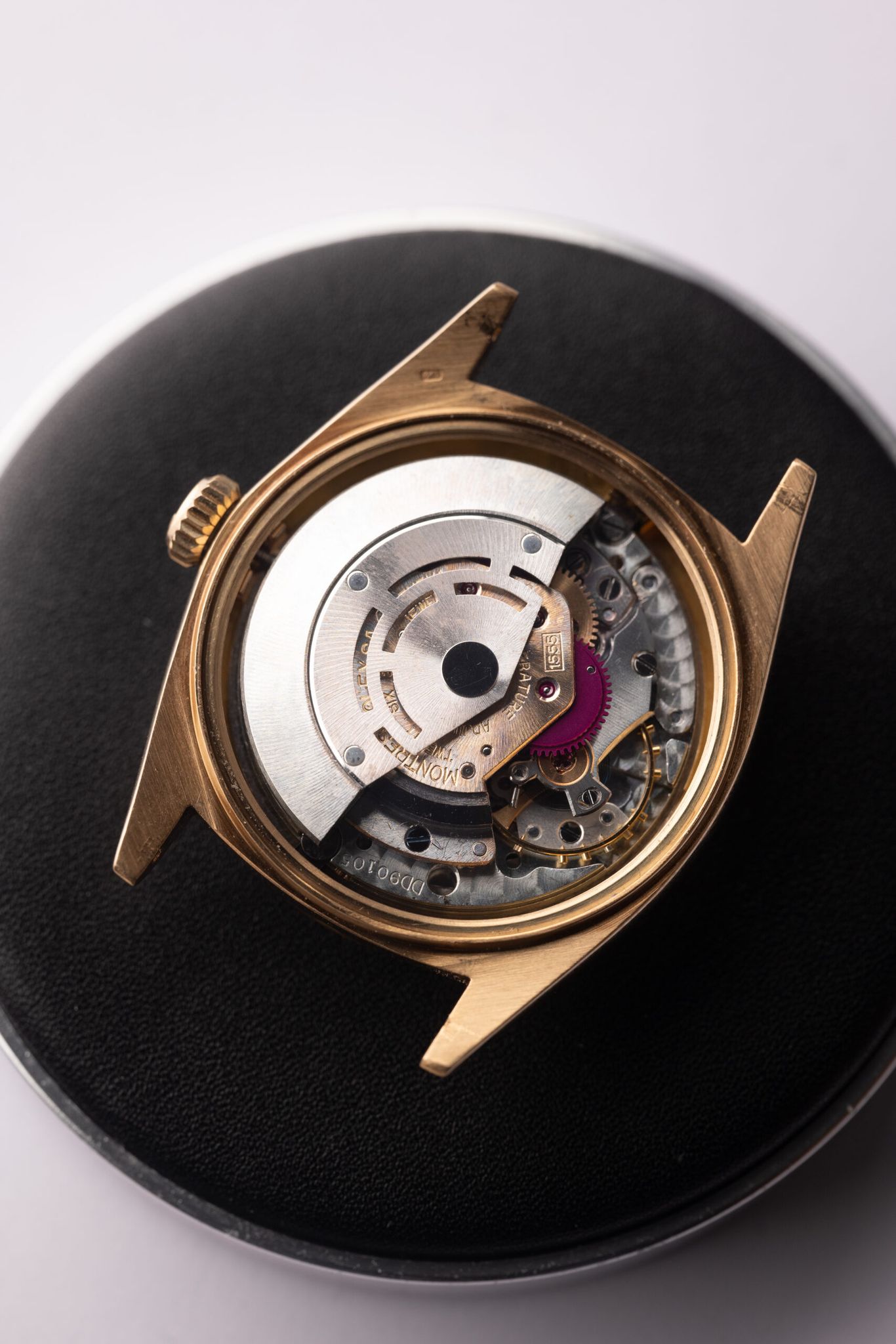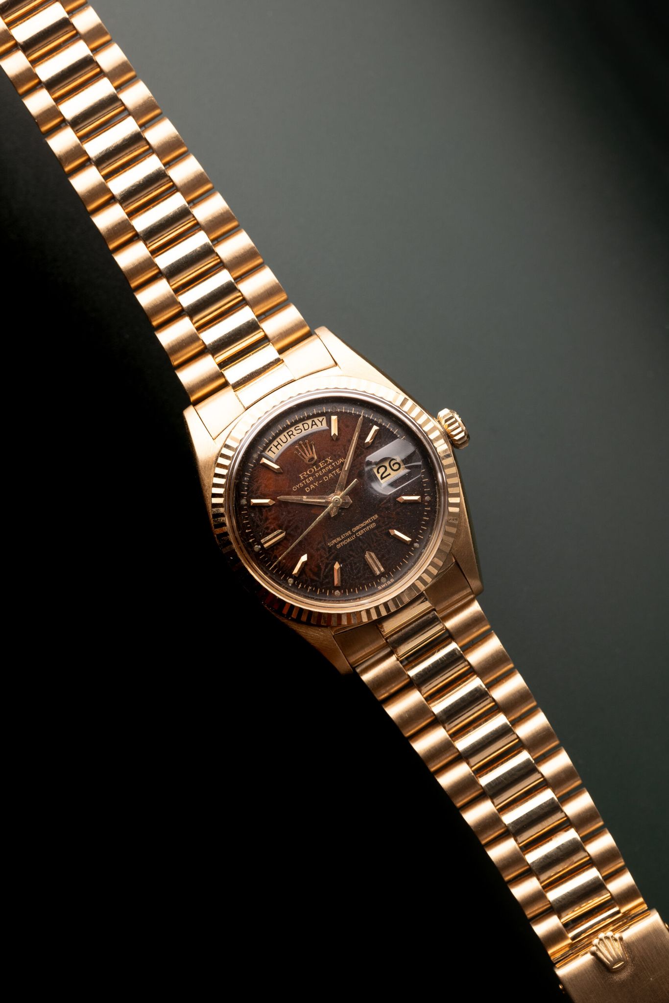 The Day-Date was the pinnacle of the Rolex line up during the mid-century, and still leads the brand in the luxury dress watch segment. This early tropical Day-Date has the most amazing gold tropical dial. Towards the outer circumference of the dial there appears to be geometric lines forming a pattern which further enhances its uniqueness. case has previously been polished but appears thick and uniform.