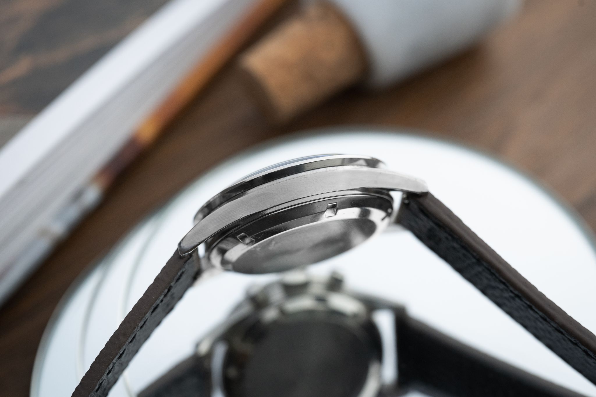 Adorning this 105003 is a bespoke leather band, carefully chosen to complement the watch’s vintage aesthetic while offering modern comfort and style. At its heart lies the sought-after Dot Over Ninety (DON) bezel, a feature avid collectors instantly recognize as a hallmark of originality. This bezel is in impeccable vintage condition and displays a graceful greyish fade, creating a richly textured visual appeal that speaks to its storied past. Adding to its allure, the dial remains immaculate, showcasing a beautiful warm patina on the lume of the markers and hands. These subtle yet captivating details lend character and depth, reflecting the passage of time and absolute care with which this watch has been preserved.