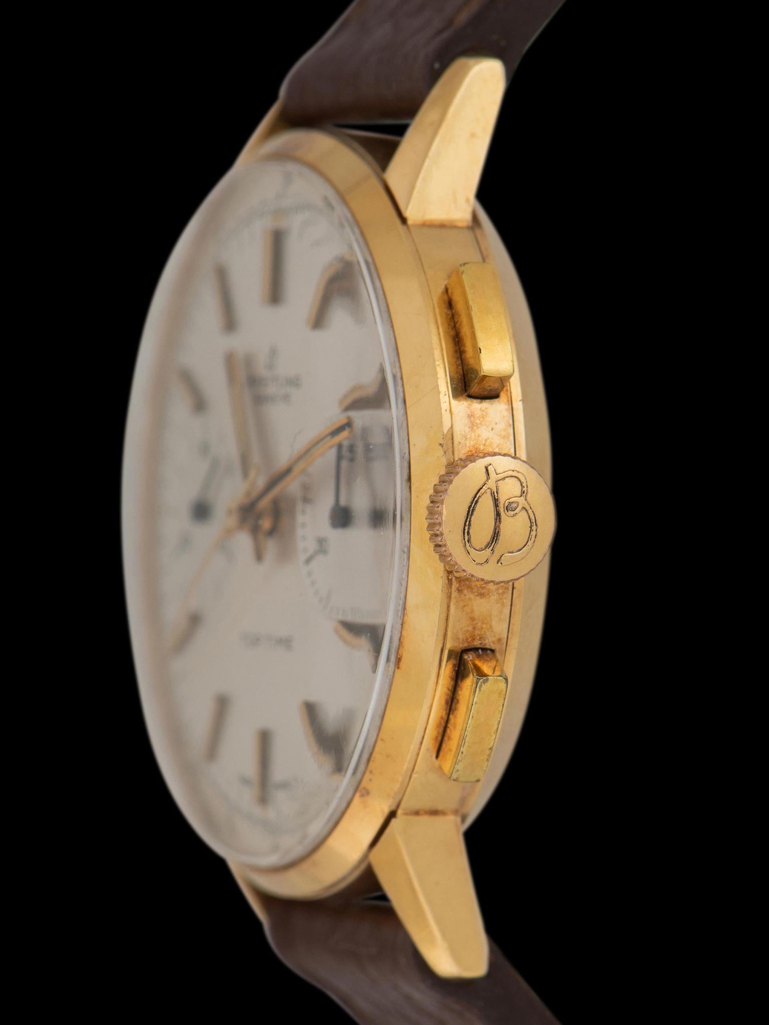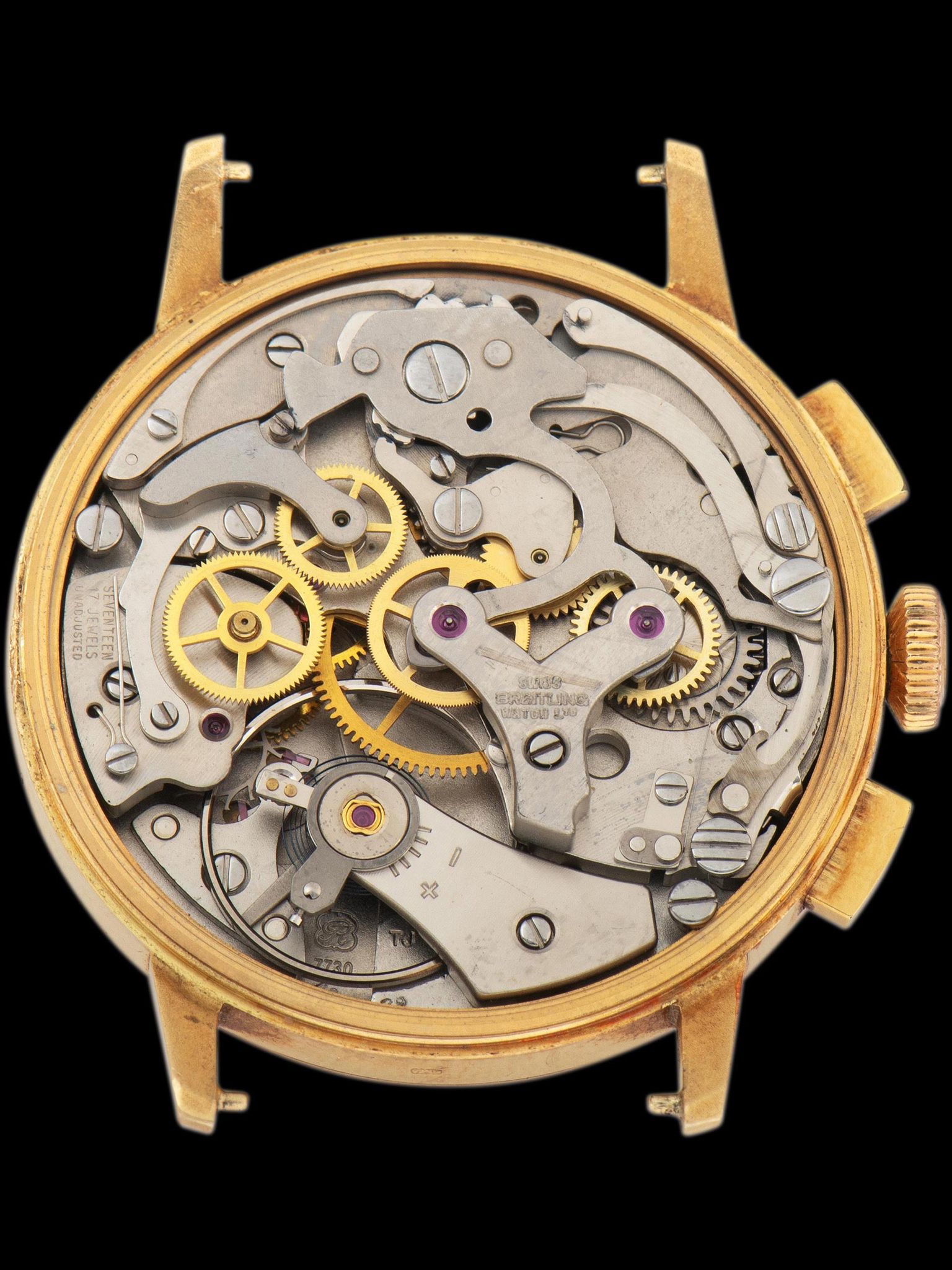 The beautiful 18K yellow gold case is in excellent condition, exhibiting only light signs of use and no notable evidence of being previously polished. The case retains its original flat pump pushers and Breitling signed crown. The case back is in great condition as well, retaining all of its factory markings and hallmarks. The watch will come supplied on a two-piece handmade leather strap.