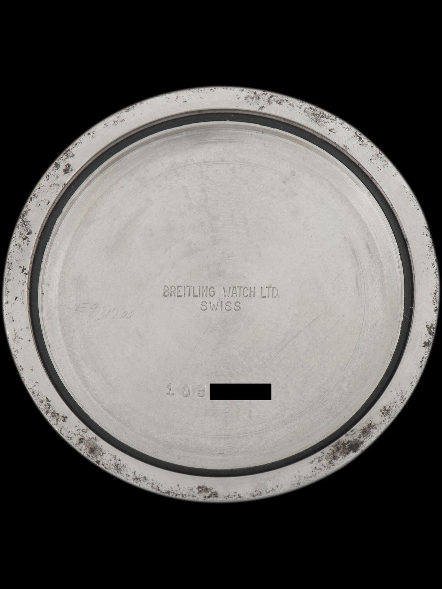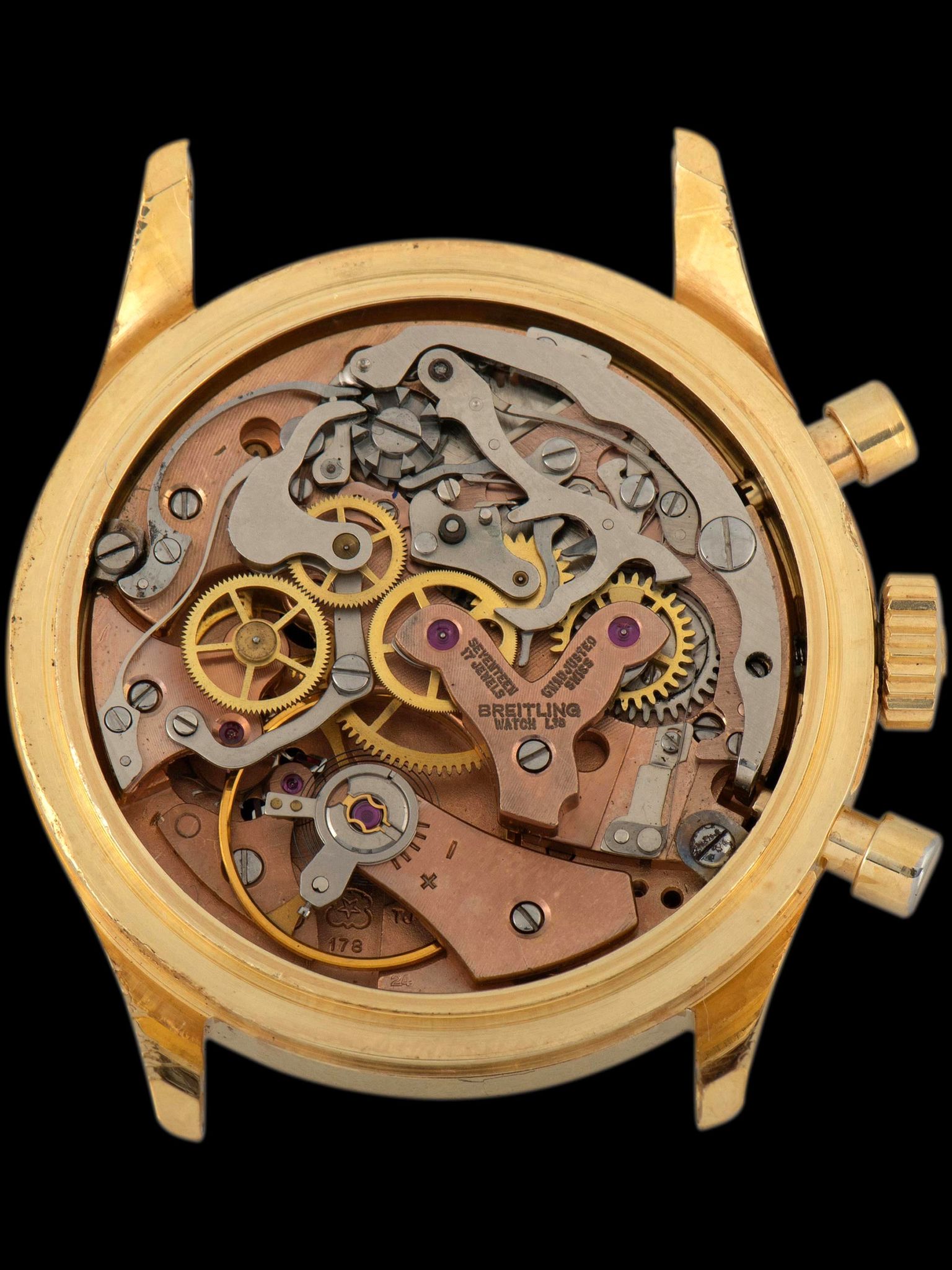 The large gold-plated case featuring curved lugs remains in incredibly crisp condition with very sharp chamfers present. The case does exhibit some general wear throughout, though the most notable wear is mostly not visible, as it is located on the undersides of the lugs. The case retains its original pump pushers and Breitling signed crown. The case back retains all of its factory markings in fully present condition. The watch comes supplied on a 2pc leather strap.