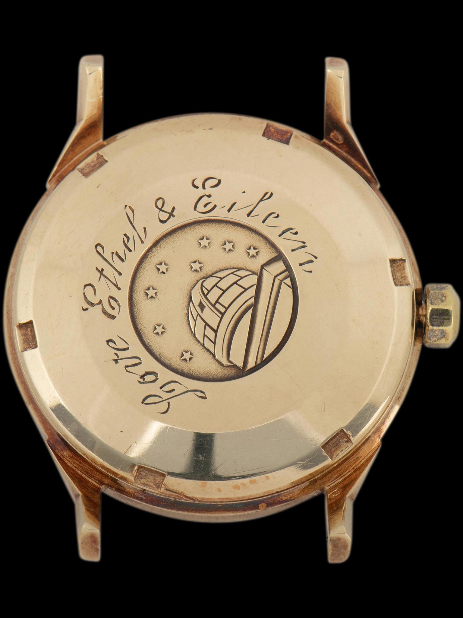 The luxurious and stylish 14K yellow gold case is in beautiful condition, showing evidence of being polished very minimally in its past as the original case geometry and finishing are strong throughout. The case has developed a lovely rose patina throughout, especially on the hight contact portions of the case. The case retains its original yellow gold Omega-signed crown. The case back is in exceptional condition, showing minimal signs of use with the Omega Constellation Observatory medallion in very crisp condition, the case back also features an engraving that reads "Love Ethel & Eileen". The watch comes supplied on a 2pc handmade leather strap.