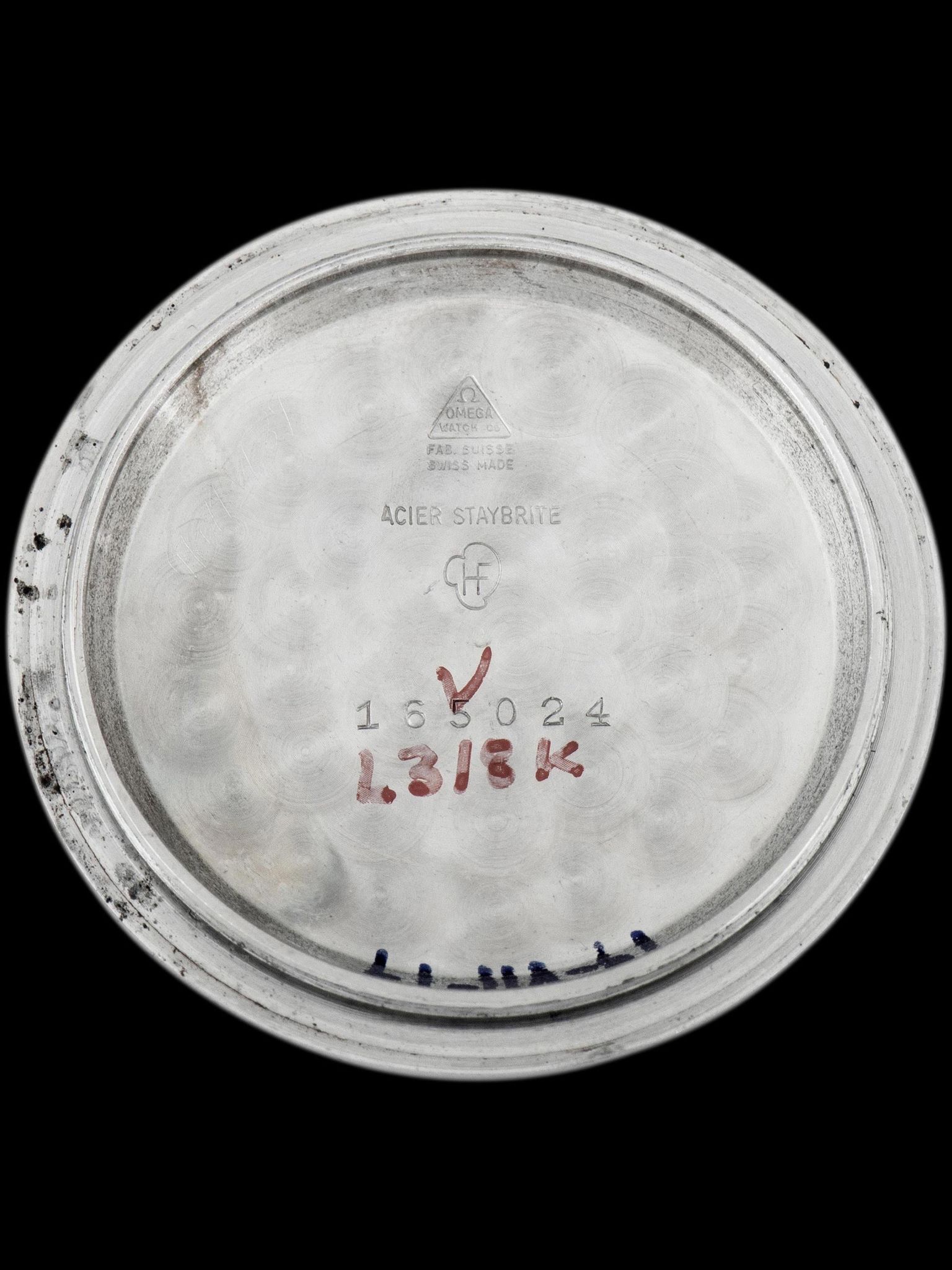 The excellent and iconic asymmetrical twisted lug case features light signs of honest use with minimal evidence of being previously polished. The Omega signed crown is an early OEM service unit. The original bakelite "flat 1" bezel is in stunning condition, showing no cracks and very gentle wear. The case back retains the original factory engravings and shows some honest wear and tool marks. The watch will come supplied on a 2pc handmade leather strap.