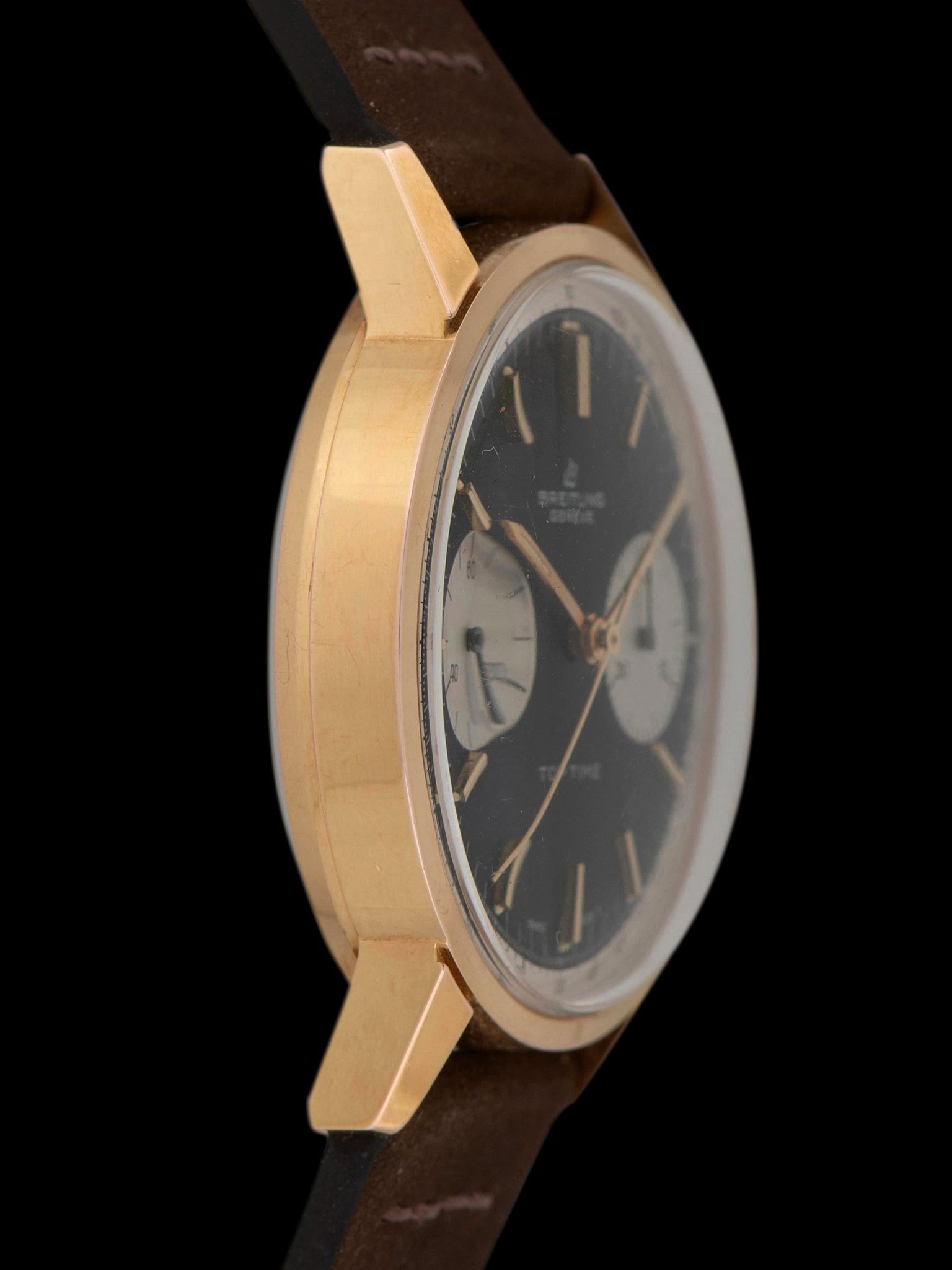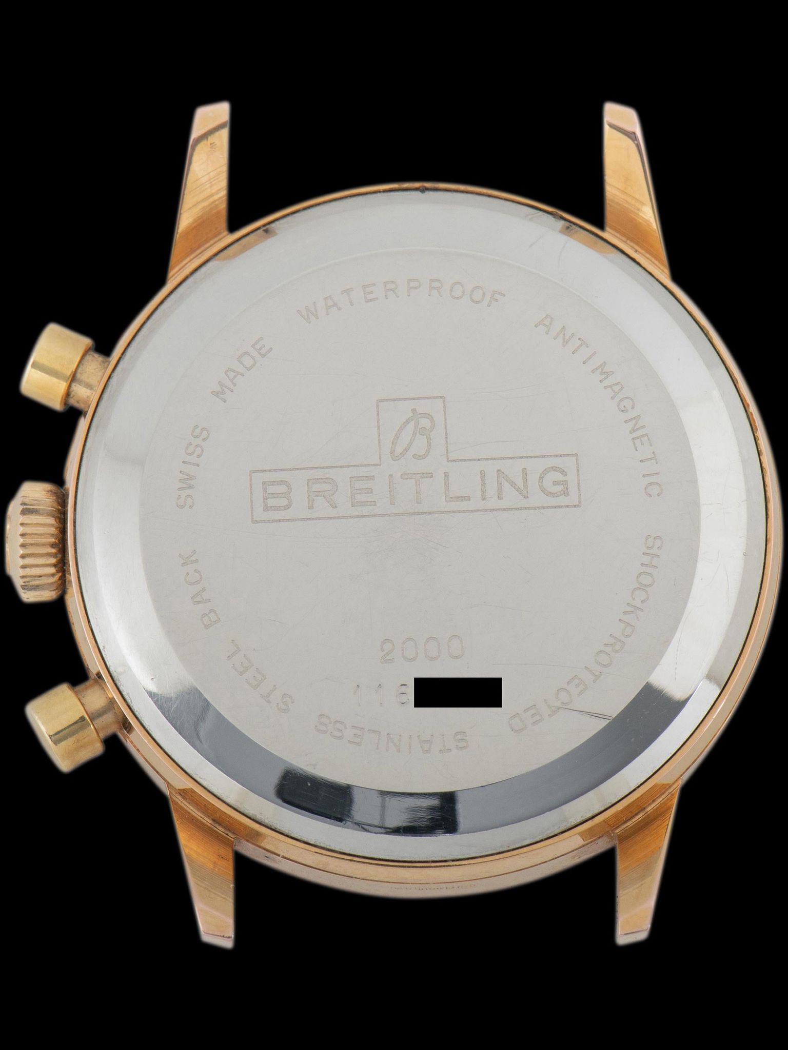 The stunning gold-plated case is believed to remain unpolished with strong factory dimensions and clean angles with light signs of use. The case retains its original gold-plated pump pushers and Breitling signed crown. The case back is in great condition as well, retaining all of its factory markings with light wear from use. The watch will come supplied on a two-piece handmade leather strap.
