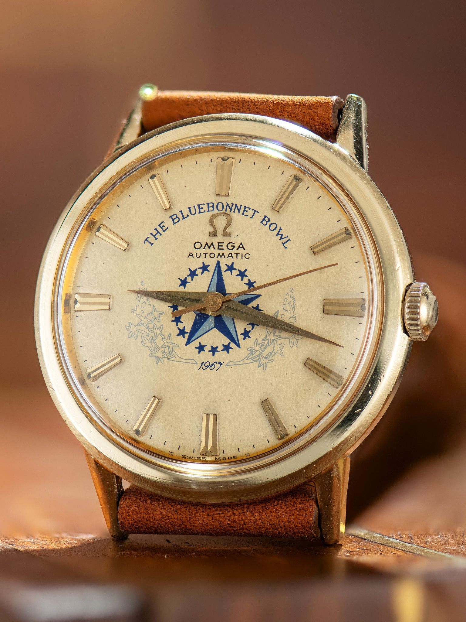 Its 34mm yellow gold-filled case and long, straight lugs give the piece that iconic midcentury Omega vibe, making it both relevant and a suitable option in any environment. But what really sets this one apart from the rest is the aged silver dial, which features the words "The Bluebonnet Bowl" across the top and the bowl's logo—a blue star with white leafing underneath separated by the year, 1967.